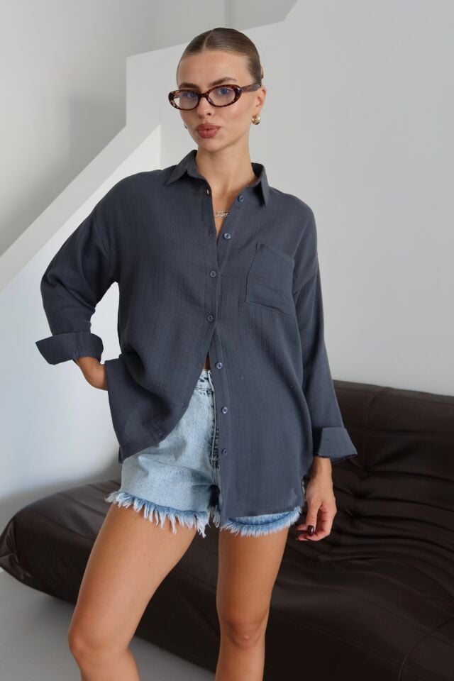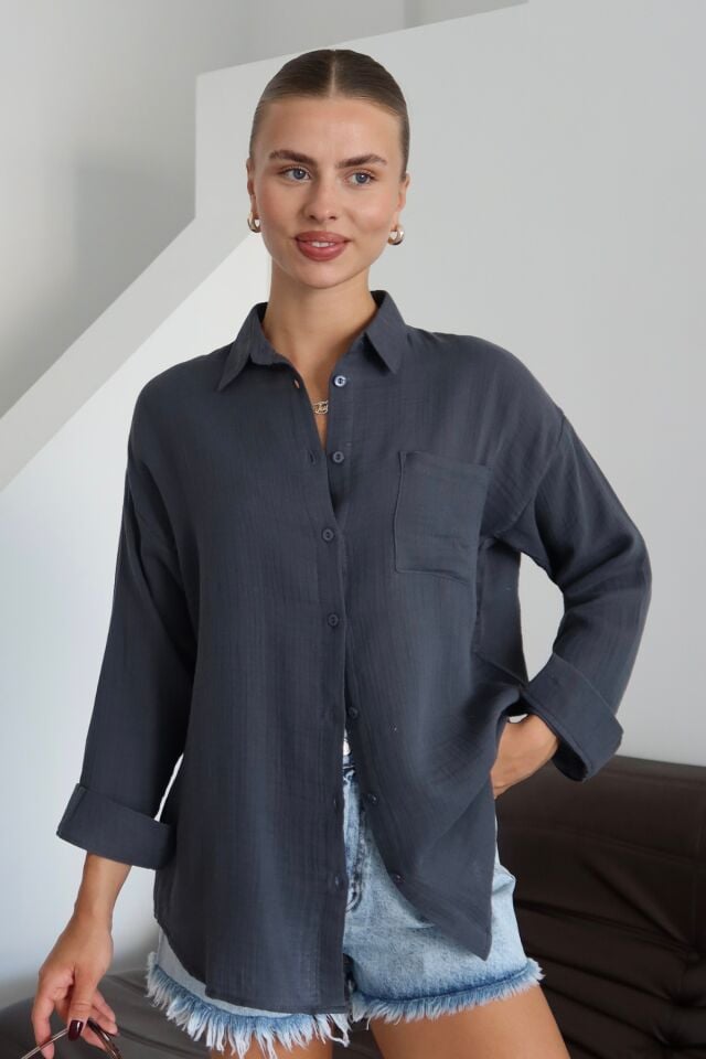 Balenbi Kadın Cepli Oversize Düz Renk Müslin Gömlek 1095 M - Antrasit