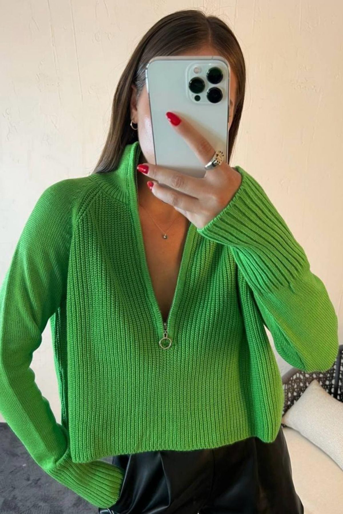 Balenbi 1029 Benetton Fermuarlı Yarım Balıkçı Kısa Oversize Kadın Triko Kazak Standart - Yeşil