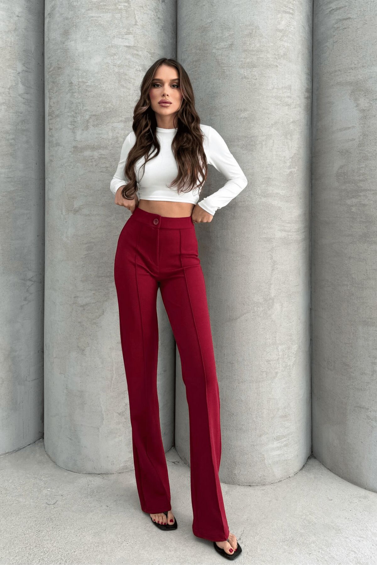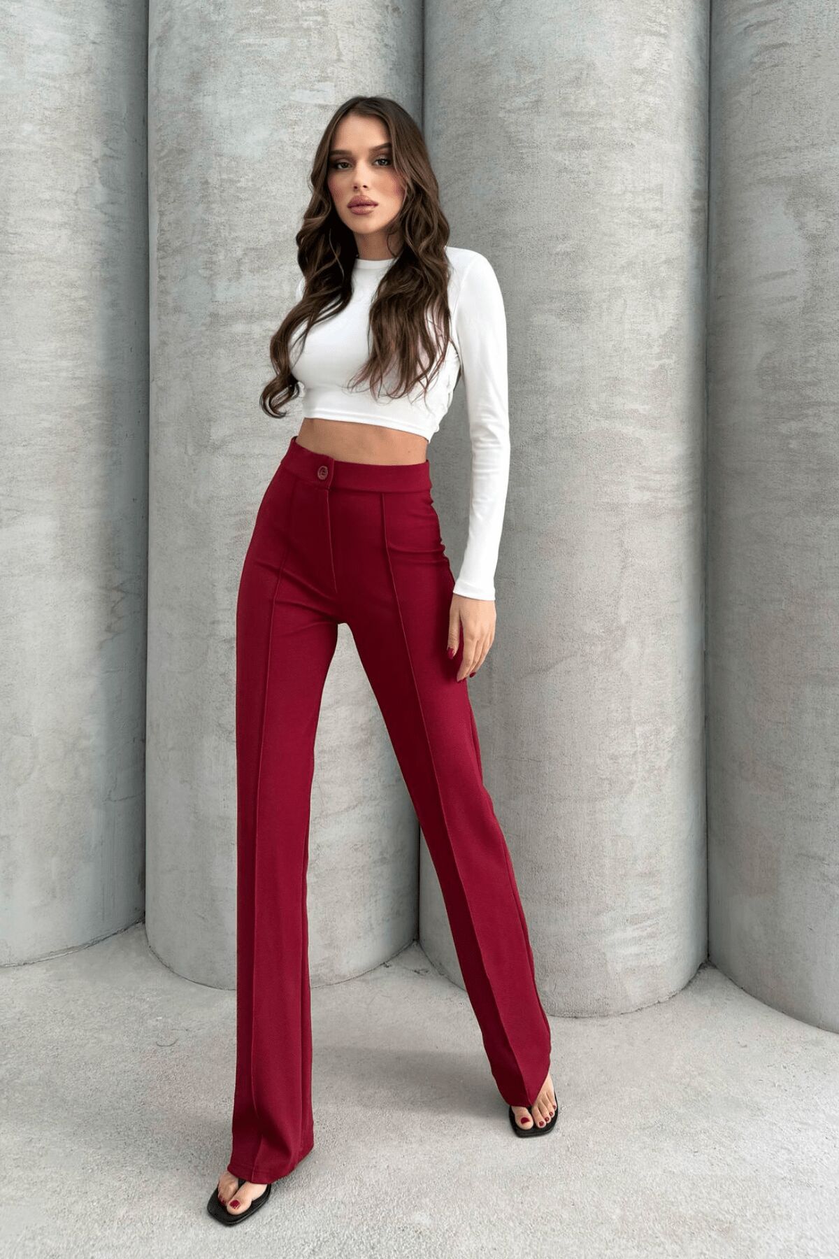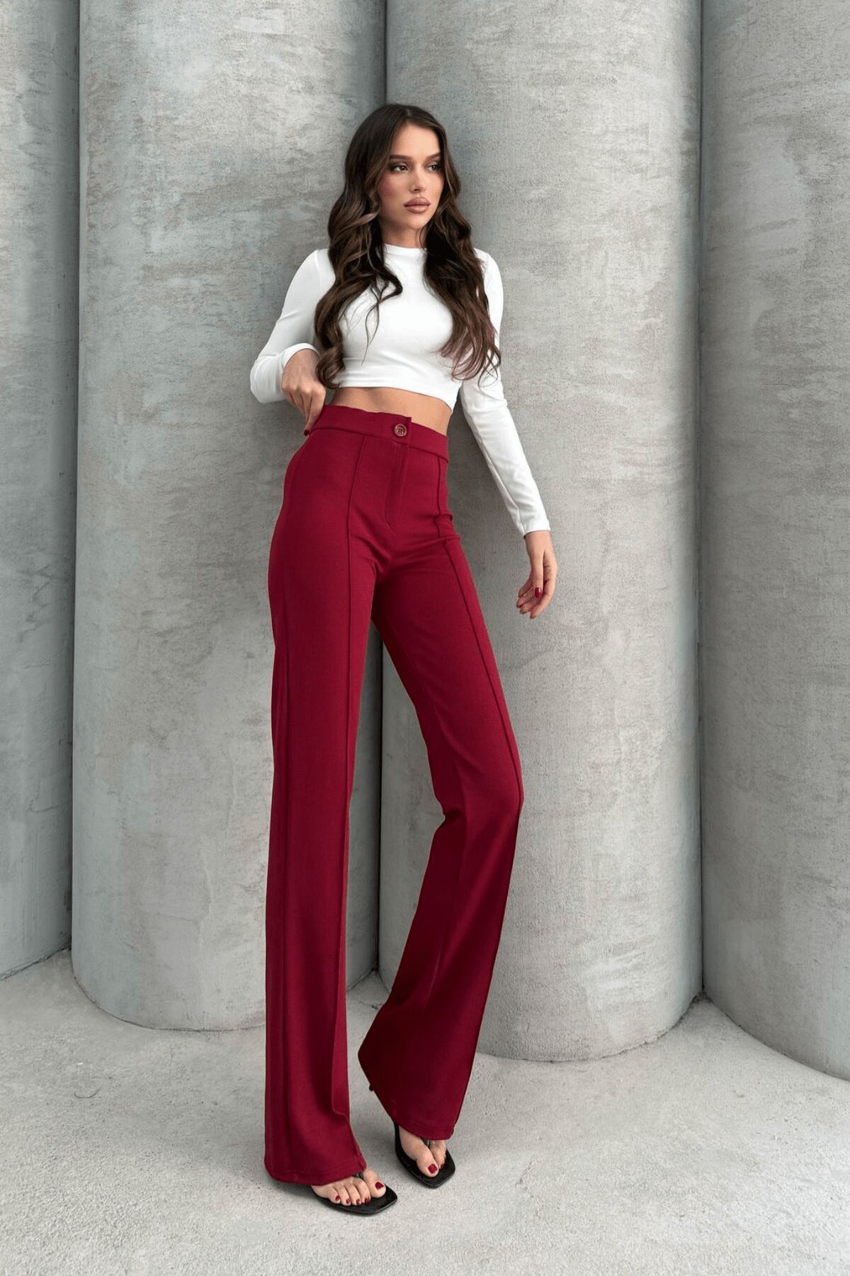 Balenbi 1079 Kadın Bej Yüksek Bel Toparlayıcı Ispanyol Paça Palazzo Pantolon 40 - Bordo