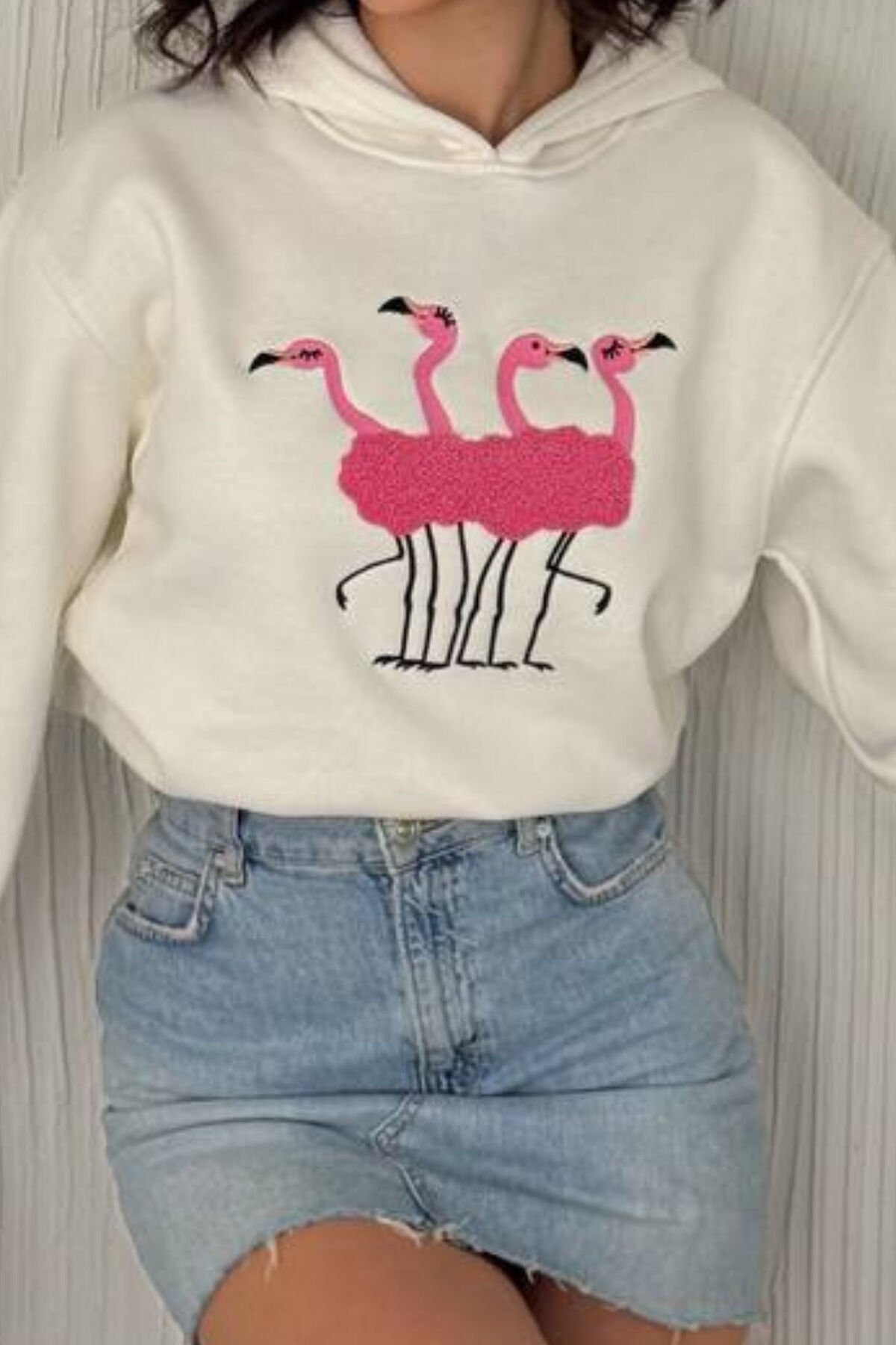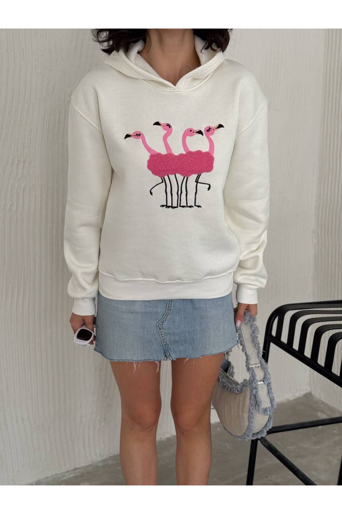 Balenbi 3 İplik İçi Polarlı Flamingo Nakışlı Kapüşonlu Sweatshirt 1159 L - Ekru