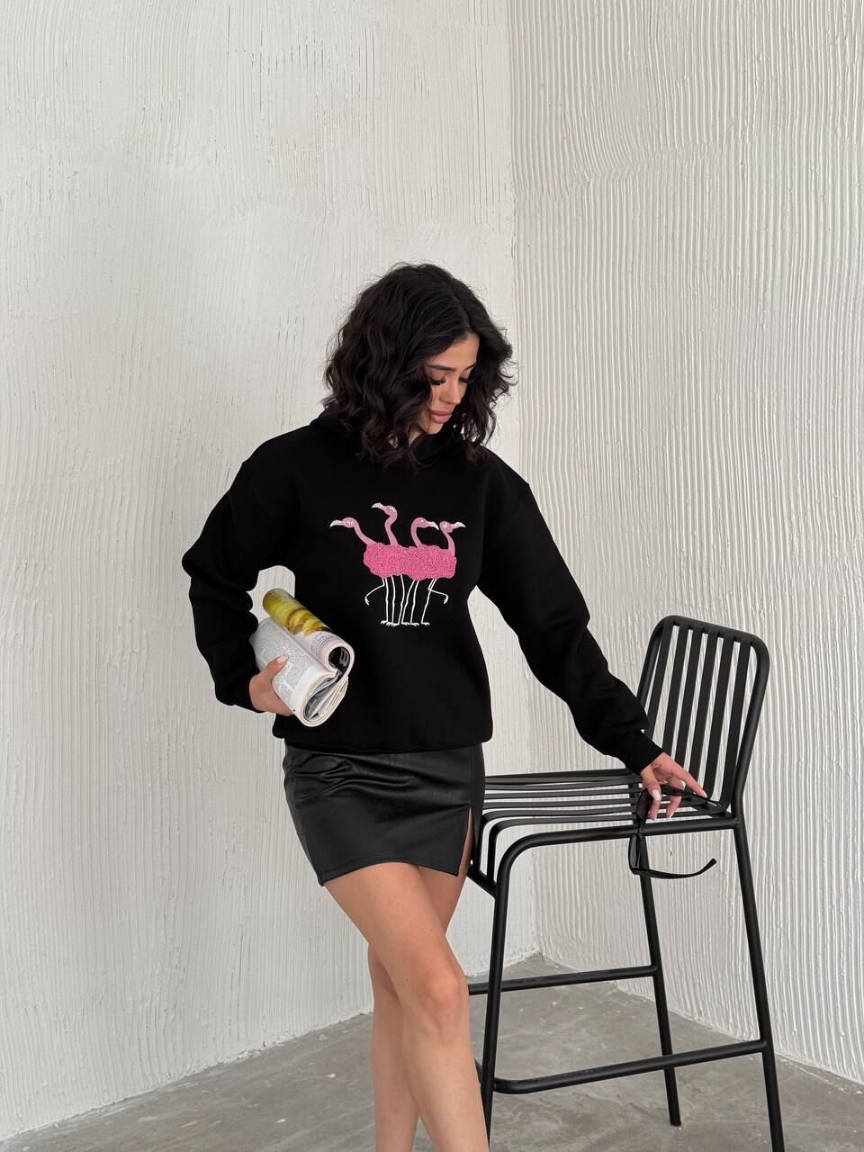 Balenbi 3 İplik İçi Polarlı Flamingo Nakışlı Kapüşonlu Sweatshirt 1159 M - Siyah
