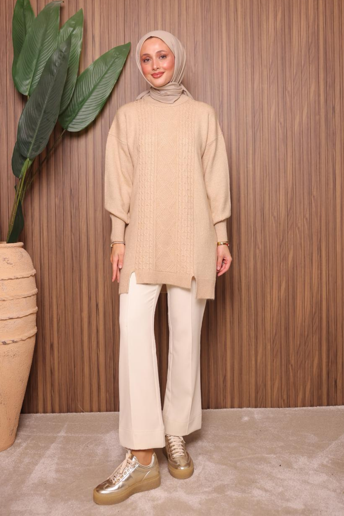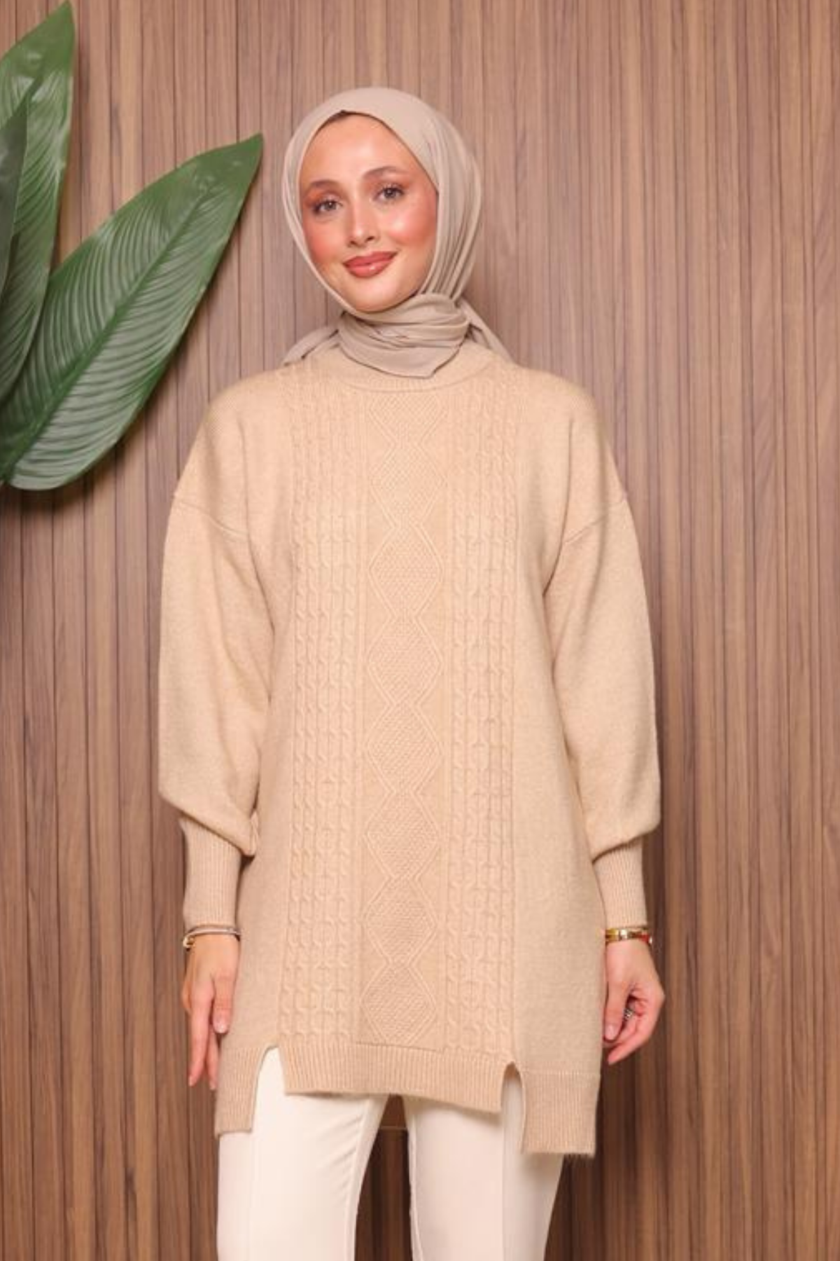 Balenbi Baklava Desenli Yumoş Tesettür Triko Tunik 7032 Standart - Bej