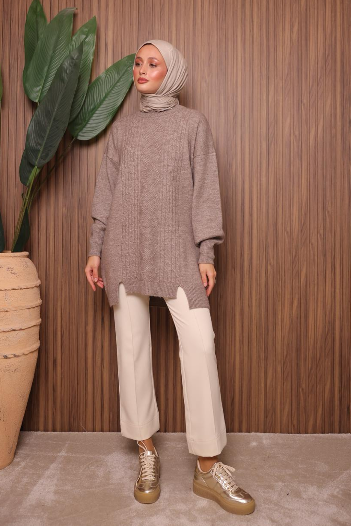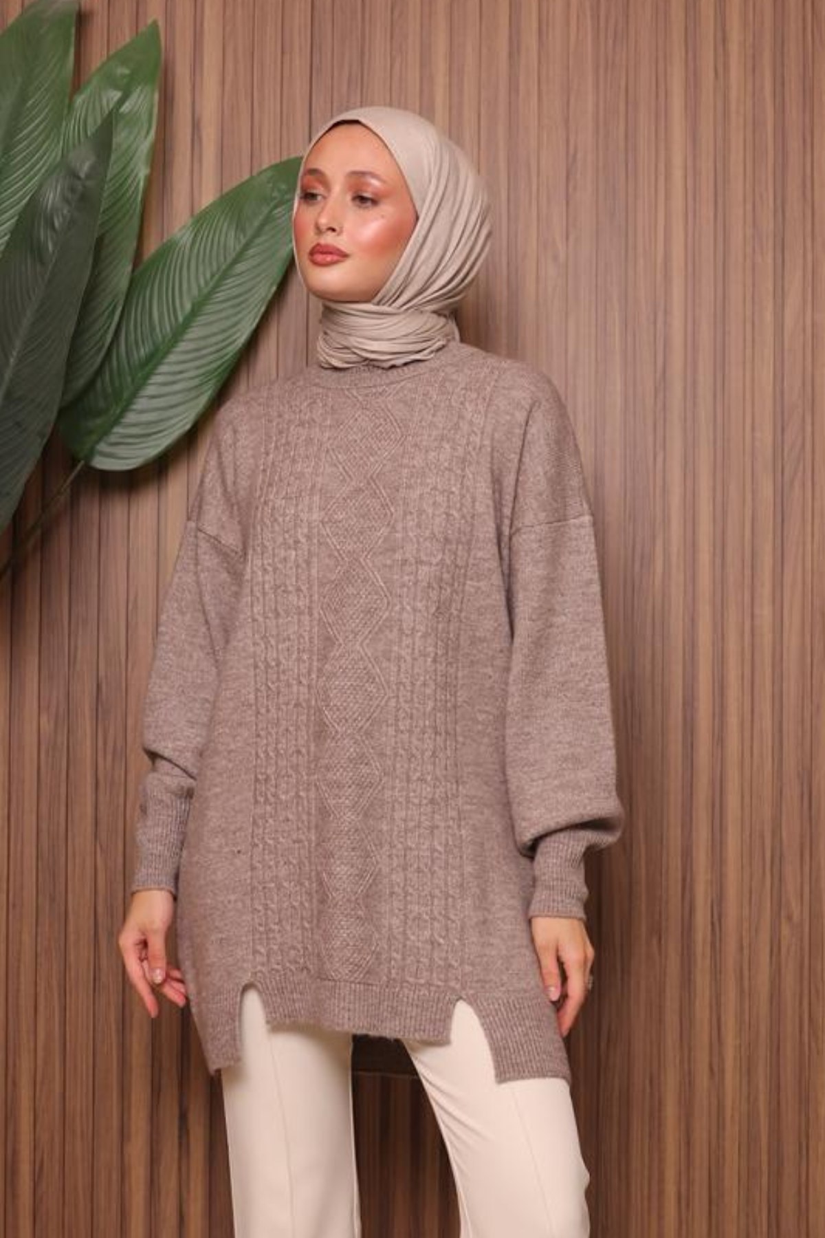 Balenbi Baklava Desenli Yumoş Tesettür Triko Tunik 7032 Standart - Toprak