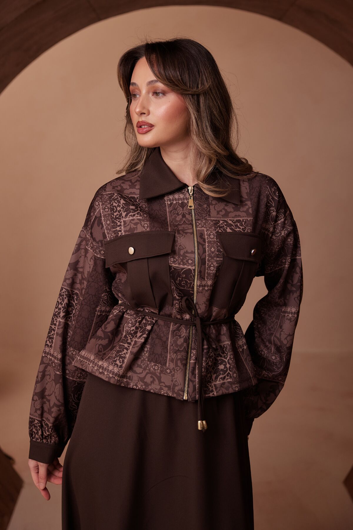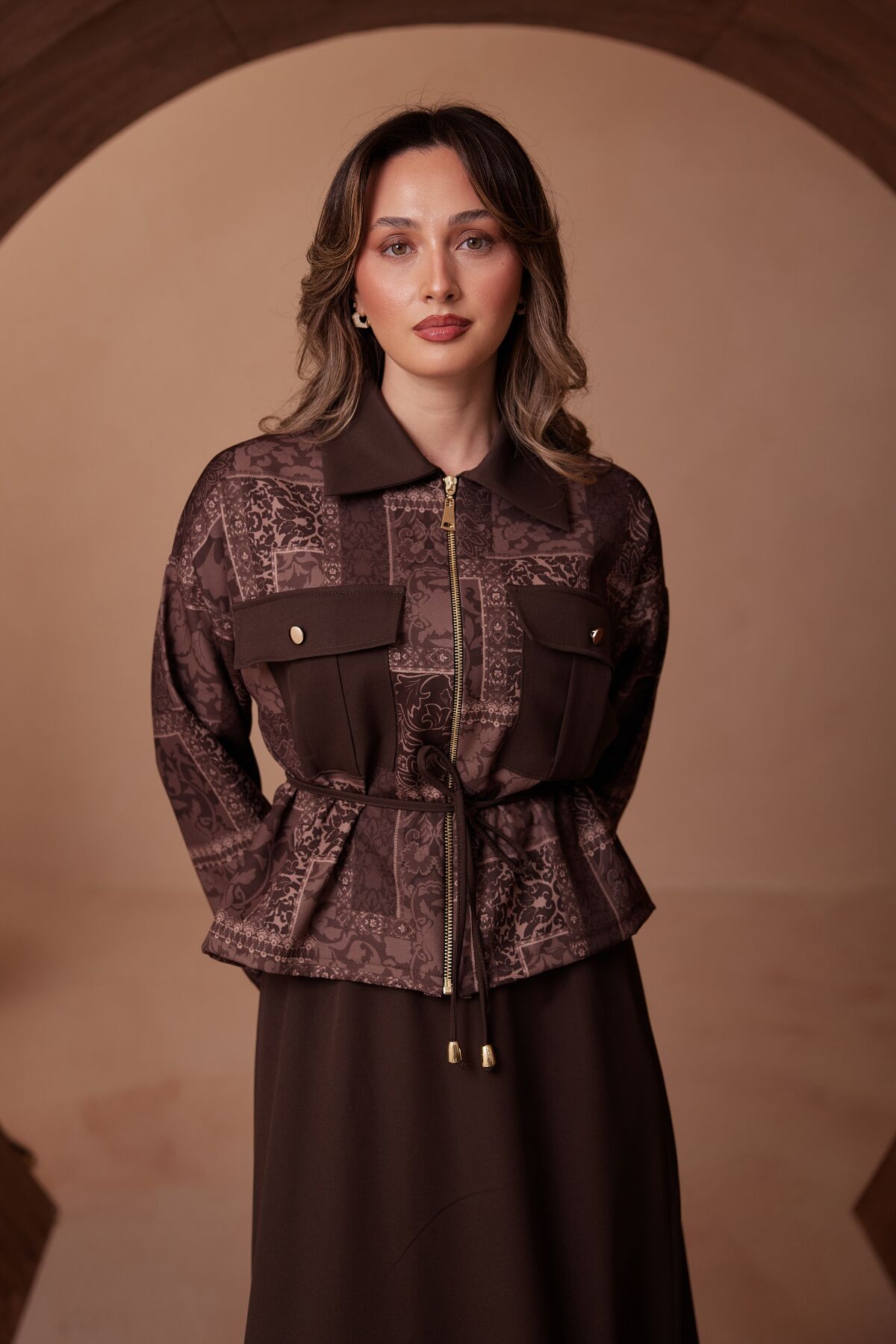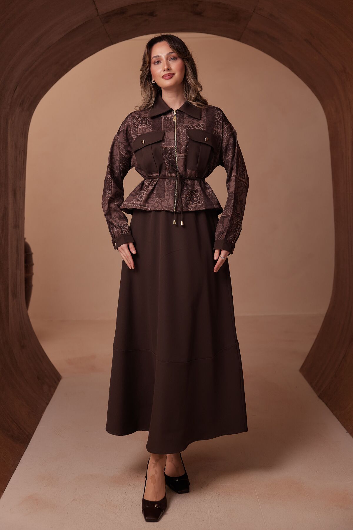 Balenbi Desen Kombinli Fermuarlı Gömlek Yaka Double Krep Etekli Tesettür Takım 1185 S/M - Kahverengi