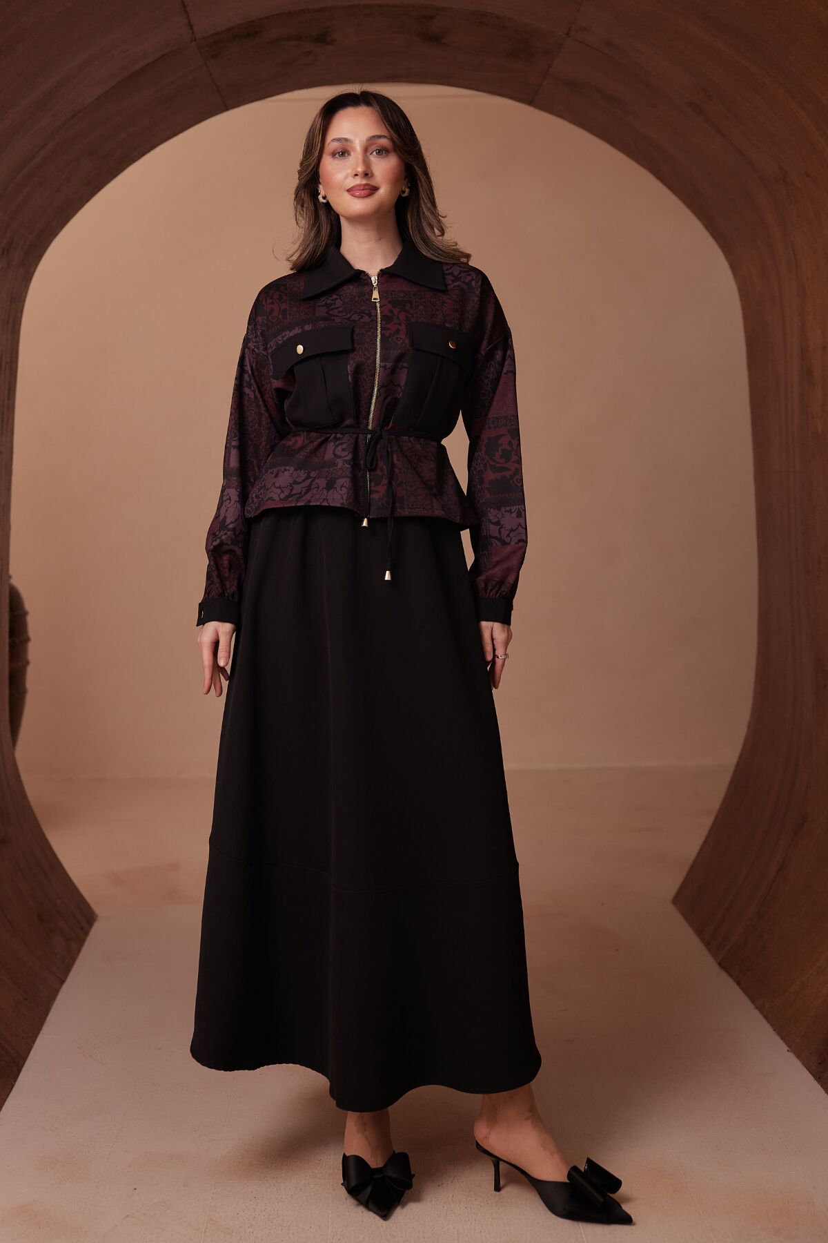 Balenbi Desen Kombinli Fermuarlı Gömlek Yaka Double Krep Etekli Tesettür Takım 1185