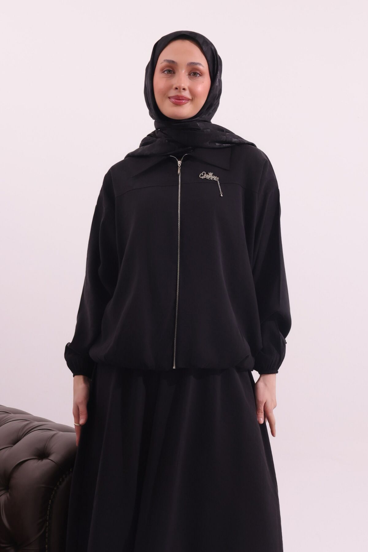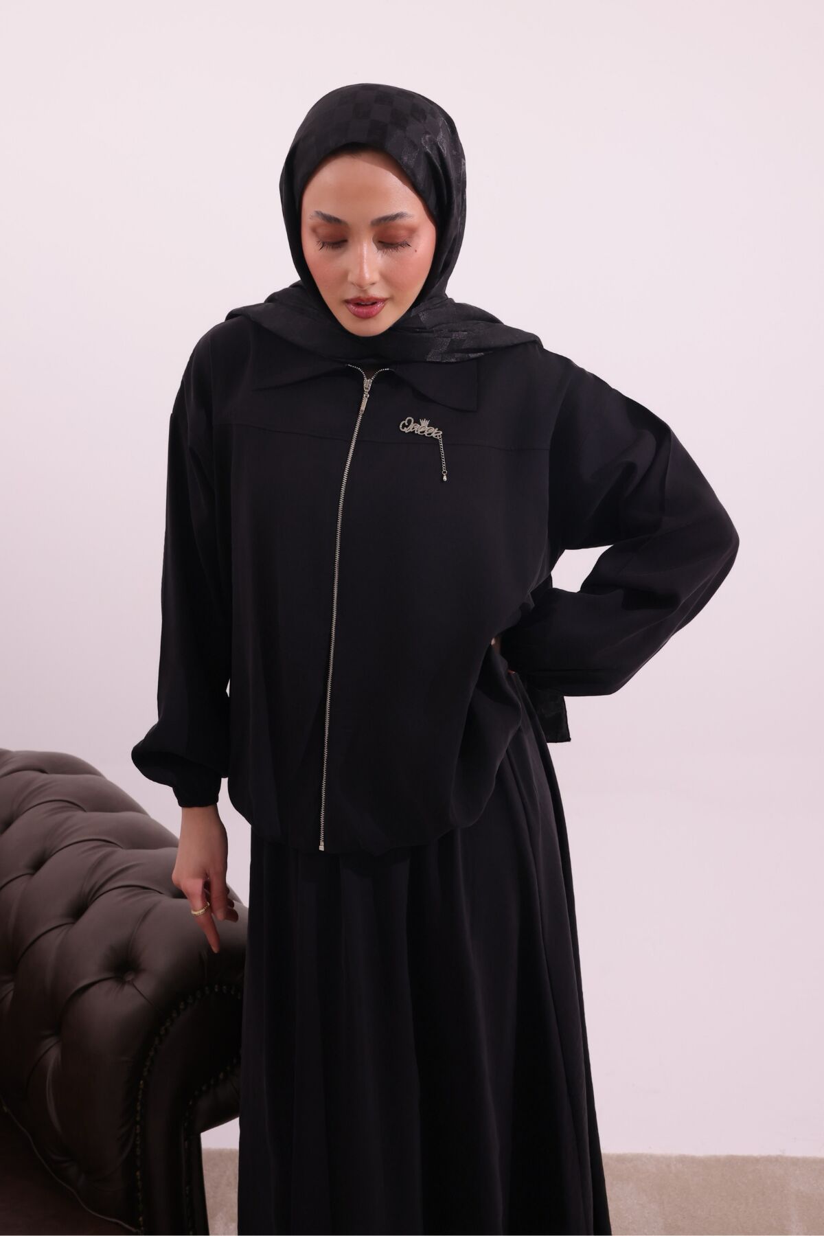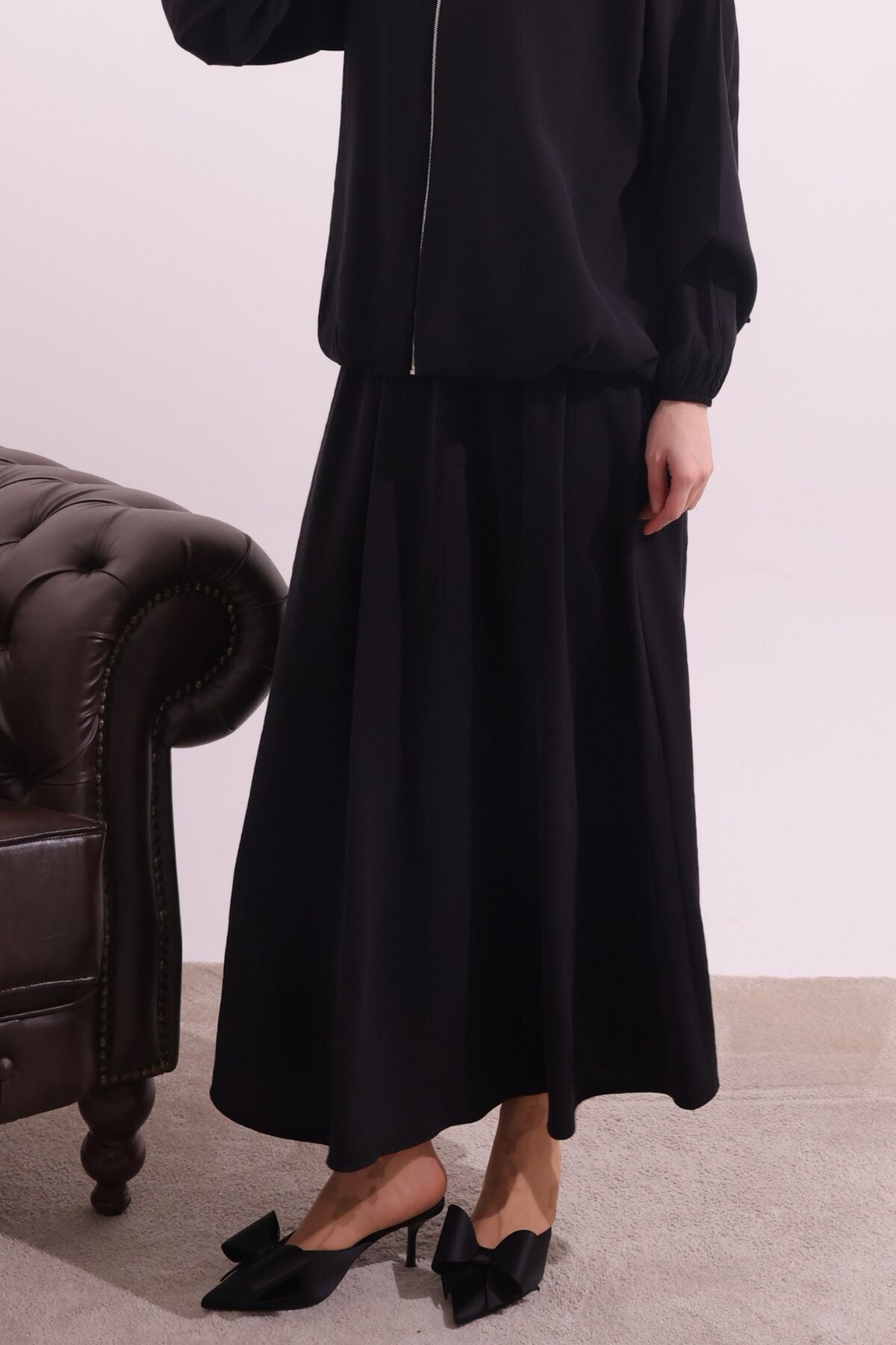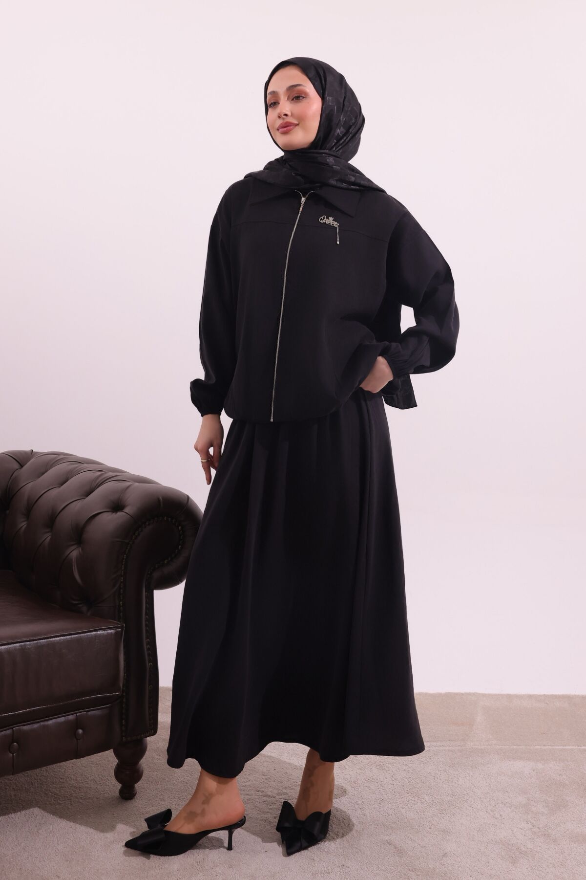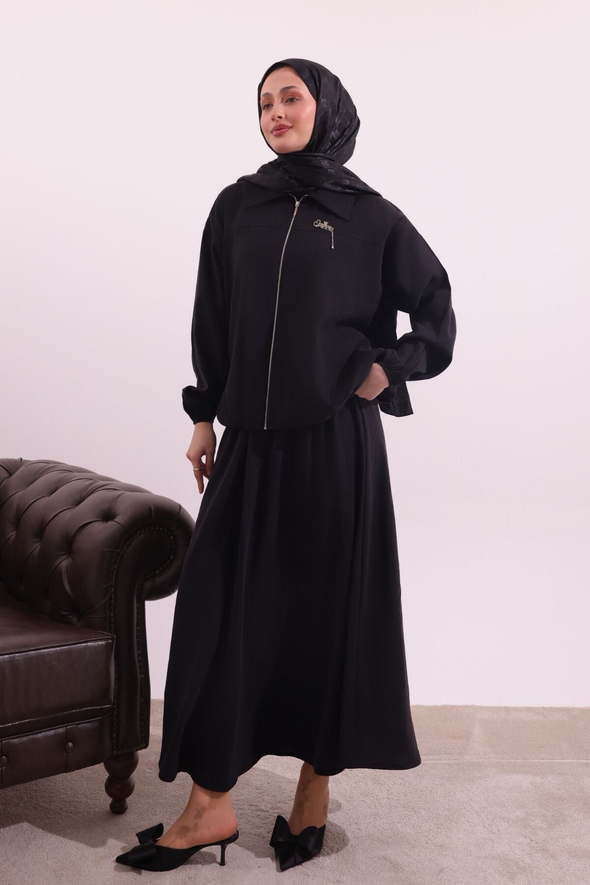 Balenbi Fermuar Detaylı Gömlek Yaka Dokuma Etekli Tesettür Takım 1180 – Form Serisi XL/2XL - Siyah
