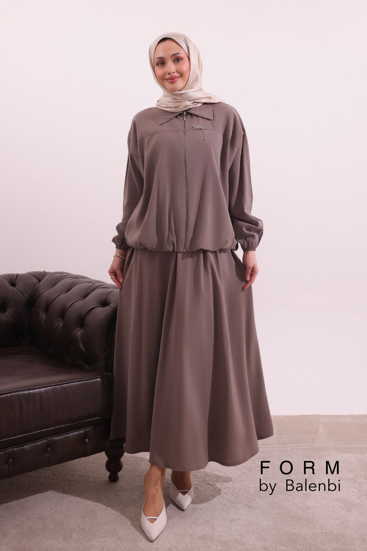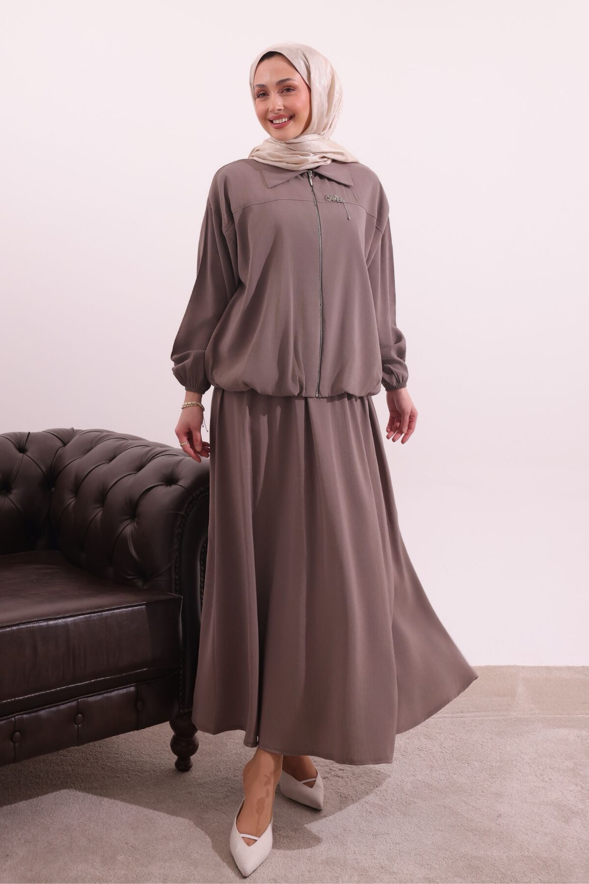Balenbi Fermuar Detaylı Gömlek Yaka Dokuma Etekli Tesettür Takım 1180 – Form Serisi XL/2XL - Toprak