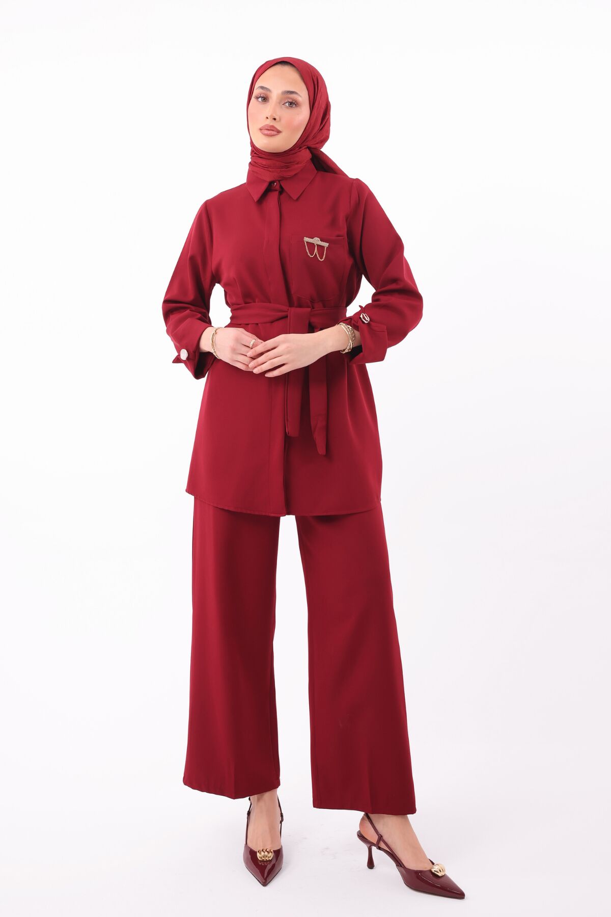 Balenbi Gömlek Yaka Beli Kuşaklı Double Krep Dokuma Tesettür Takım 1181 M/L - Bordo