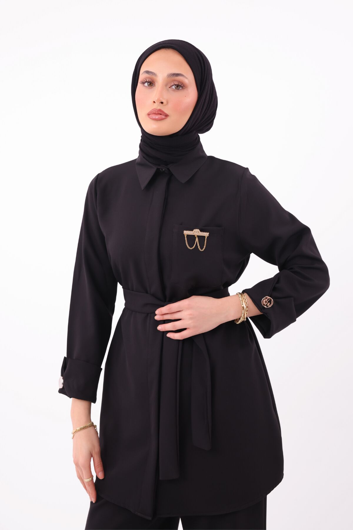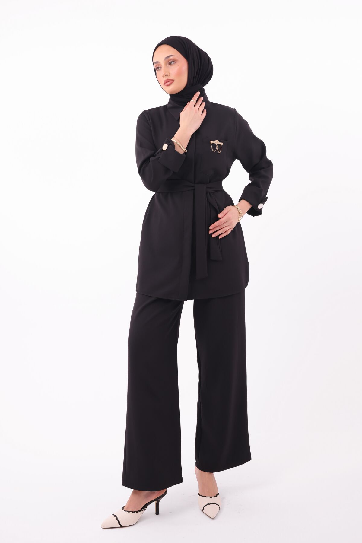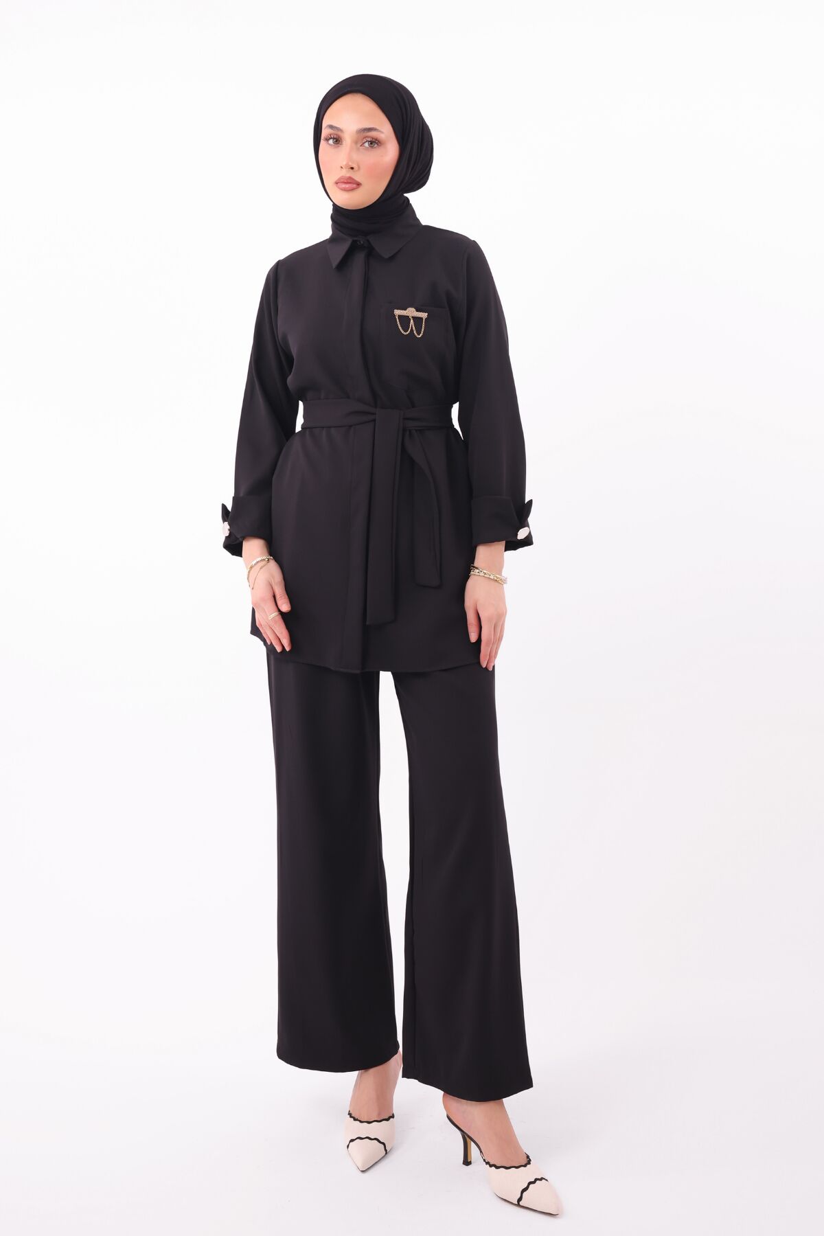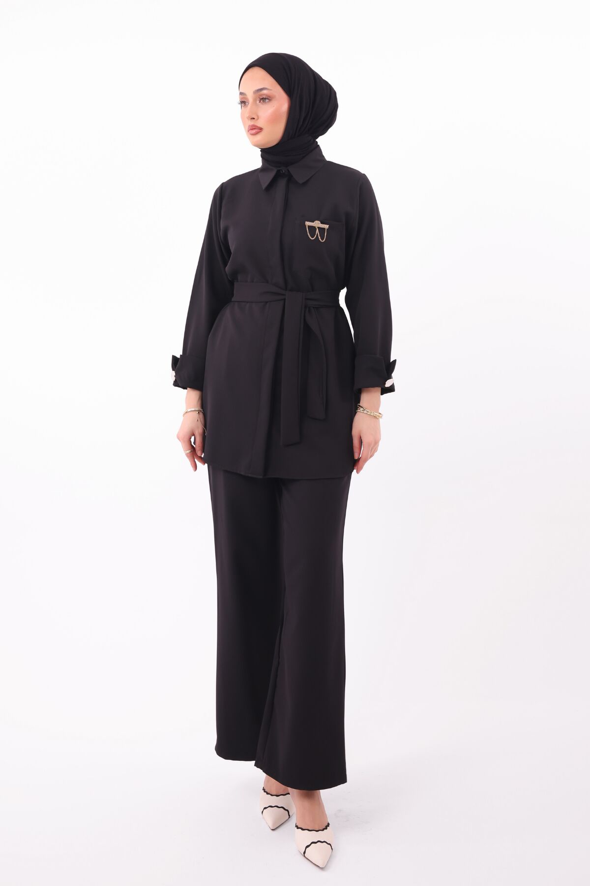 Balenbi Gömlek Yaka Beli Kuşaklı Double Krep Dokuma Tesettür Takım 1181 M/L - Siyah