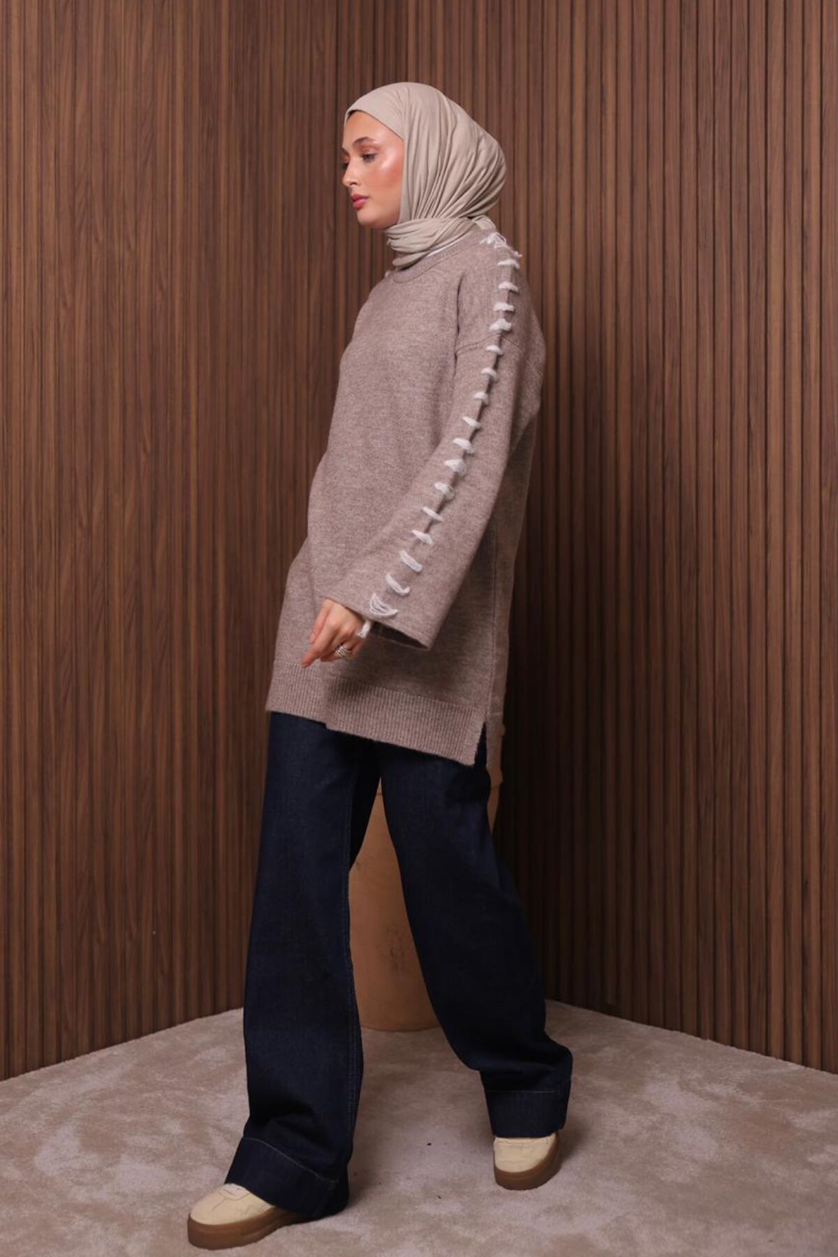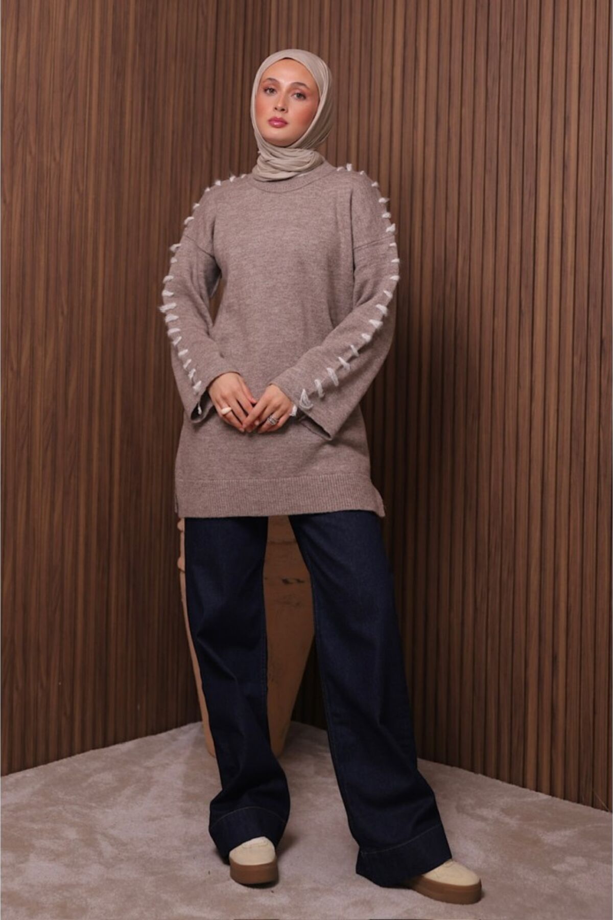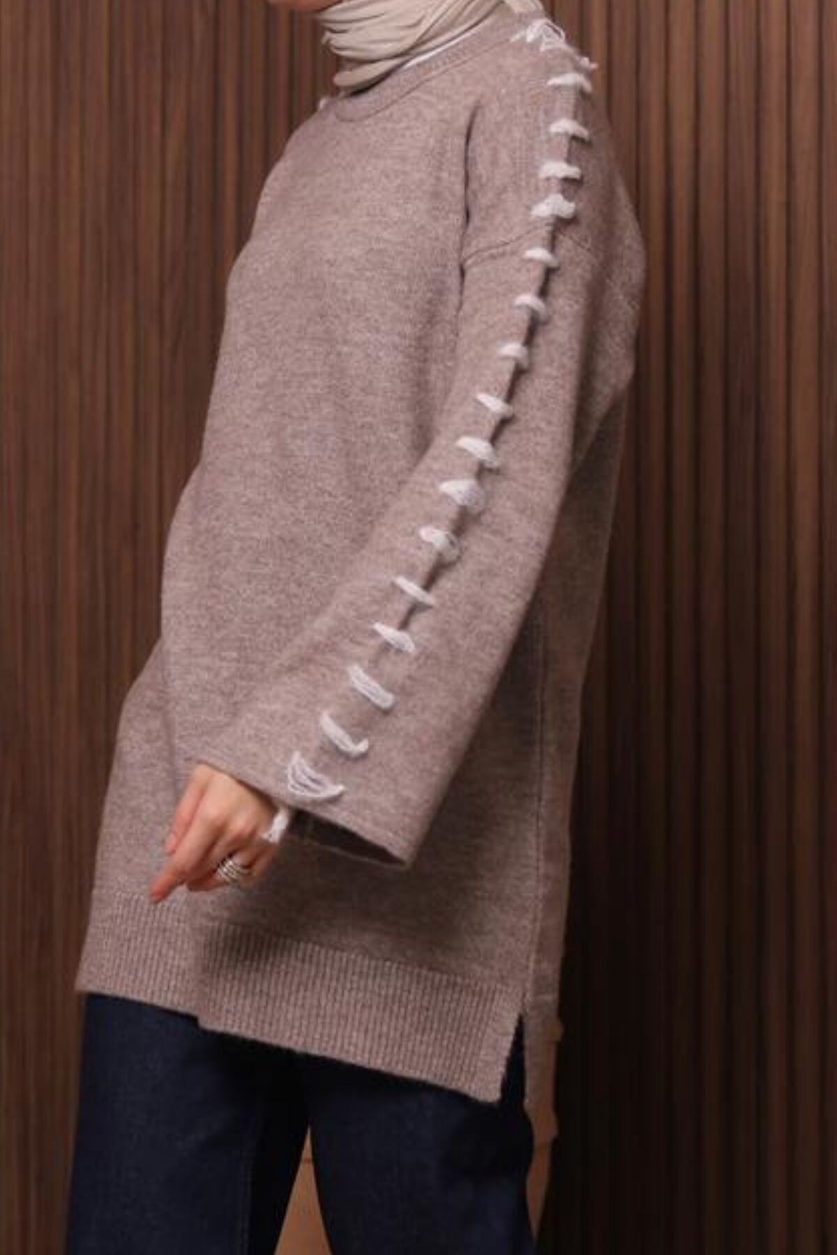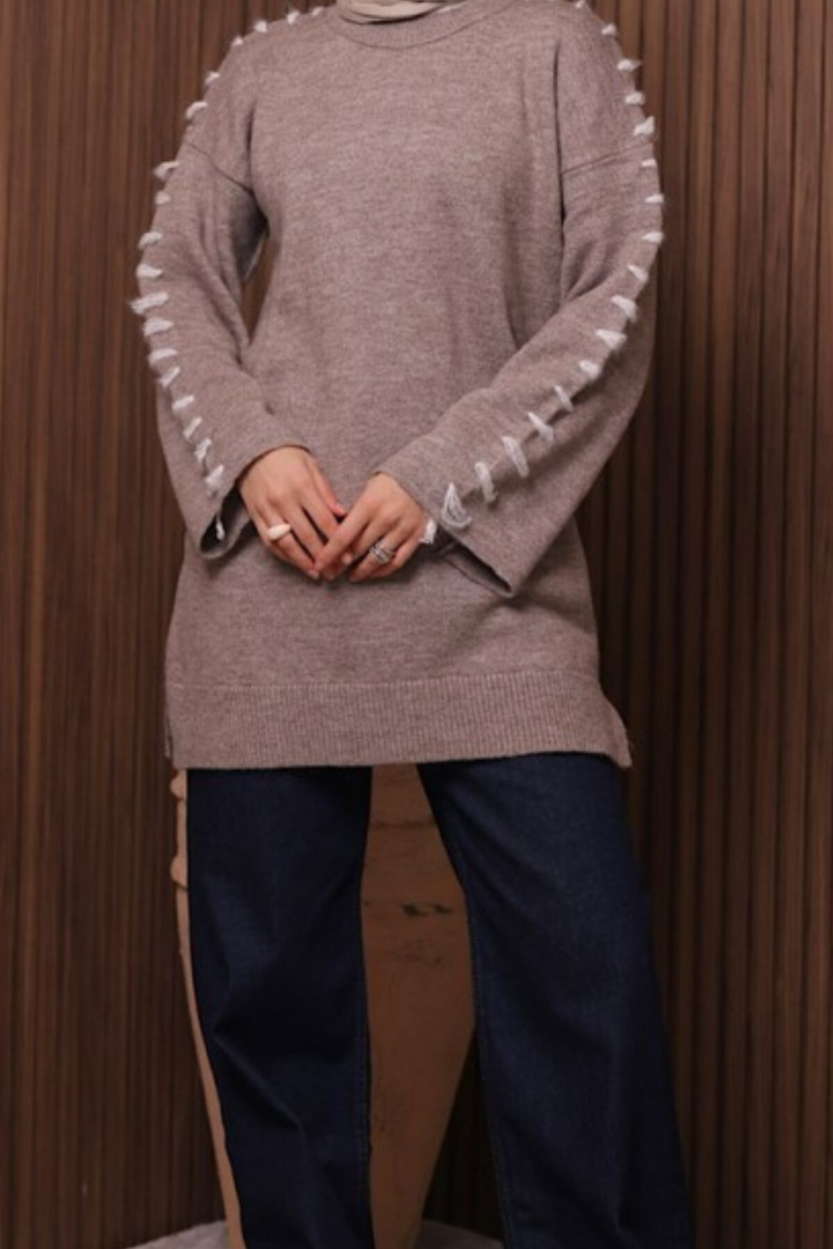 Balenbi İlmek Detaylı Uzun Oversize Tesettür Triko Tunik – 7028