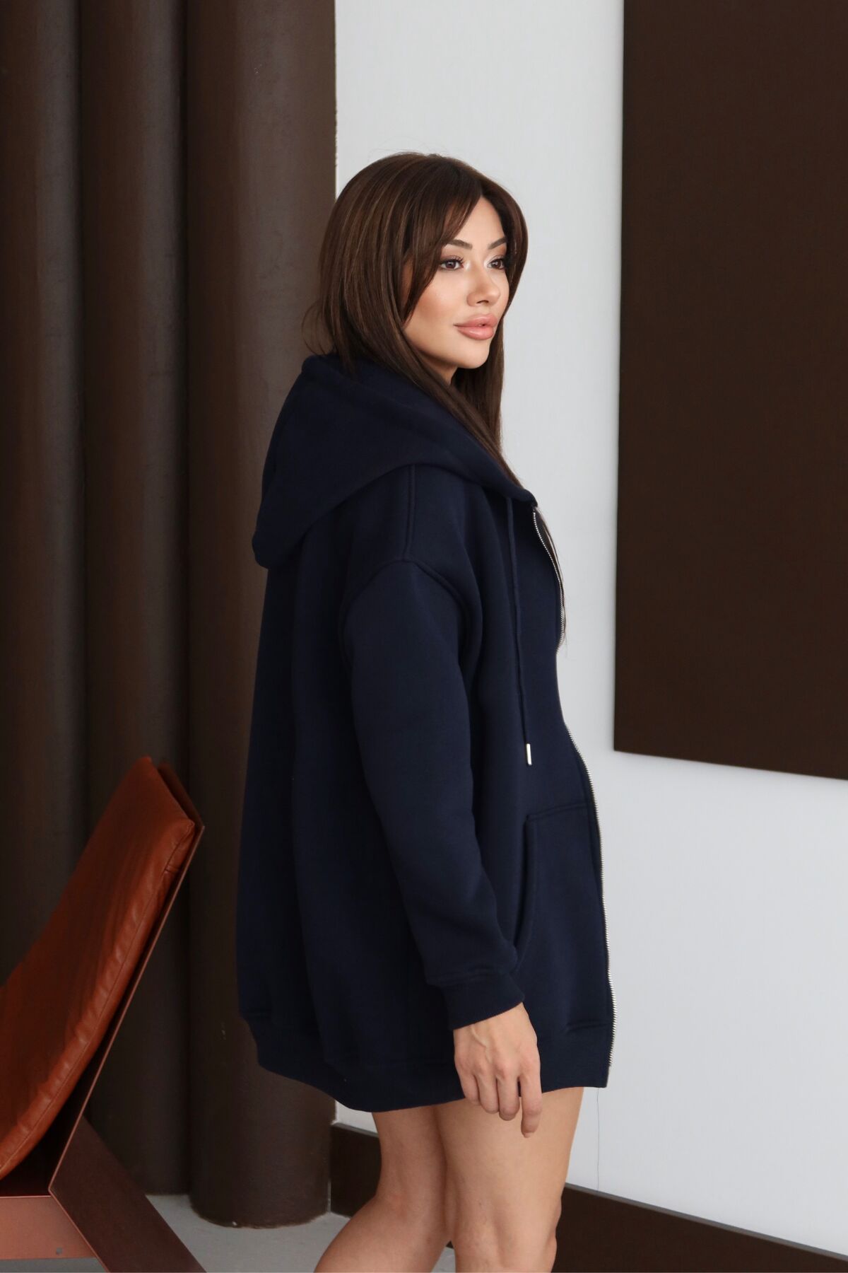Balenbi Kadın 3 İplik İçi Polarlı Kapüşonlu 75cm Oversize Sweat Hırka 1129 XL - Lacivert