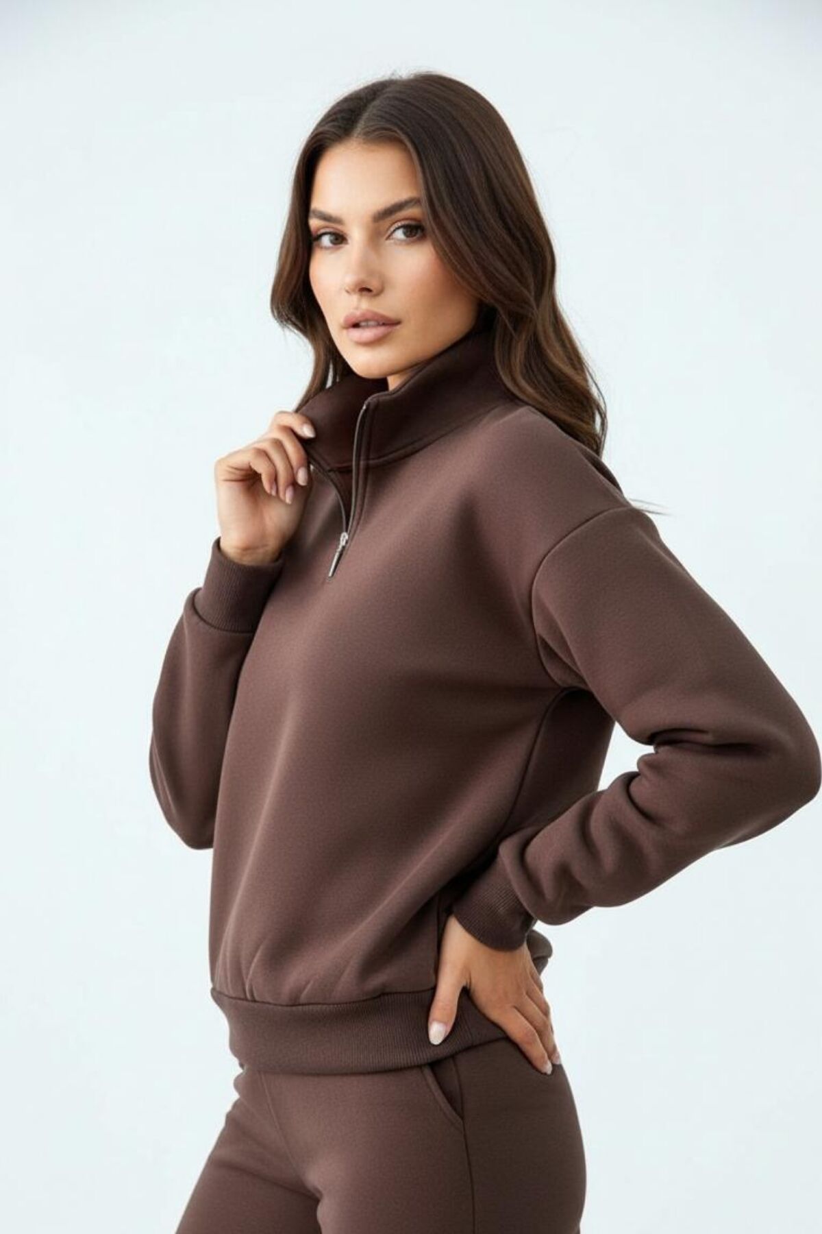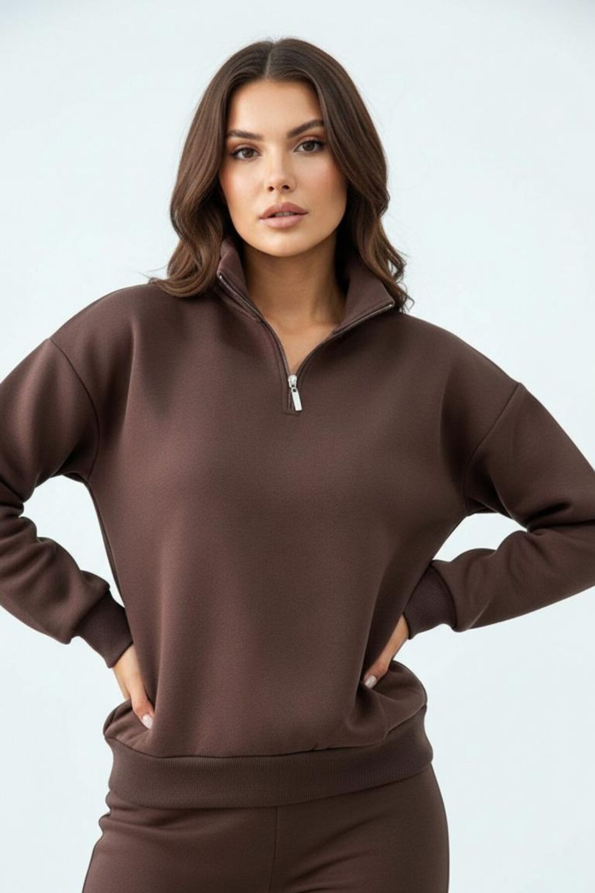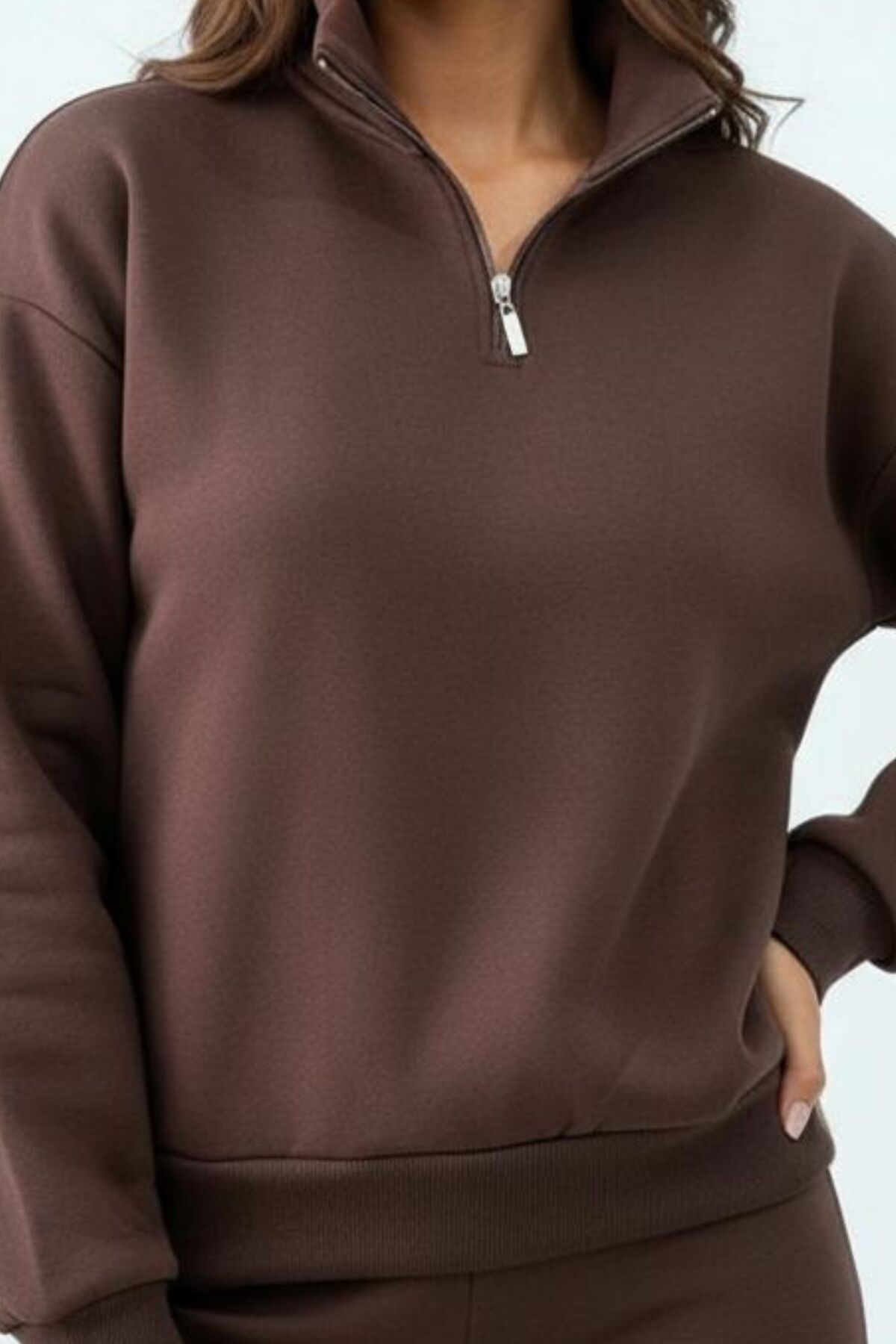 Balenbi Kadın 3 İplik İçi Polarlı Yarım Fermuarlı Oversize Sweatshirt 1112 S - Kahverengi
