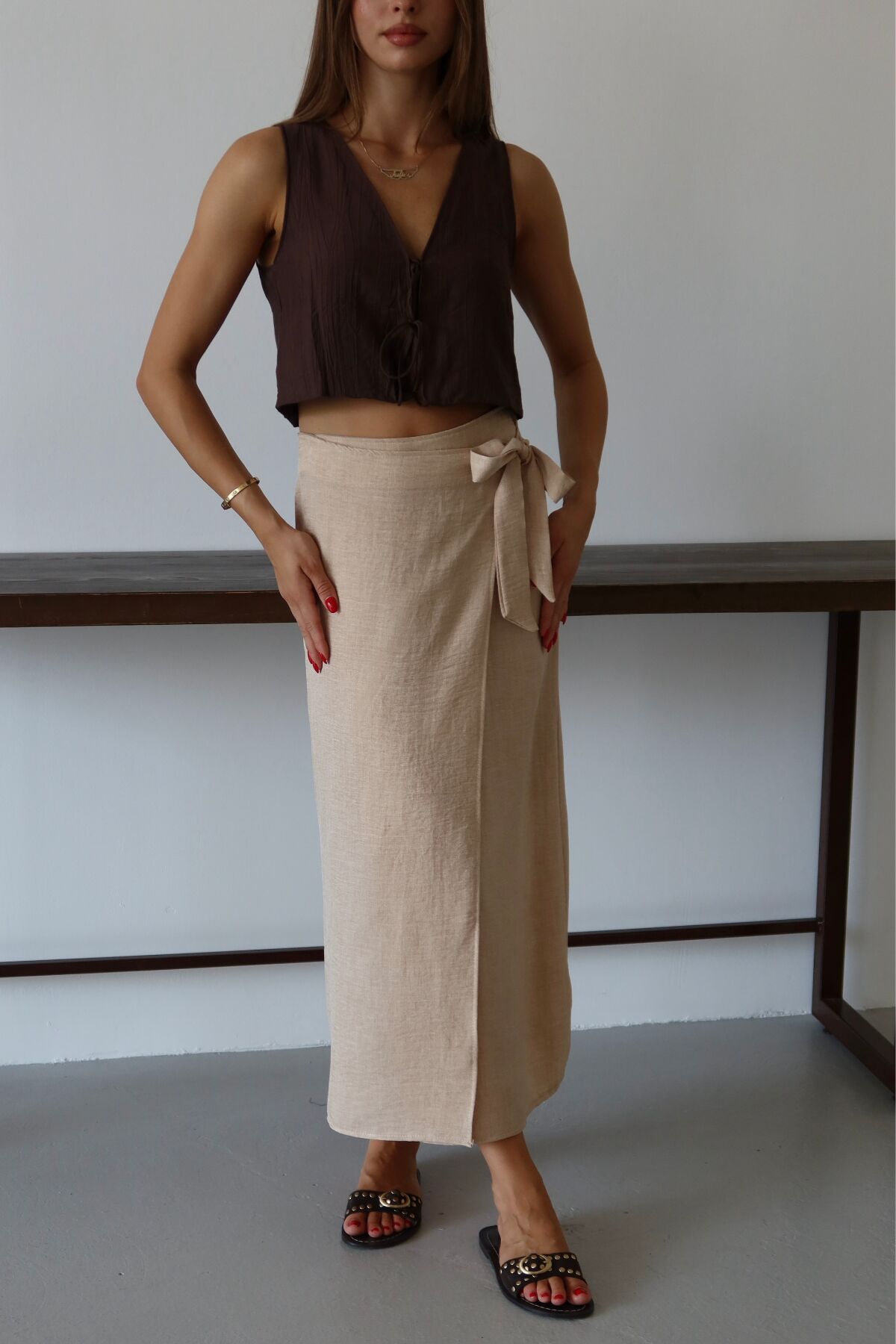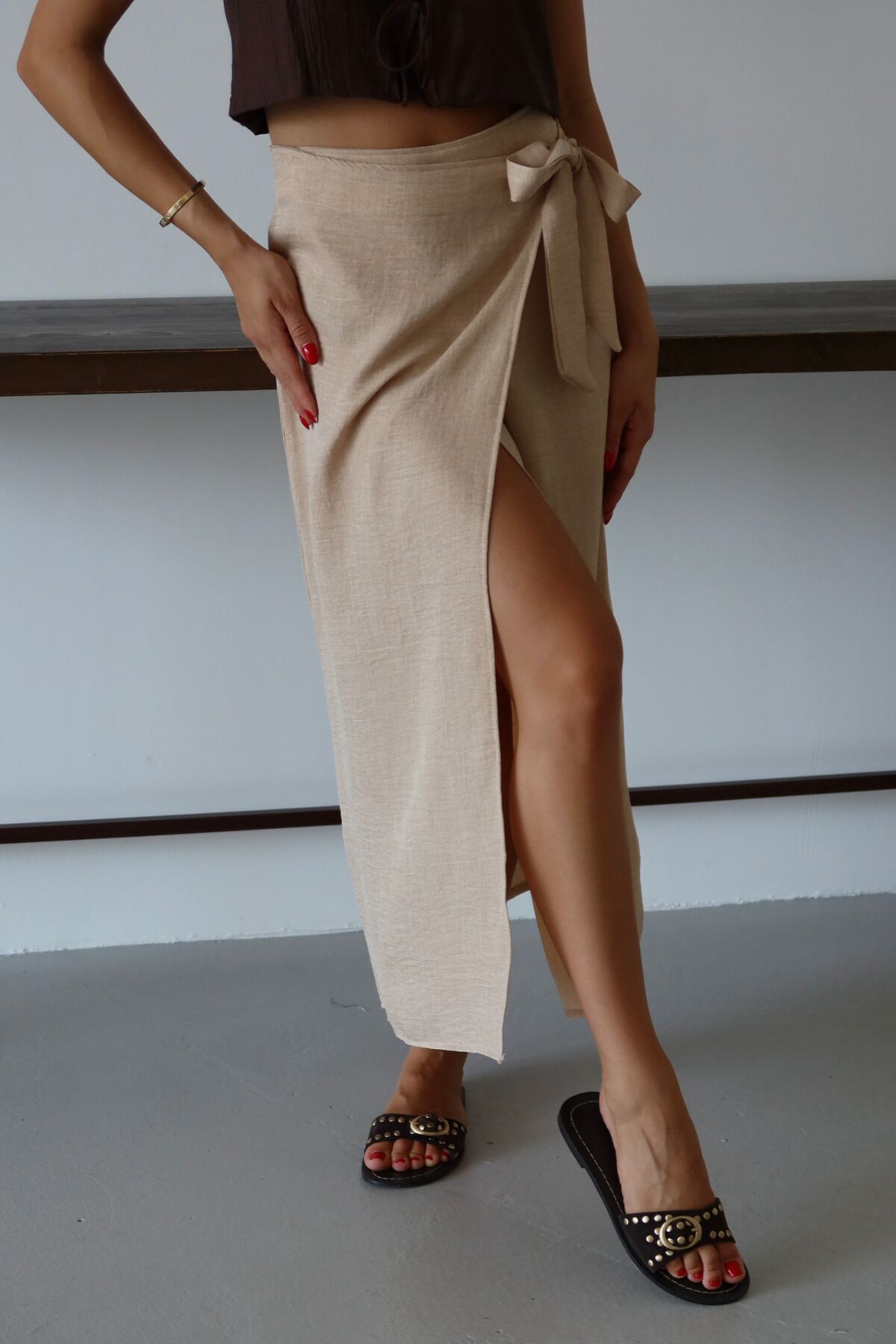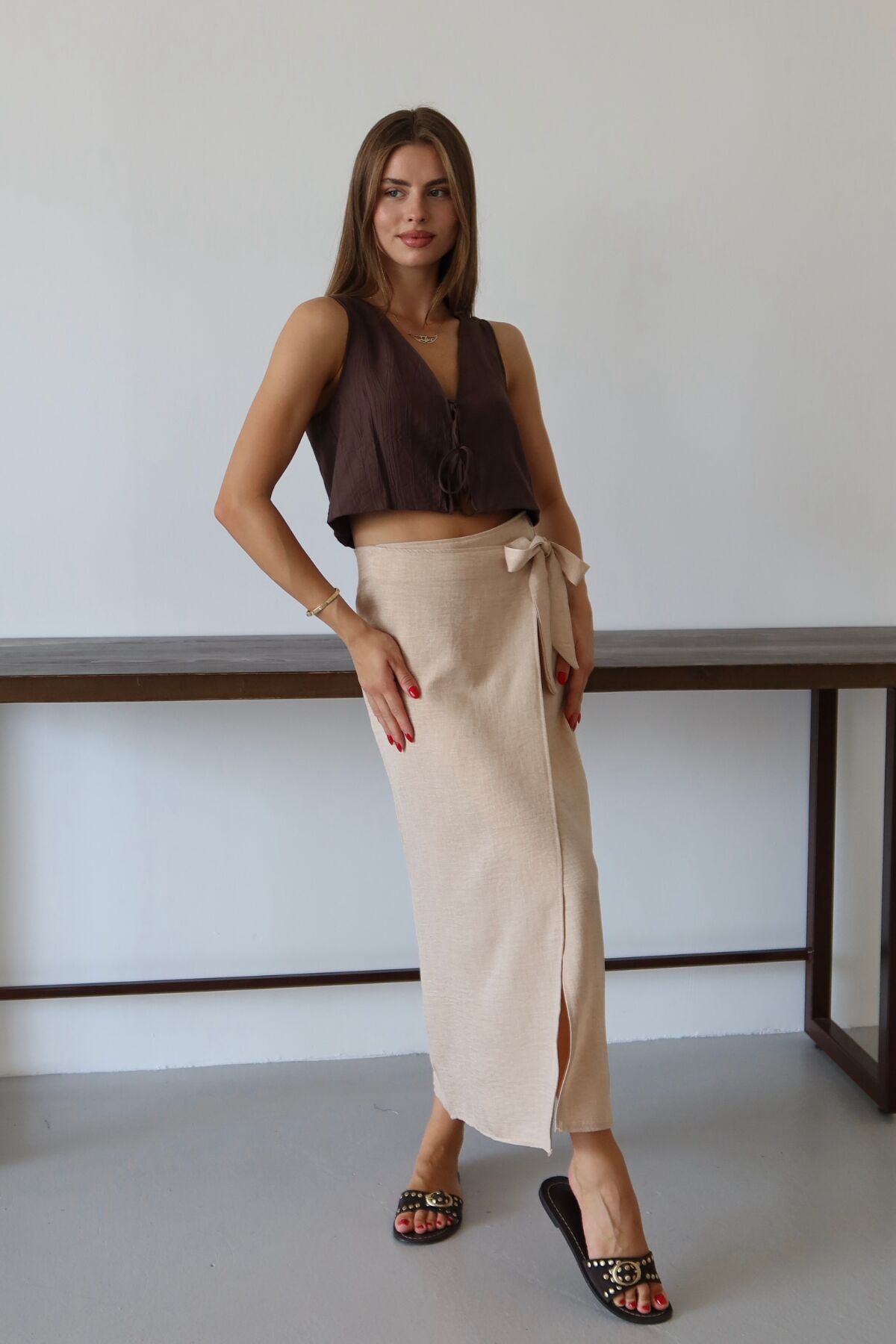 Balenbi Kadın Belden Bağlamalı Keten Karışımlı Dokuma Etek 1106 - Yaz aylarının vazgeçilmezi, hafif ve nefes alabilen keten karışımı dokusuyla konforlu bir kullanım sunar.; - Bağlama detayları sayesinde kişisel zevke göre ayarlama imkanı sağlar; hem şıklığı hem de rahatlığı bir arada yaşatır.; - Sade ve düz tasarımıyla her türlü üst giyimle kolayca kombinlenebilir, zamansız bir stil oluşturur.; - Günlük kullanımda ideal olan bu etek, casual ortamlarda rahatlıkla tercih edilebilir.; - Bağlama detaylarının yanında astarsız yapısıyla hafifliği ön planda tutan tasarım, yaz günlerinin serinliğini hissettirir.; - Uzun boyu ile bacakları olduğundan daha uzun gösterirken, klasik siluetiyle her gardıropta yerini almayı başarır.; - Kolay bakım avantajına sahip olup, 30 derecede makinede yıkama imkanı sunarak pratik bir kullanım vaat eder.;