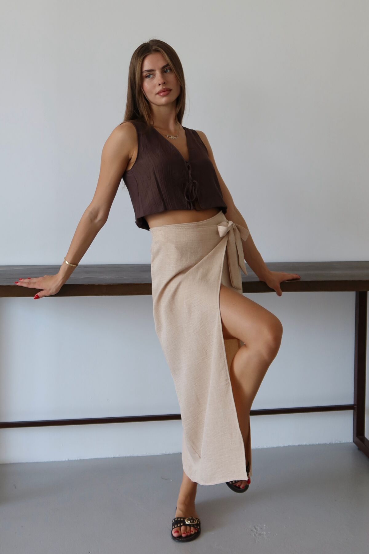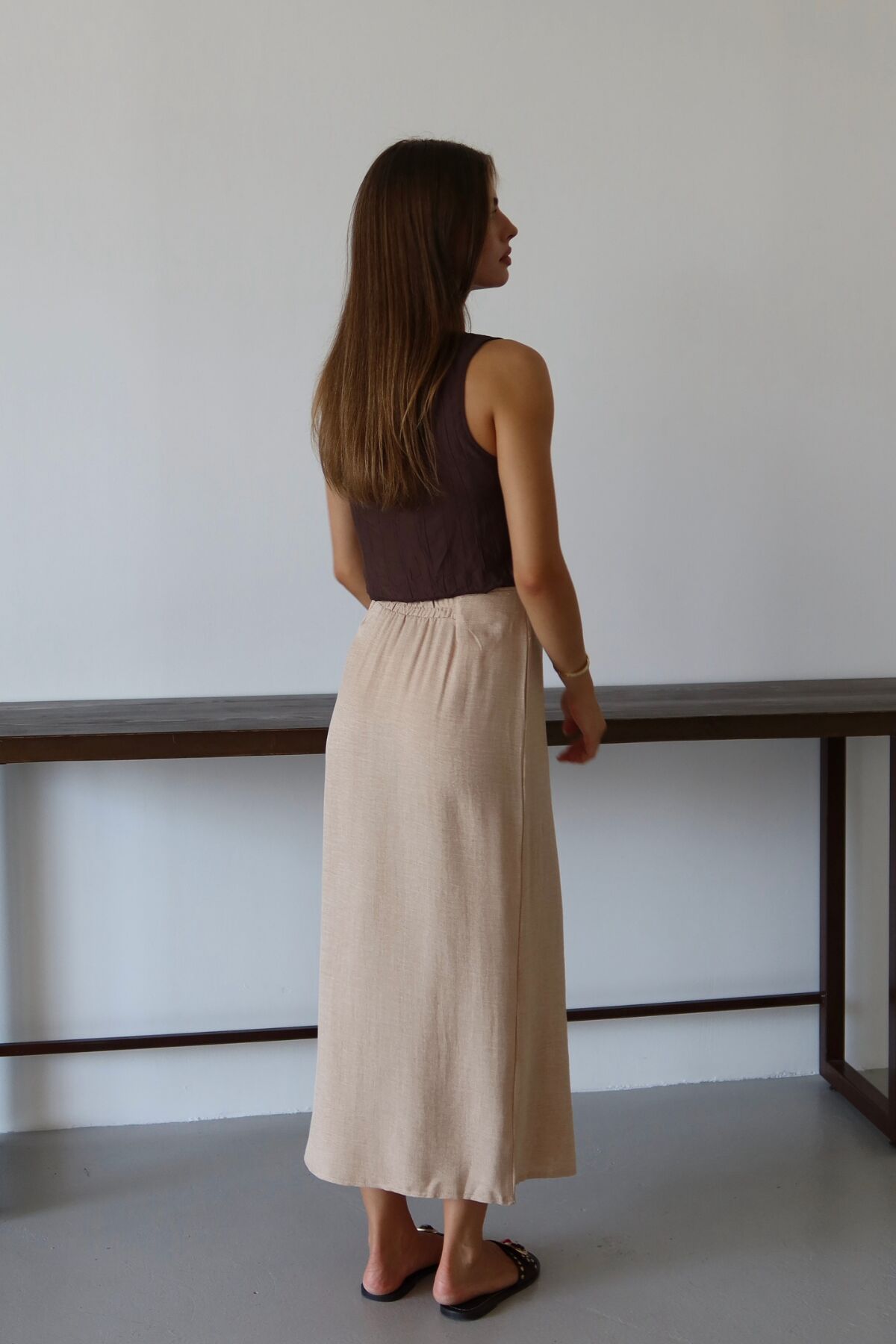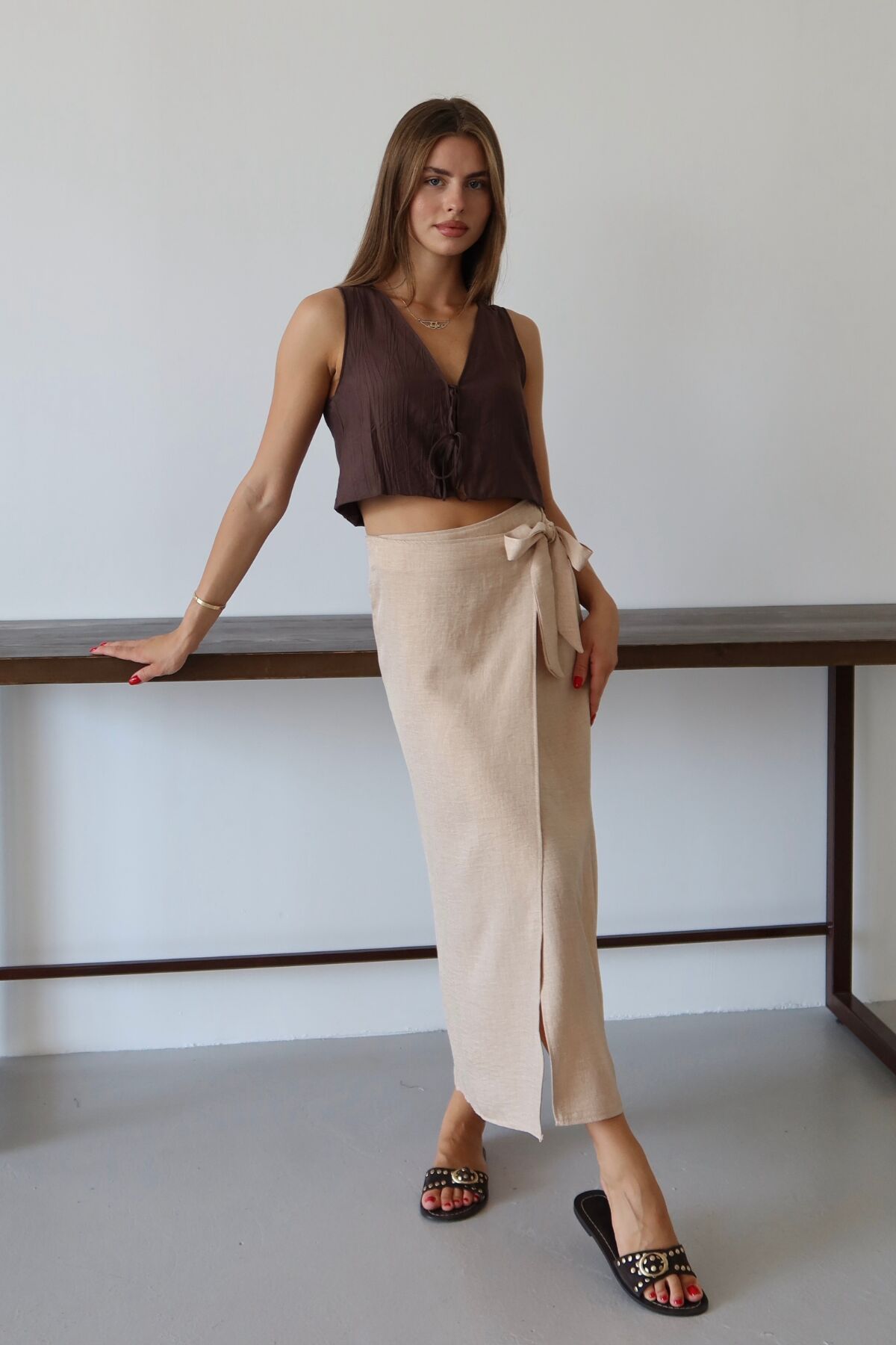 Balenbi Kadın Belden Bağlamalı Keten Karışımlı Dokuma Etek 1106 - Yaz aylarının vazgeçilmezi, hafif ve nefes alabilen keten karışımı dokusuyla konforlu bir kullanım sunar.; - Bağlama detayları sayesinde kişisel zevke göre ayarlama imkanı sağlar; hem şıklığı hem de rahatlığı bir arada yaşatır.; - Sade ve düz tasarımıyla her türlü üst giyimle kolayca kombinlenebilir, zamansız bir stil oluşturur.; - Günlük kullanımda ideal olan bu etek, casual ortamlarda rahatlıkla tercih edilebilir.; - Bağlama detaylarının yanında astarsız yapısıyla hafifliği ön planda tutan tasarım, yaz günlerinin serinliğini hissettirir.; - Uzun boyu ile bacakları olduğundan daha uzun gösterirken, klasik siluetiyle her gardıropta yerini almayı başarır.; - Kolay bakım avantajına sahip olup, 30 derecede makinede yıkama imkanı sunarak pratik bir kullanım vaat eder.;