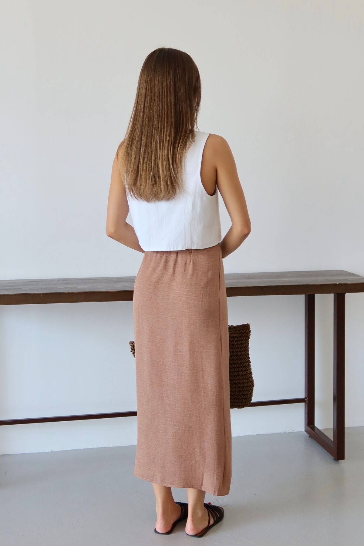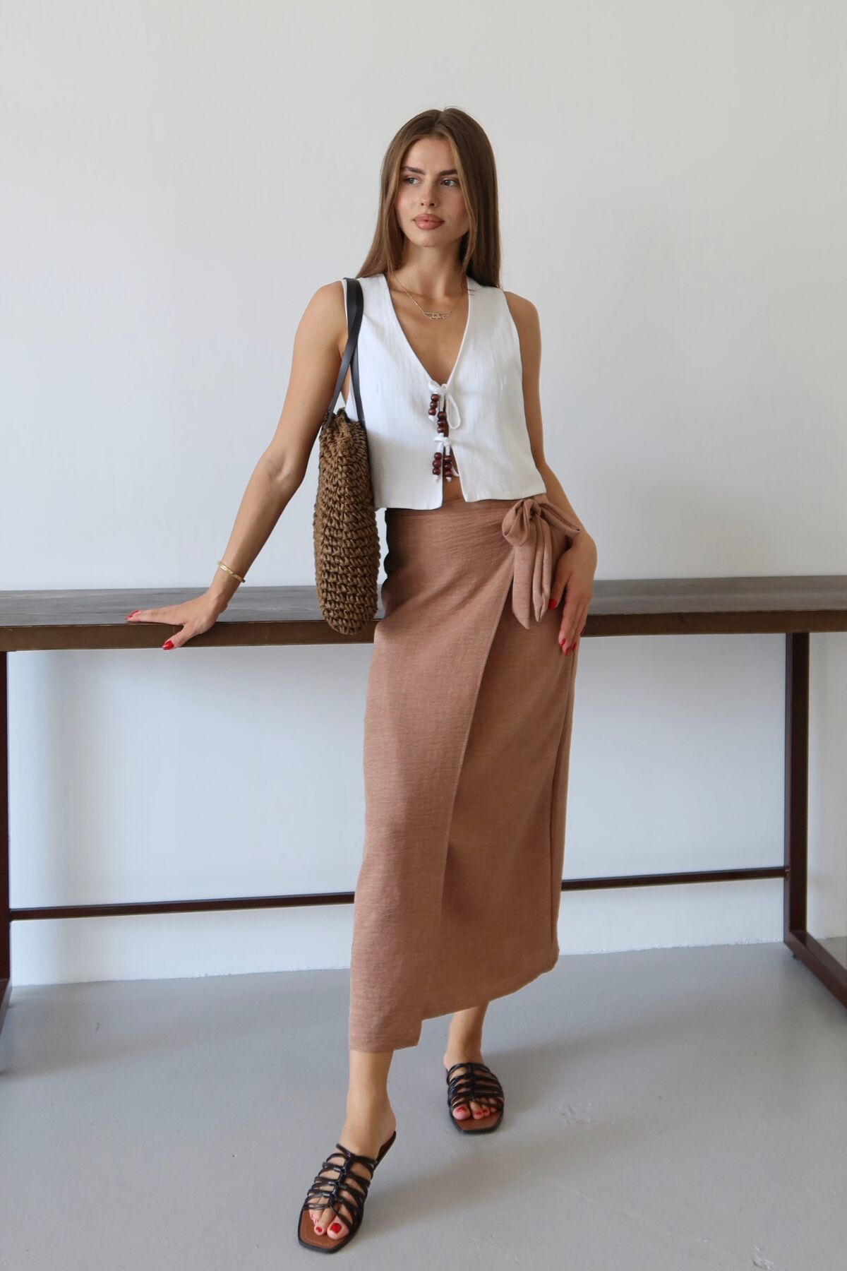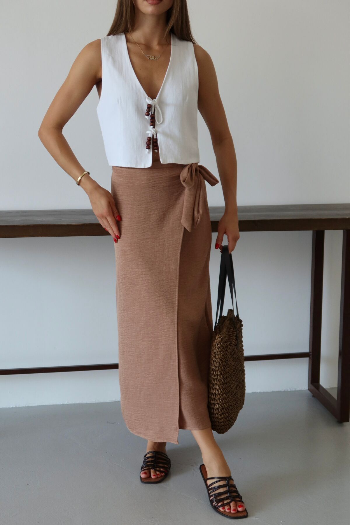 Balenbi Kadın Belden Bağlamalı Keten Karışımlı Dokuma Etek 1106 - Yaz aylarının vazgeçilmezi, hafif ve nefes alabilen keten karışımı dokusuyla konforlu bir kullanım sunar.; - Bağlama detayları sayesinde kişisel zevke göre ayarlama imkanı sağlar; hem şıklığı hem de rahatlığı bir arada yaşatır.; - Sade ve düz tasarımıyla her türlü üst giyimle kolayca kombinlenebilir, zamansız bir stil oluşturur.; - Günlük kullanımda ideal olan bu etek, casual ortamlarda rahatlıkla tercih edilebilir.; - Bağlama detaylarının yanında astarsız yapısıyla hafifliği ön planda tutan tasarım, yaz günlerinin serinliğini hissettirir.; - Uzun boyu ile bacakları olduğundan daha uzun gösterirken, klasik siluetiyle her gardıropta yerini almayı başarır.; - Kolay bakım avantajına sahip olup, 30 derecede makinede yıkama imkanı sunarak pratik bir kullanım vaat eder.;