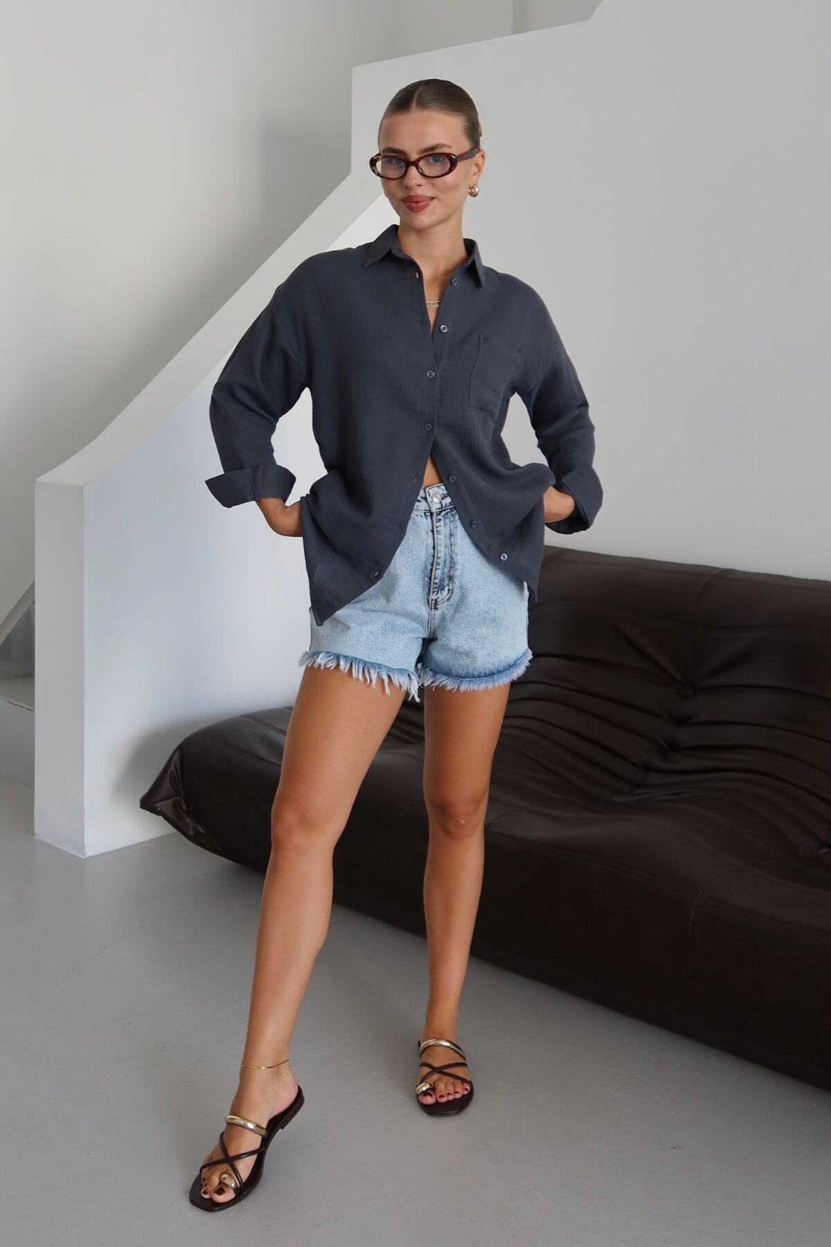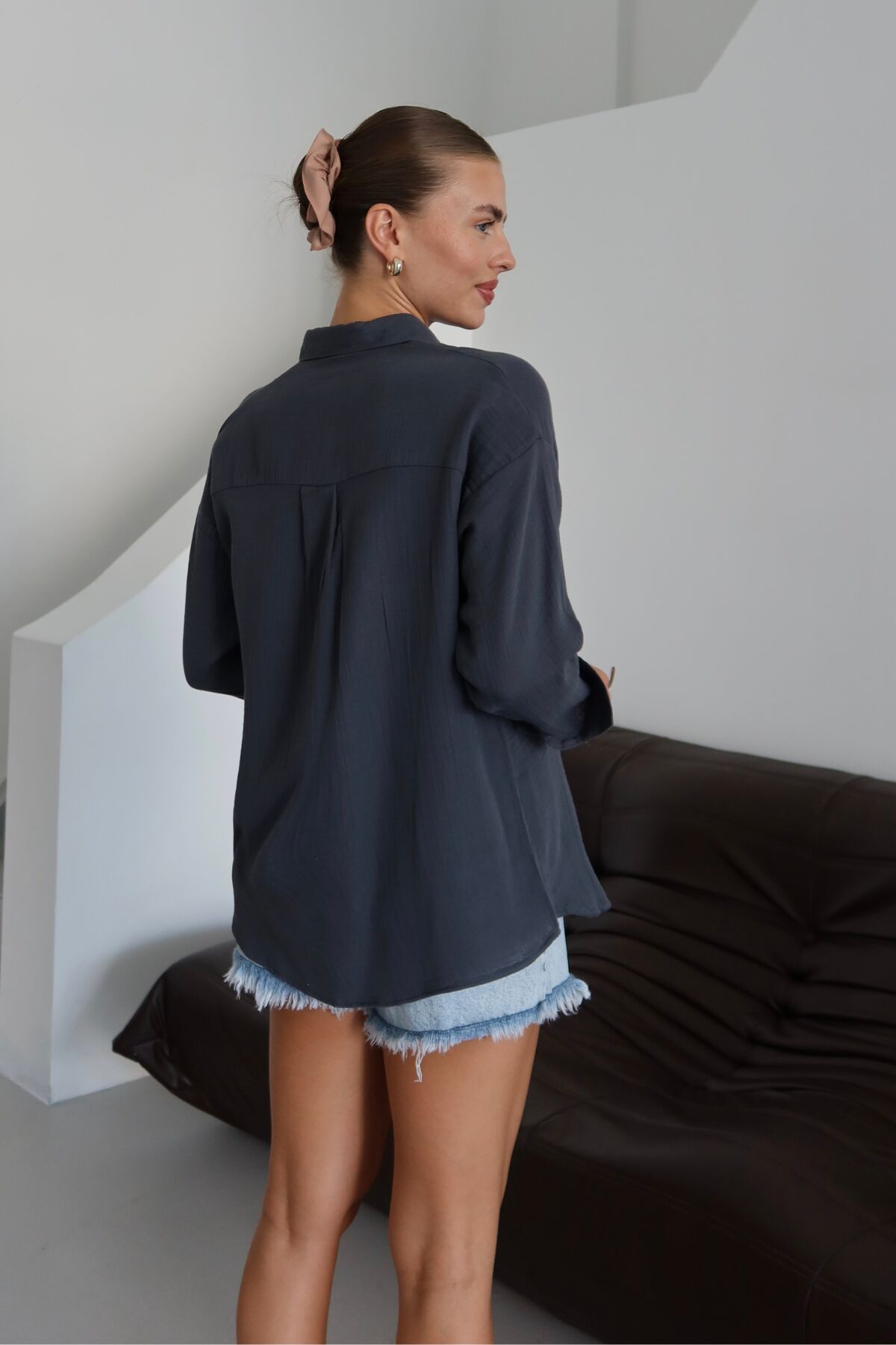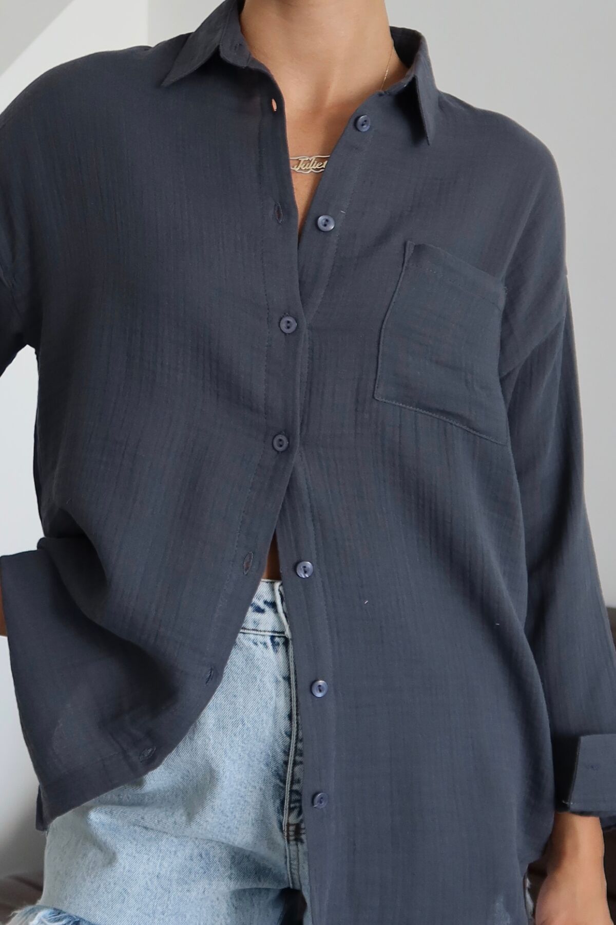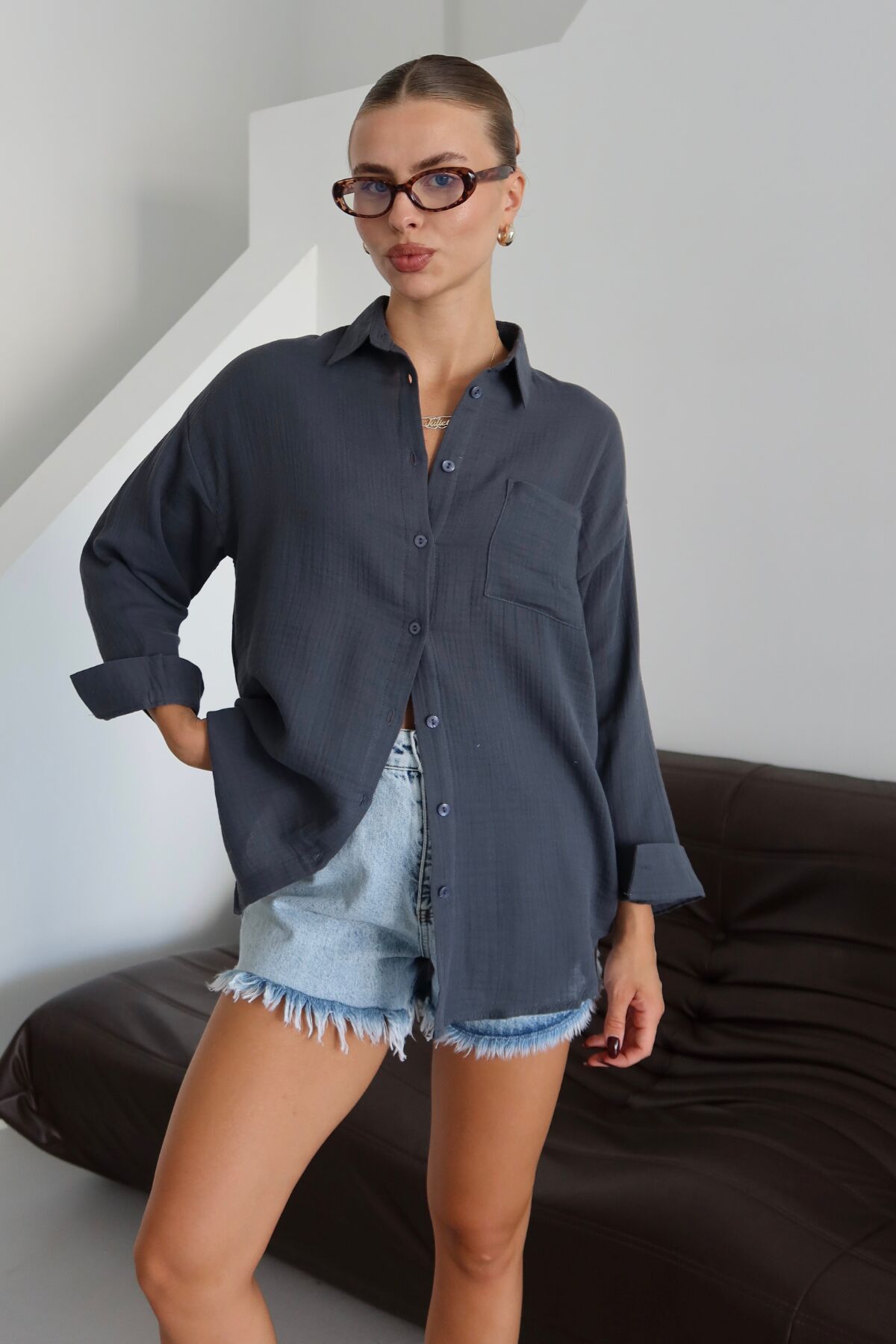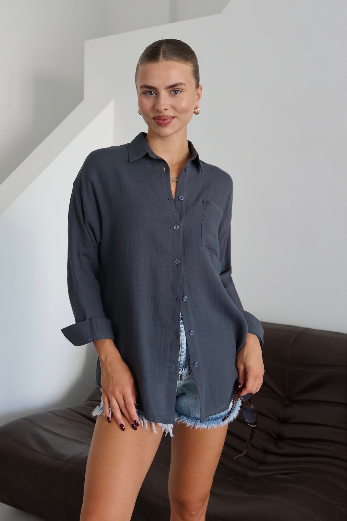 Balenbi Kadın Cepli Oversize Düz Renk Müslin Gömlek 1095 S - Antrasit