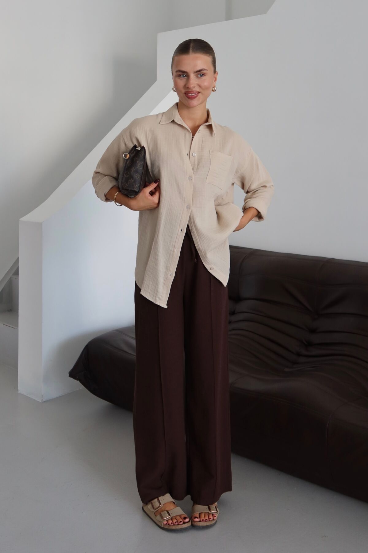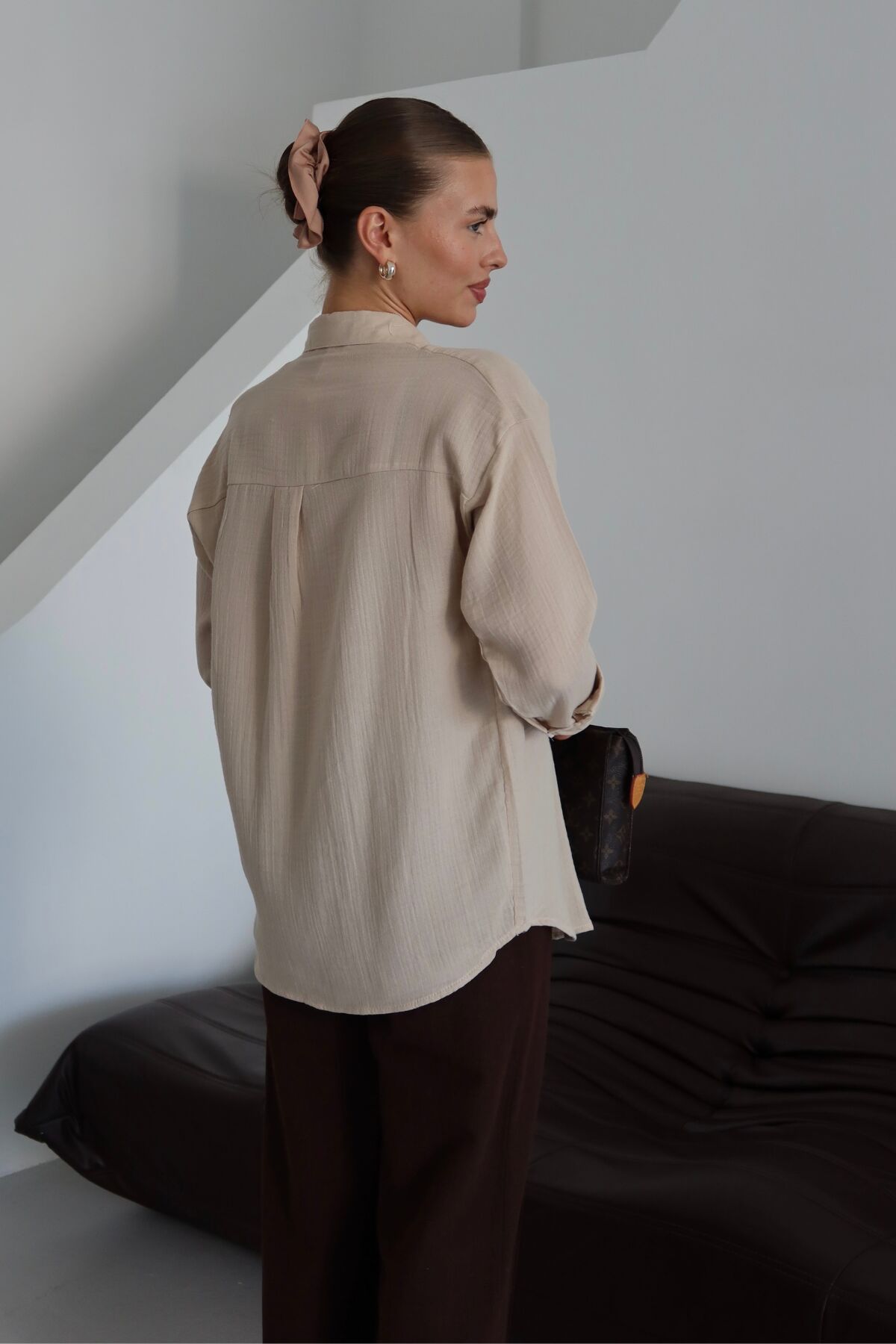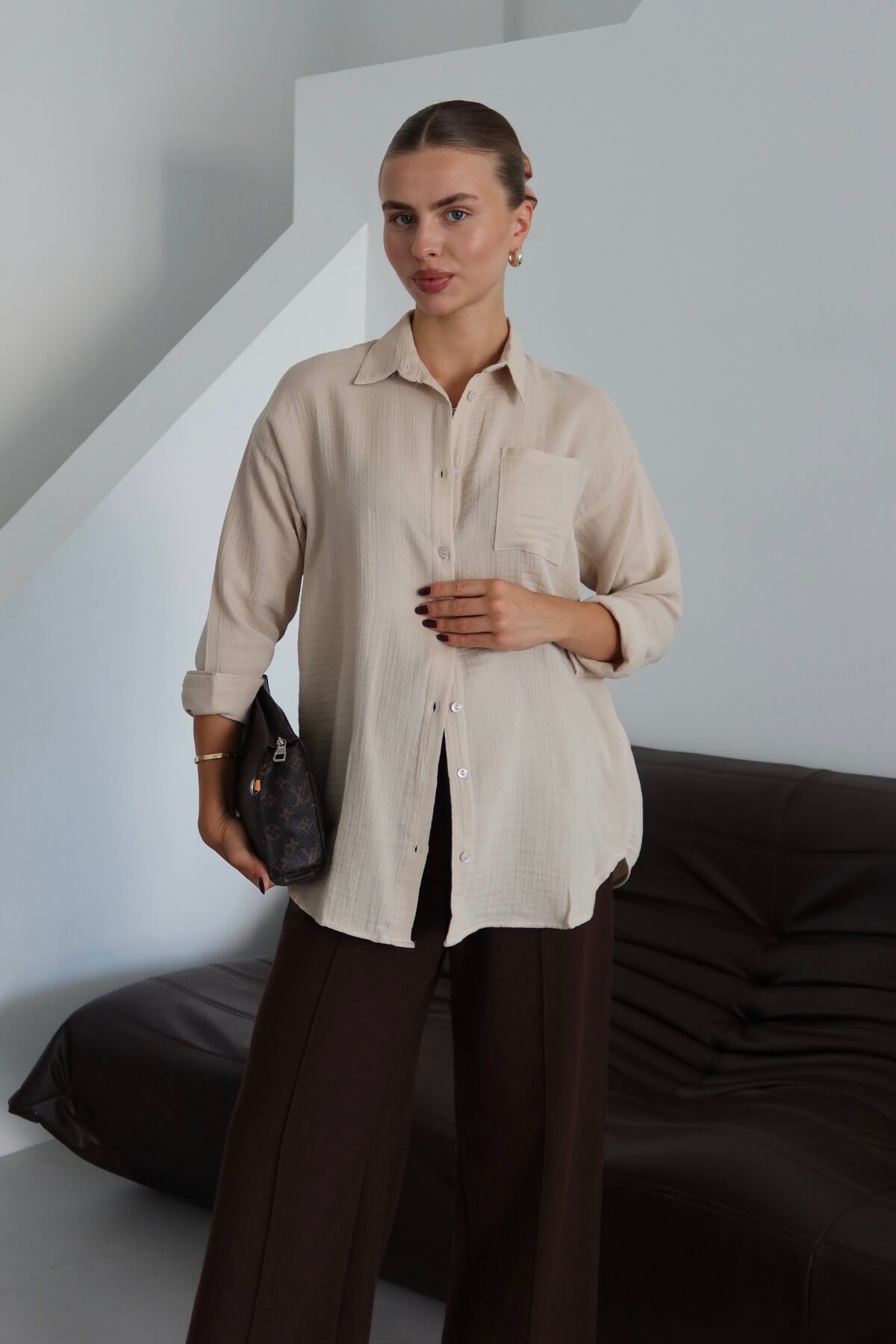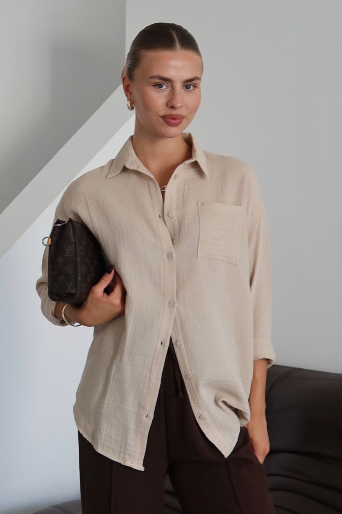 Balenbi Kadın Cepli Oversize Düz Renk Müslin Gömlek 1095 S - Bej
