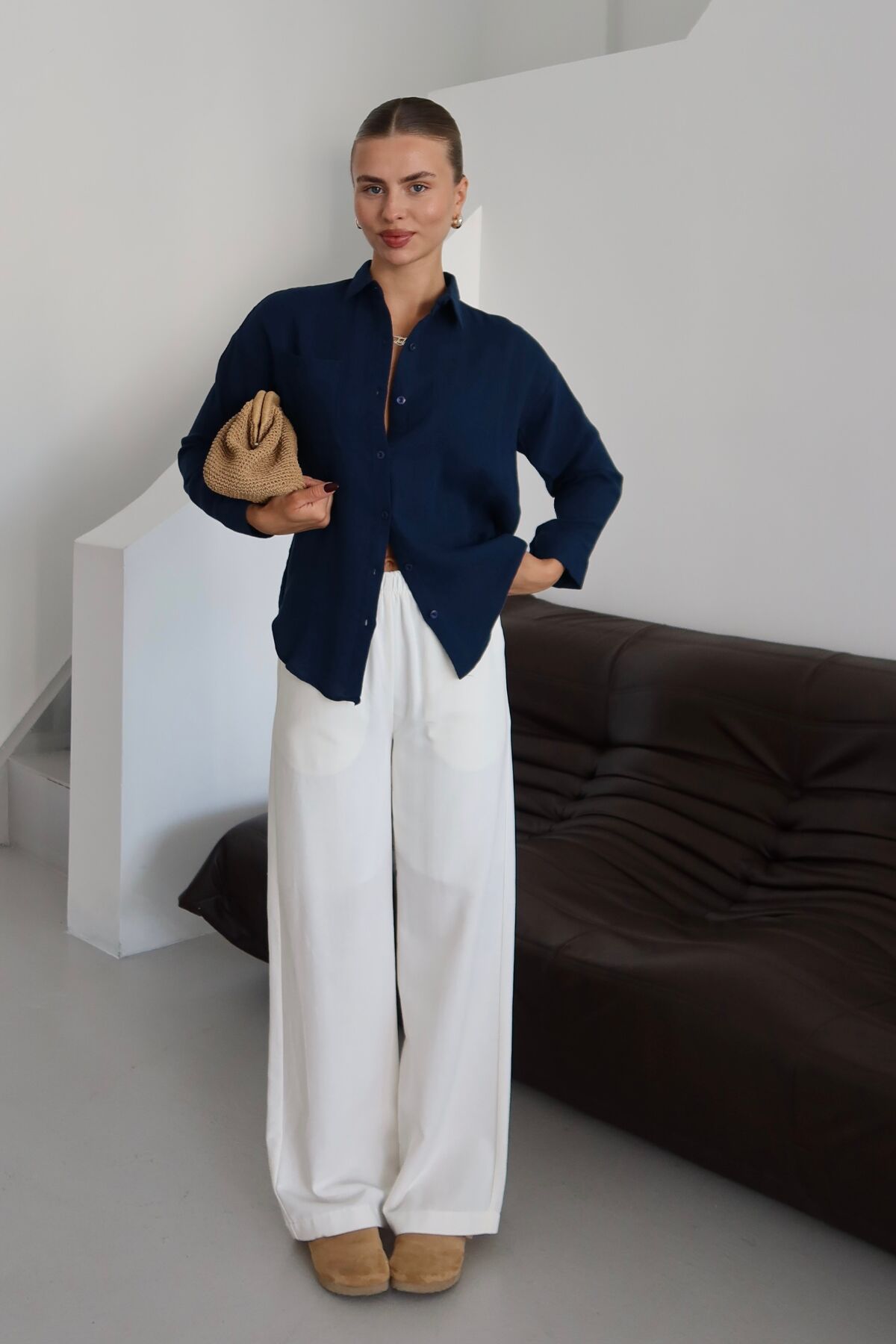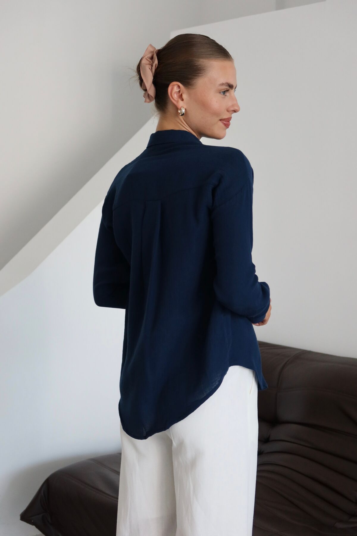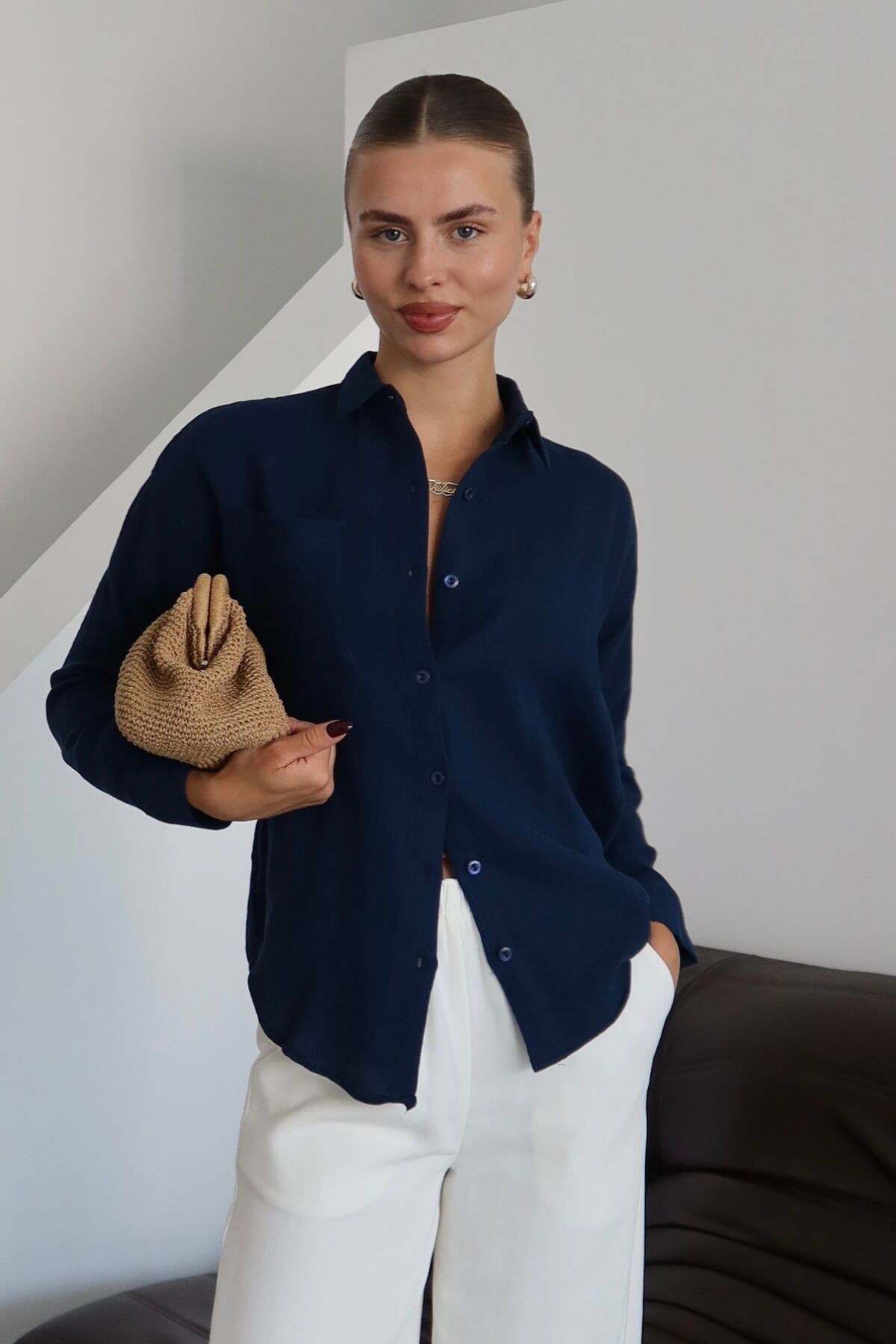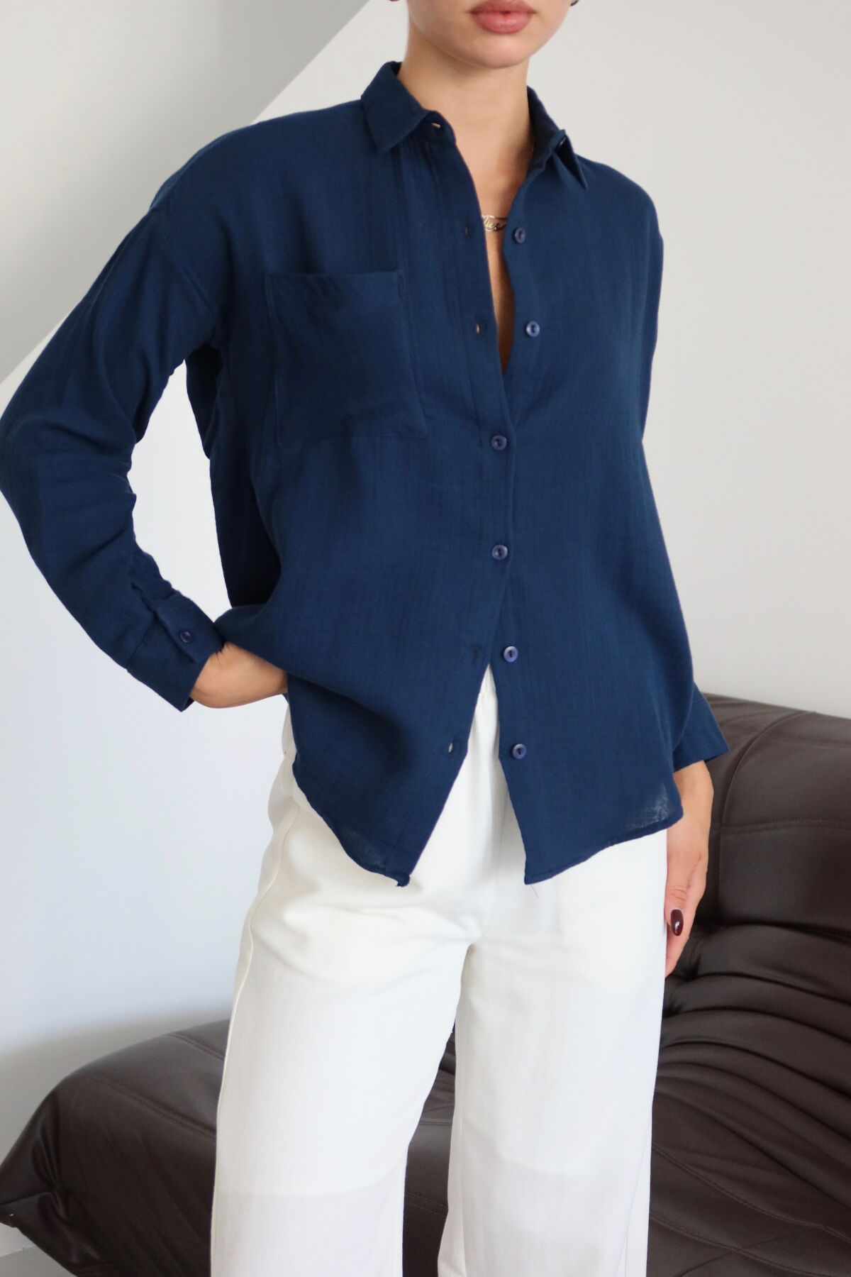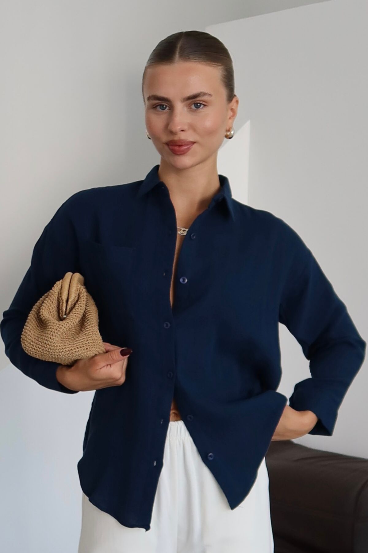 Balenbi Kadın Cepli Oversize Düz Renk Müslin Gömlek 1095 S - Lacivert
