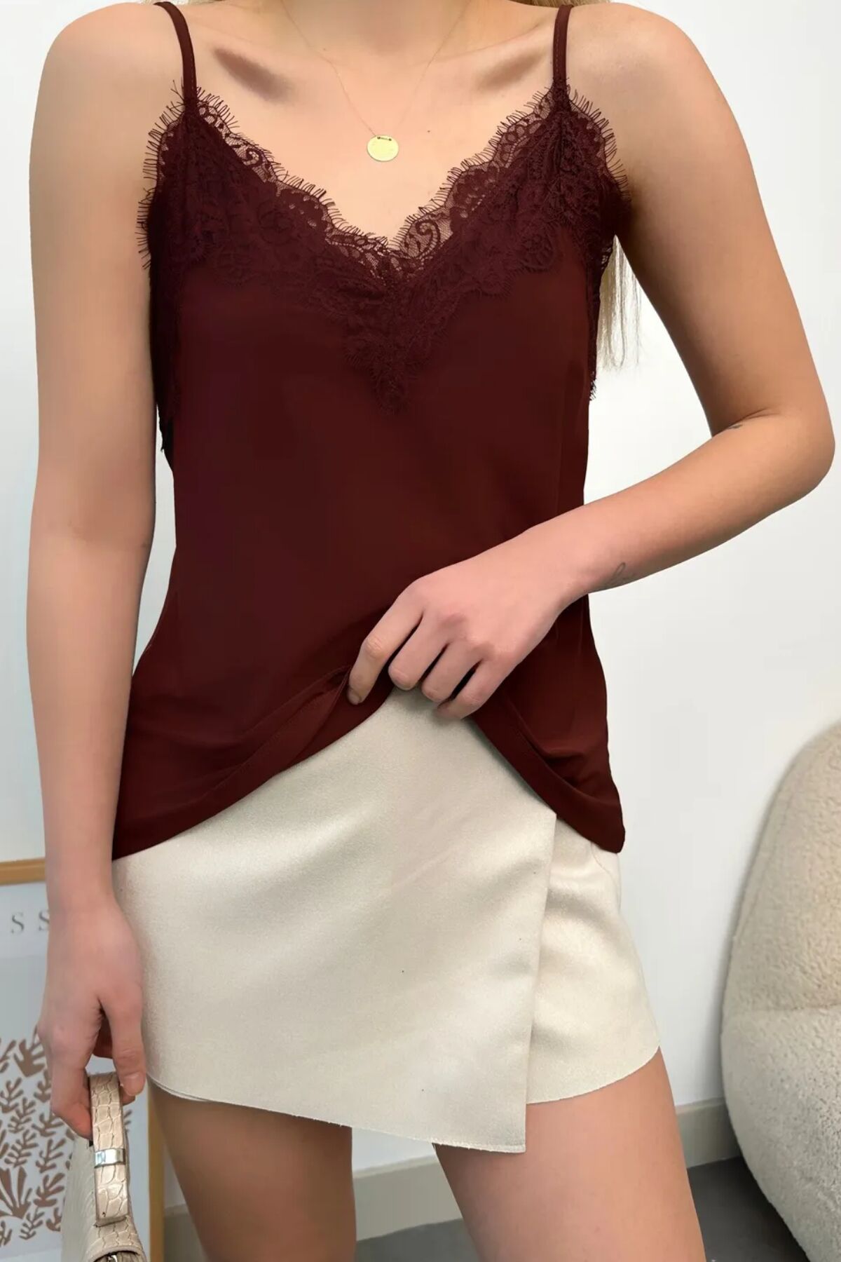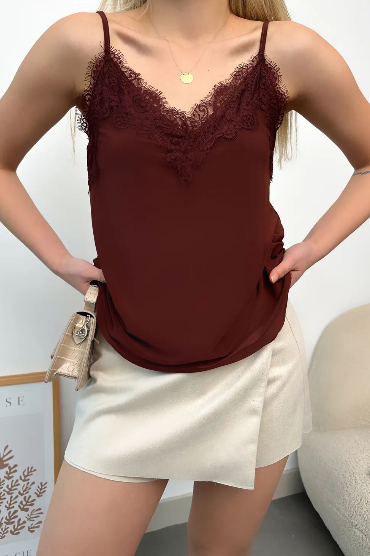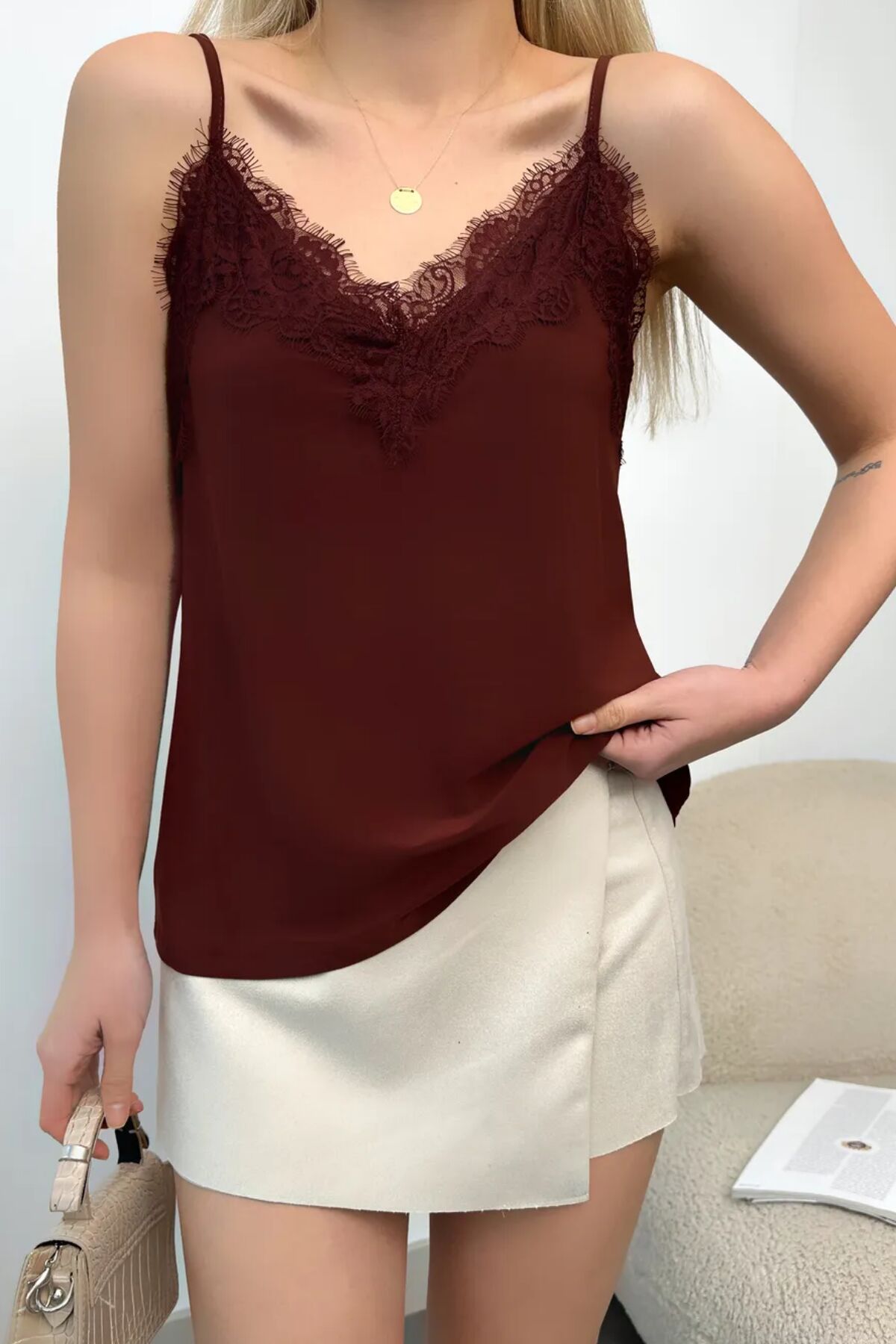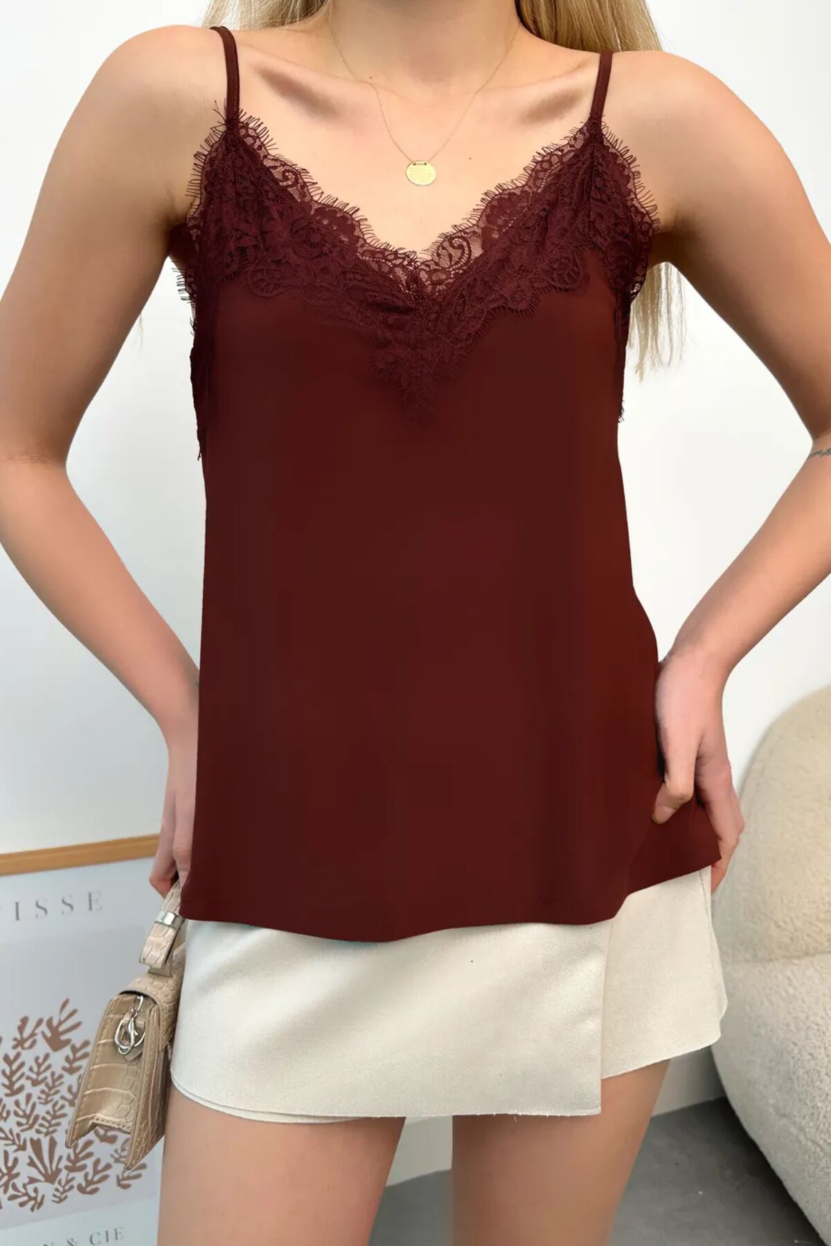 Şık ve zarif tasarımlarından biri olan dantel Yaka Askılı sandy Kadın Bluz,
