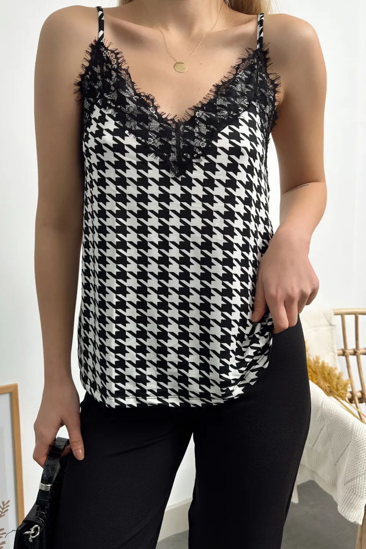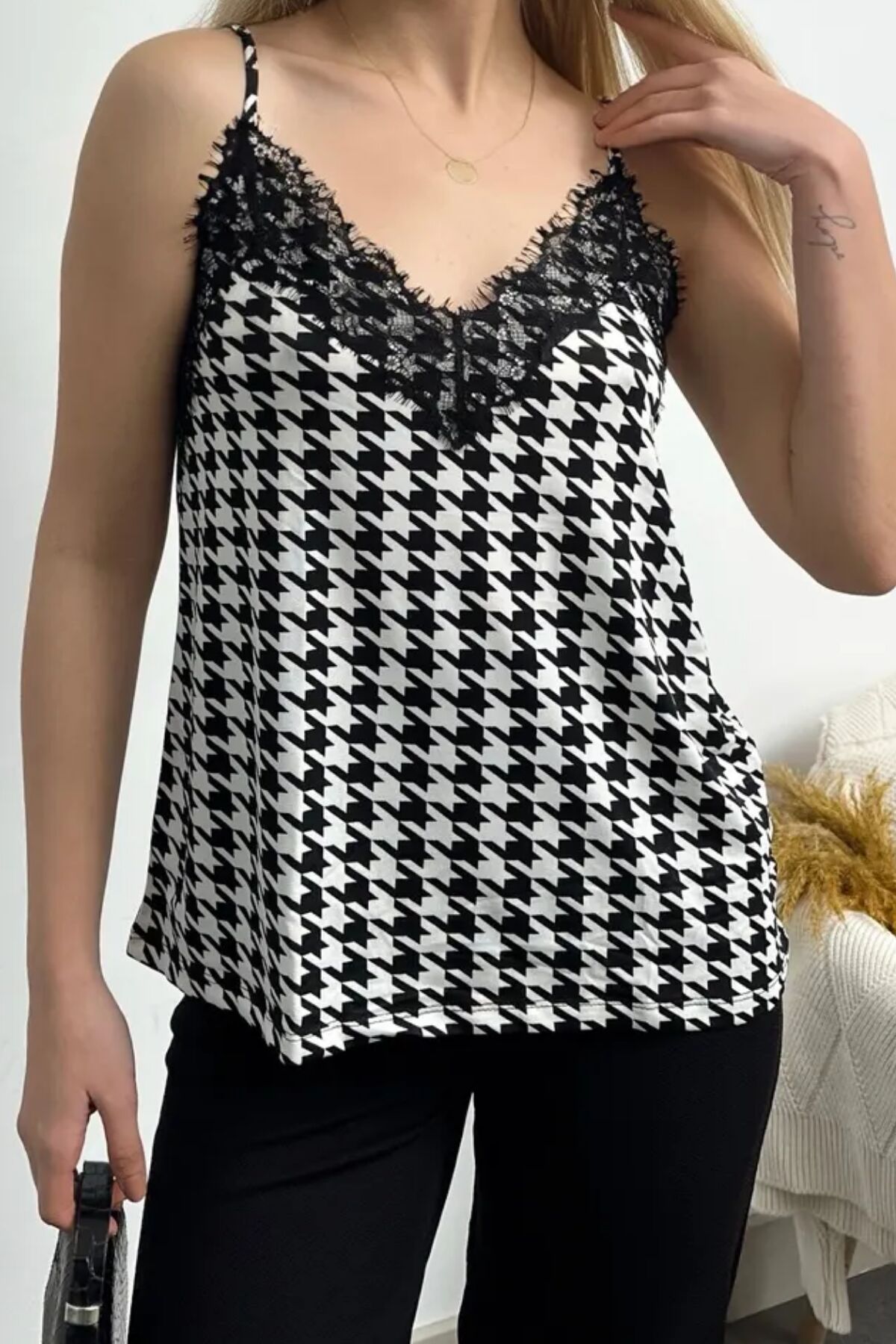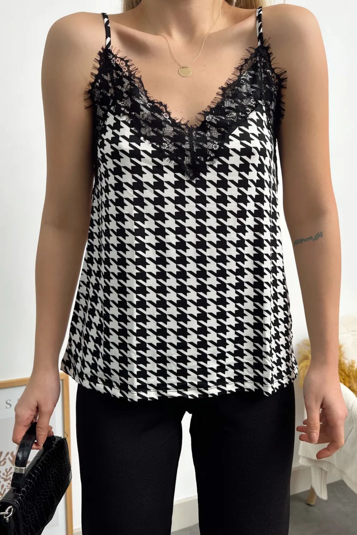 Şık ve zarif tasarımlarından biri olan dantel Yaka Askılı sandy Kadın Bluz,