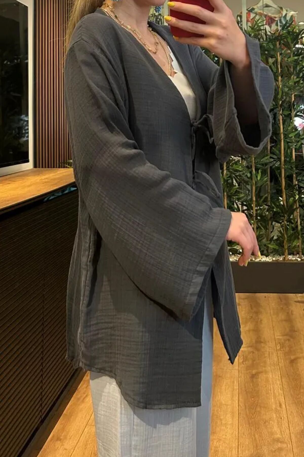 Balenbi Kadın Çift Bağlamalı Müslin Kumaş Kimono 1102- Sade ve şık tasarımıyla her ortama uyum sağlayan V yaka kimono.; - Rahatlıkla bağlanabilen ve kolayca ayarlanabilen çift bağlama detayı.; - Yaz ayları için ideal, hafif ve nefes alabilen dokuma kumaşı.; - Günlük kullanım için mükemmel olan düz kesim ve regular kalıp.; - %100 pamuk materyali sayesinde cildinizle dost bir deneyim sunar.; - Bağcıklı düğüm detayı ile hem konforlu hem de estetik bir görünüm sağlar.; - Düz deseniyle zamansız bir stil oluştururken, müslin dokusuyla doğal bir şıklık kazandırır.; - Günlük kullanım için ideal olan bu kimono, casual giyimin vazgeçilmez parçasıdır.;