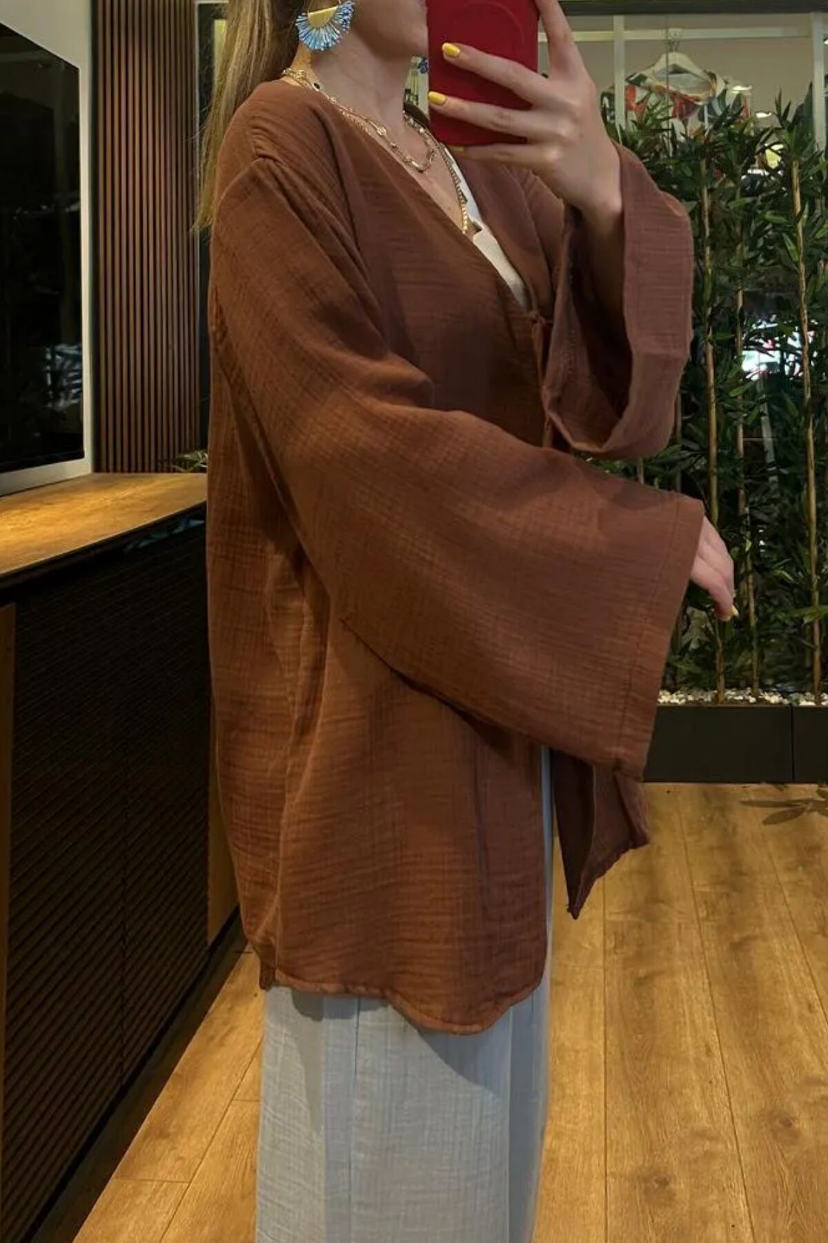 Balenbi Kadın Çift Bağlamalı Müslin Kumaş Kimono 1102- Sade ve şık tasarımıyla her ortama uyum sağlayan V yaka kimono.; - Rahatlıkla bağlanabilen ve kolayca ayarlanabilen çift bağlama detayı.; - Yaz ayları için ideal, hafif ve nefes alabilen dokuma kumaşı.; - Günlük kullanım için mükemmel olan düz kesim ve regular kalıp.; - %100 pamuk materyali sayesinde cildinizle dost bir deneyim sunar.; - Bağcıklı düğüm detayı ile hem konforlu hem de estetik bir görünüm sağlar.; - Düz deseniyle zamansız bir stil oluştururken, müslin dokusuyla doğal bir şıklık kazandırır.; - Günlük kullanım için ideal olan bu kimono, casual giyimin vazgeçilmez parçasıdır.;