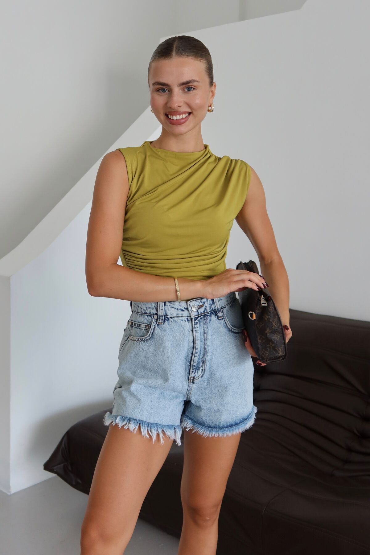 Balenbi Kadın Kolsuz Büzgü Detaylı Basic Sandy Bluz 1102 M - Oliv