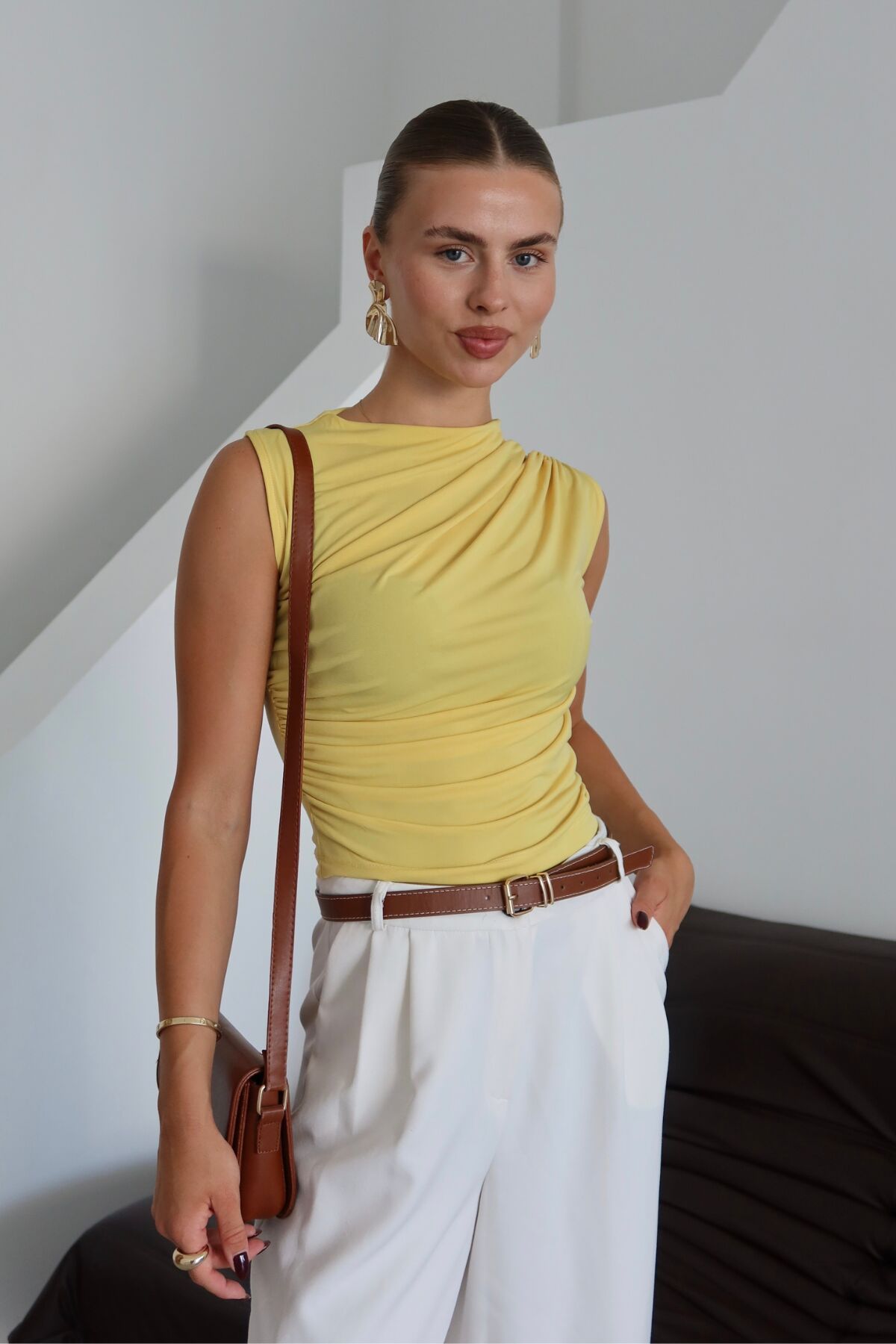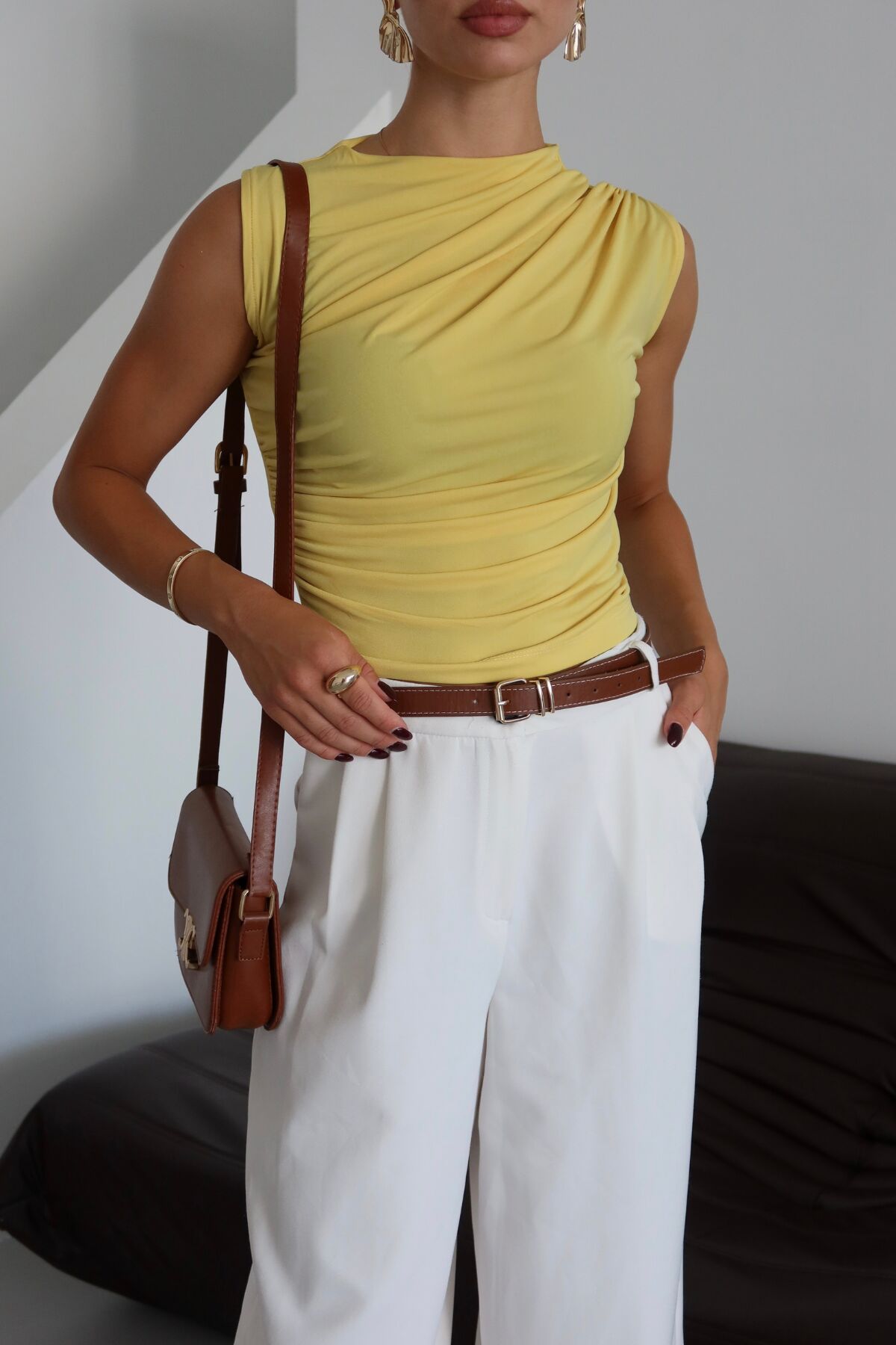 Balenbi Kadın Kolsuz Büzgü Detaylı Basic Sandy Bluz 1102 XL - Sarı