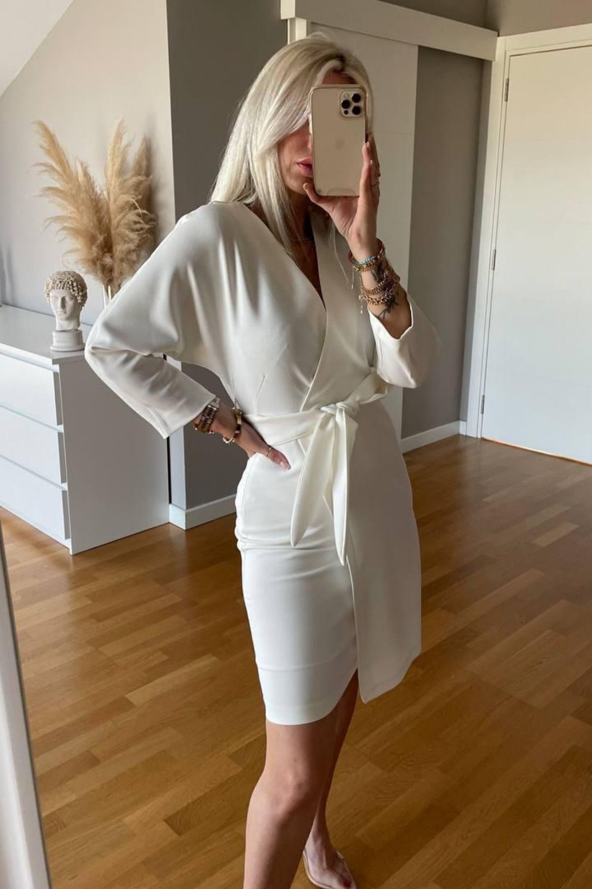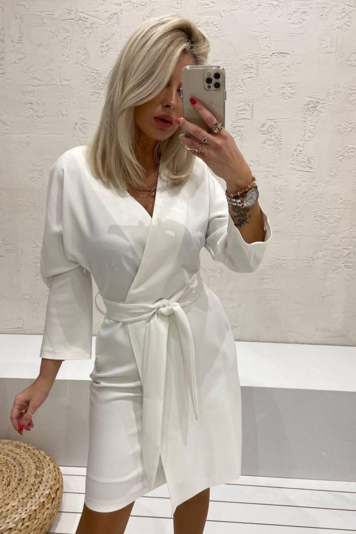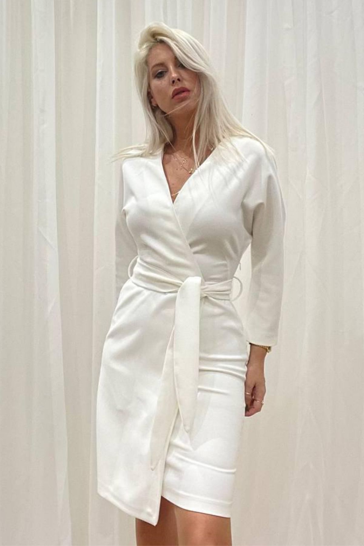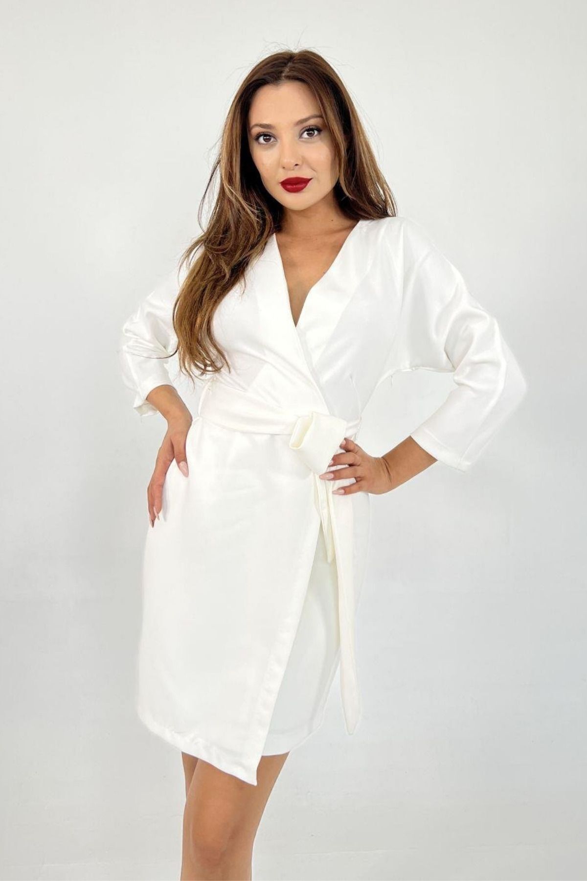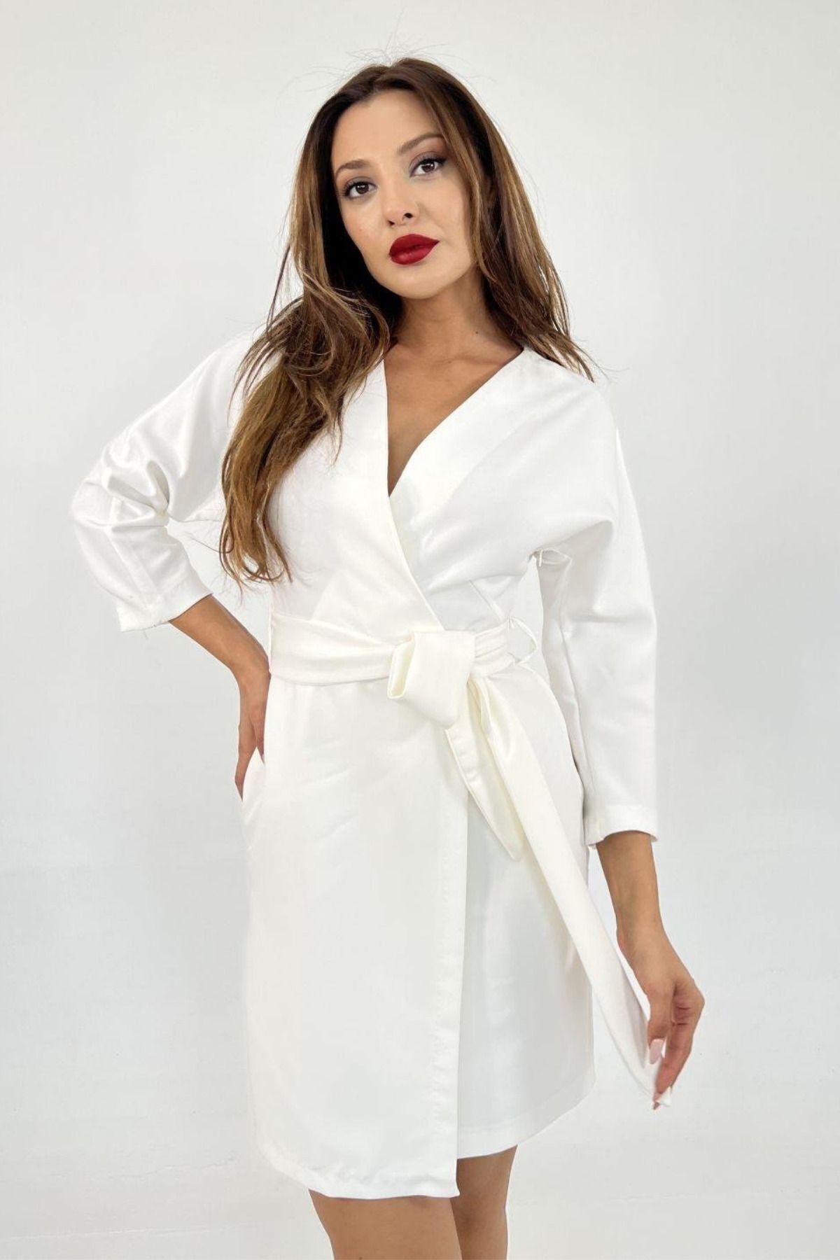 Balenbi Kadın Kruvaze Model Kuşaklı Double Krep Yazlık Elbise 1081 S - Ekru