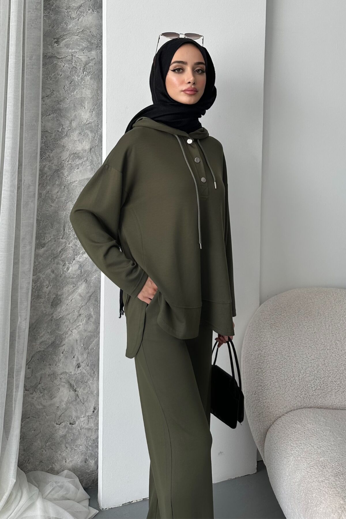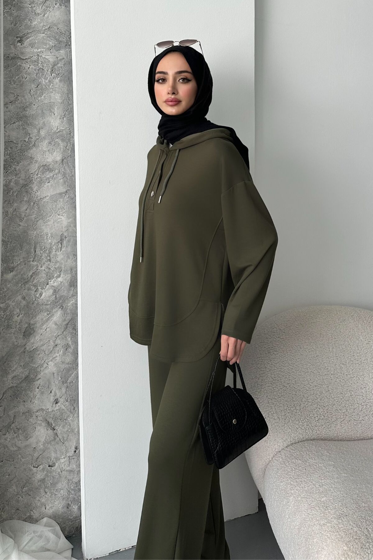 Balenbi Kadın Modal Kumaş Çıtlı Kapüşonlu Oversize Tunik Takım 1119 XL - Haki