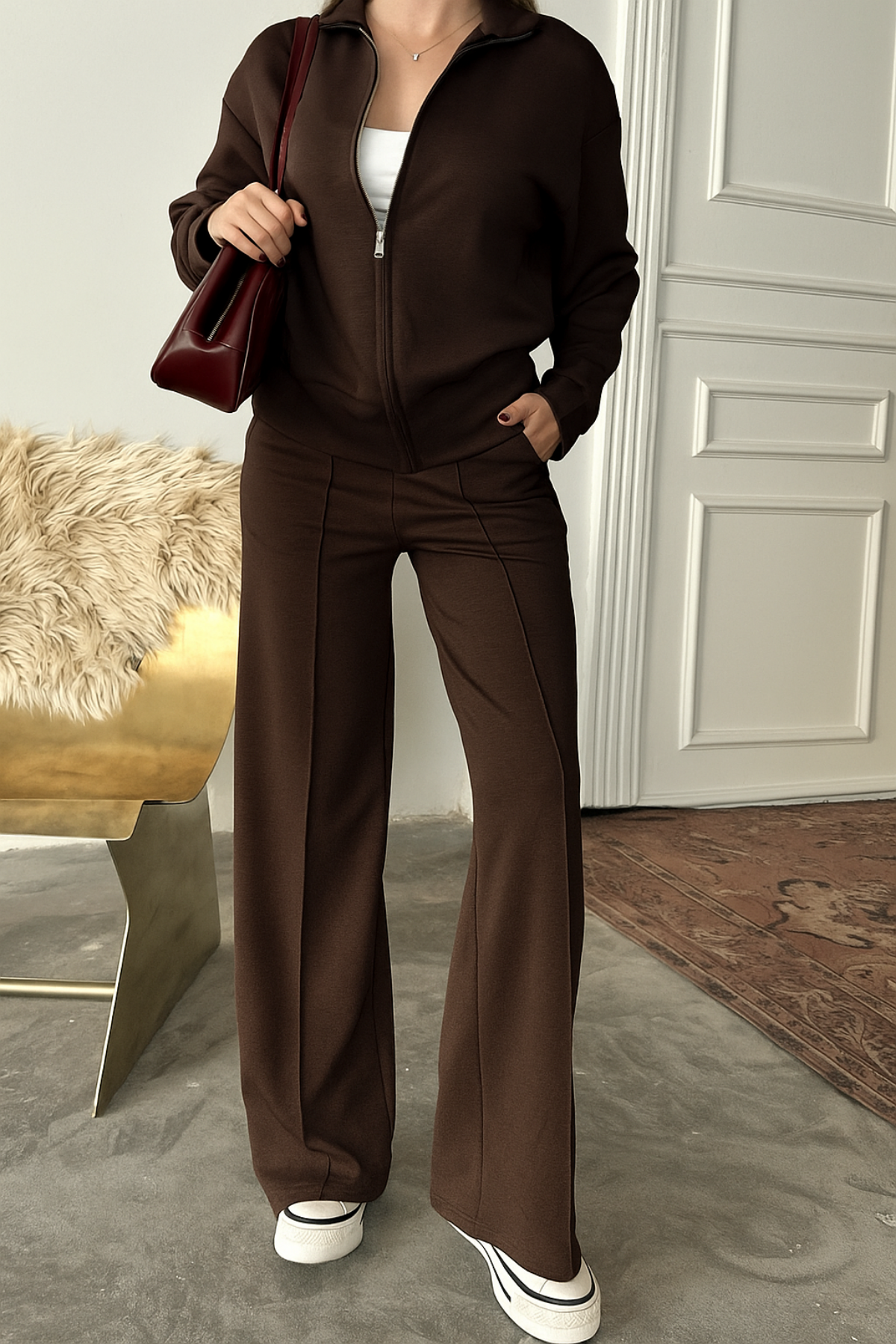 Balenbi Kadın Modal Kumaş Fermuarlı Dik Yaka Takım 1118 2XL - Kahverengi