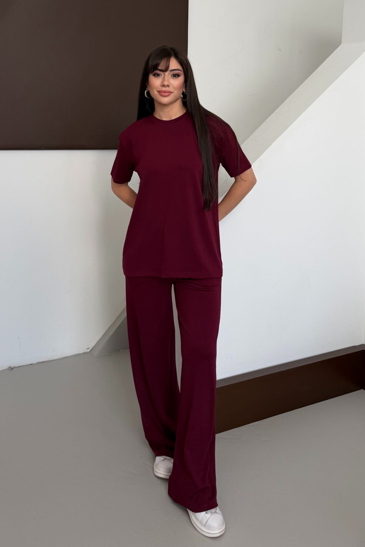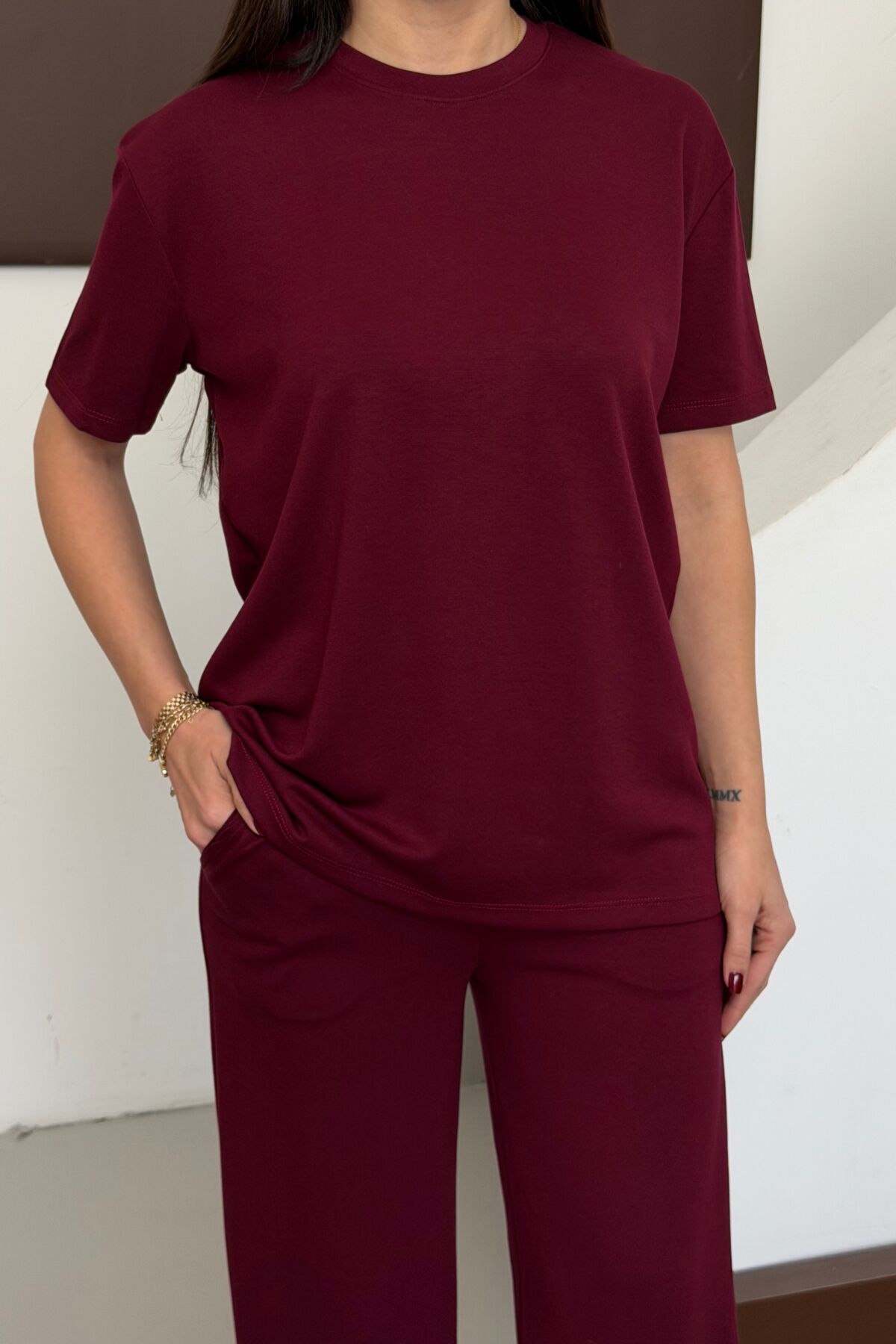 - T-shirt-eşofman alt-üst takımı olarak tasarlanmış olup, sportif şıklığa sahip kombinler yaratmanız için idealdir.