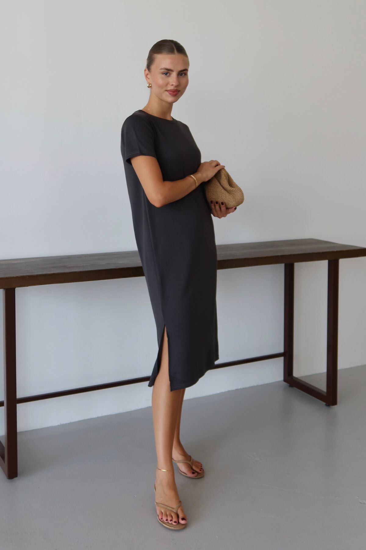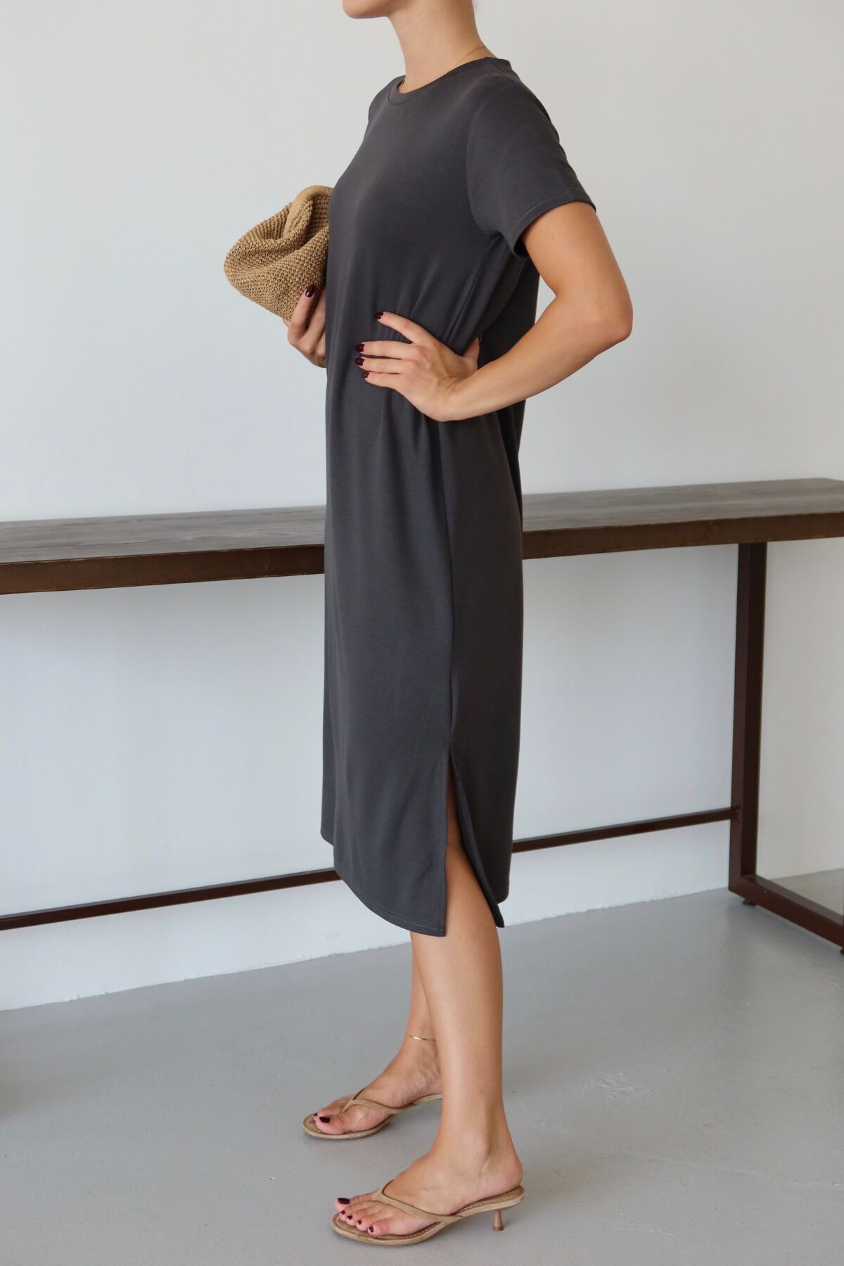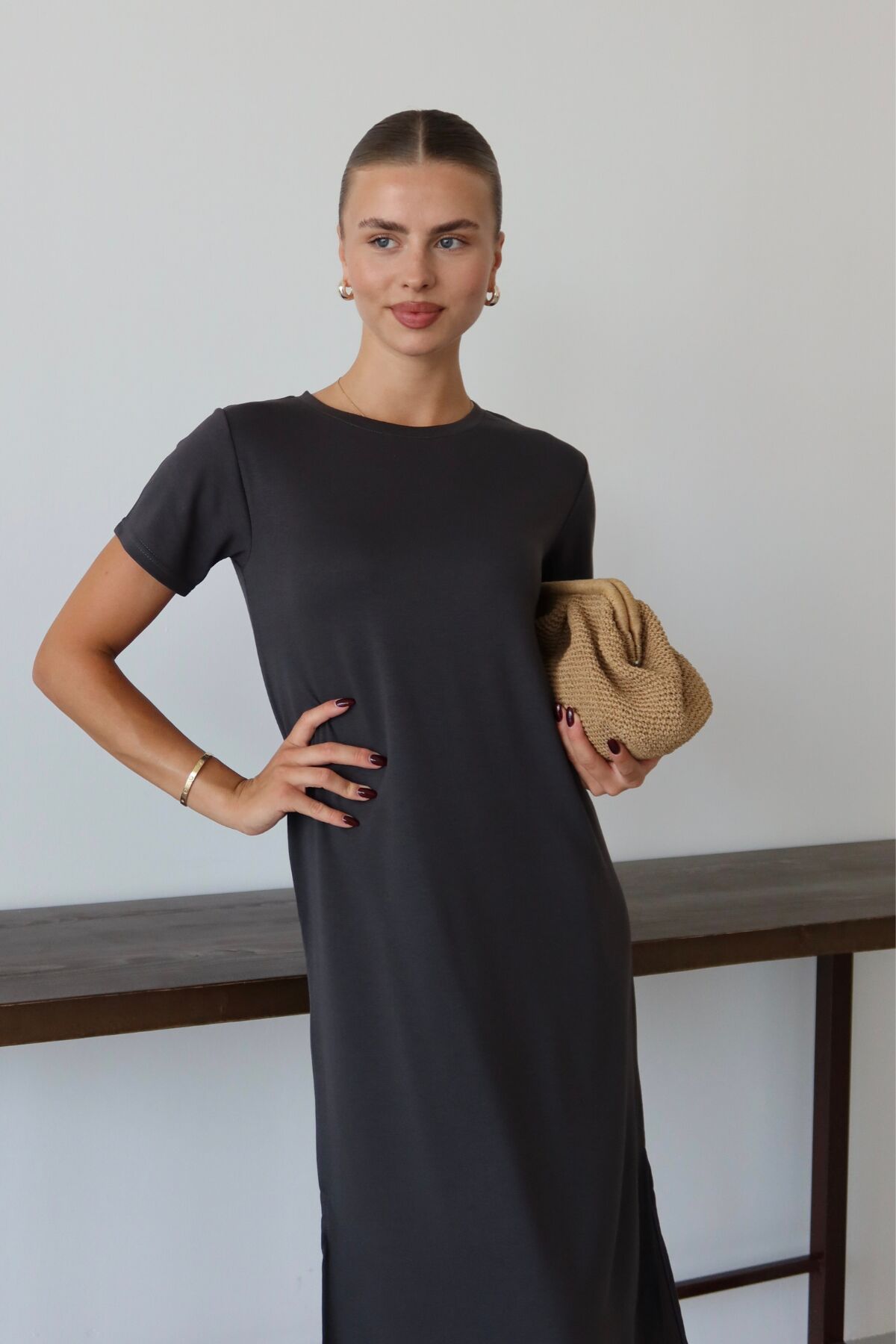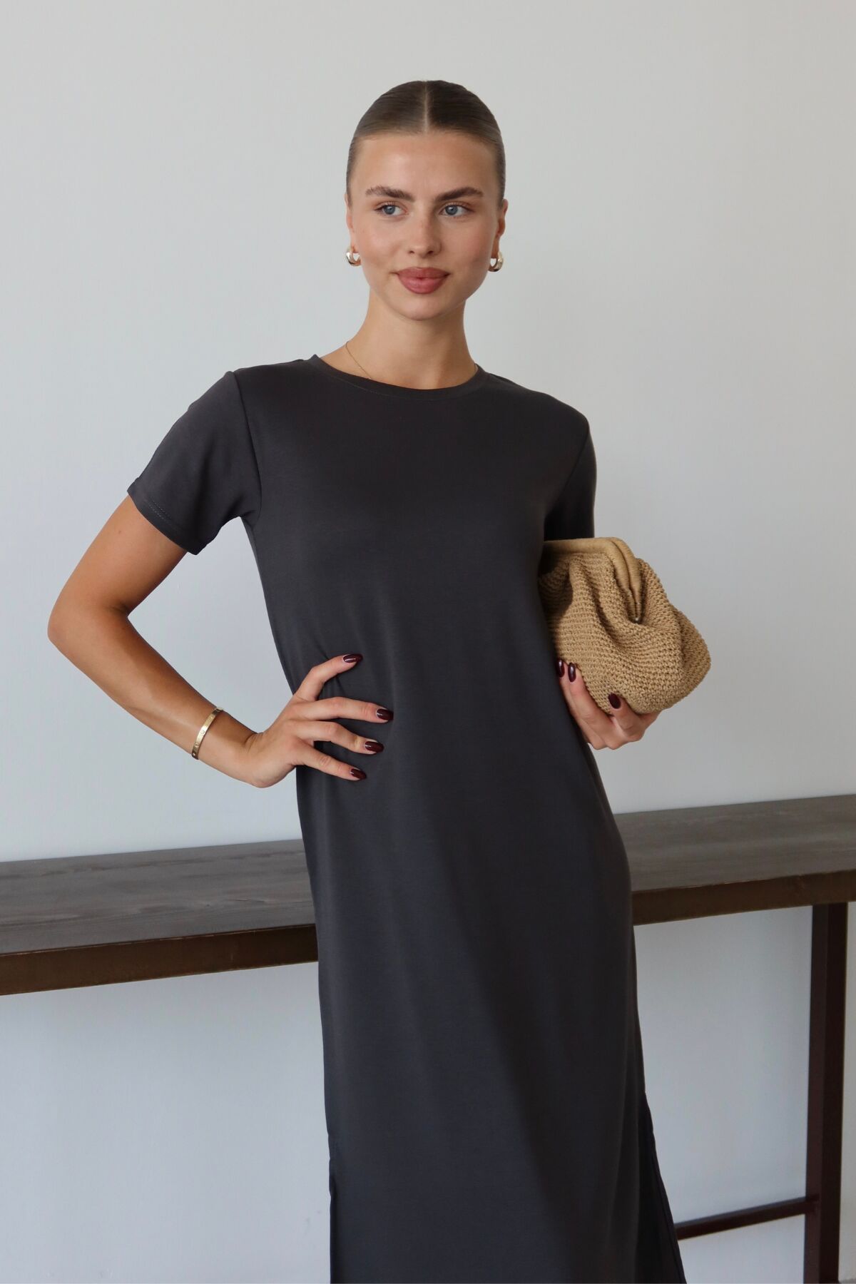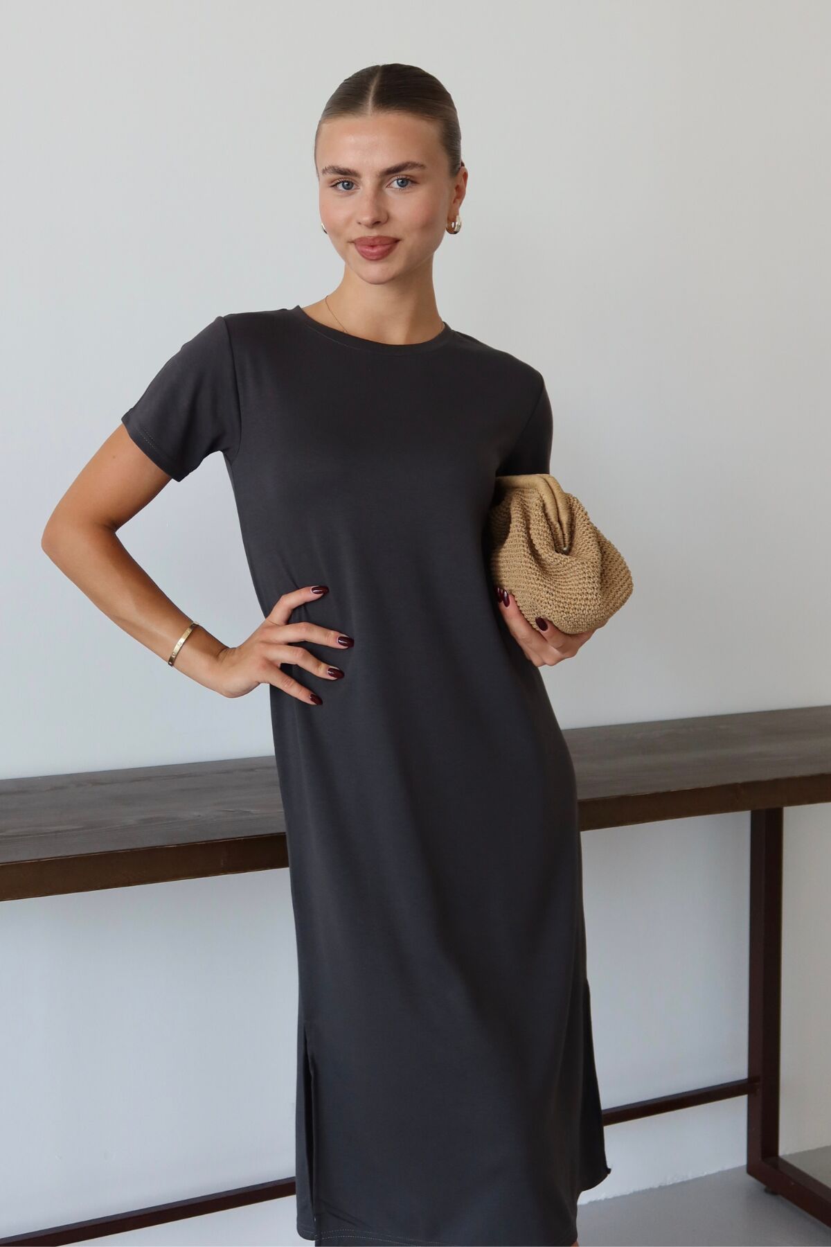 Balenbi Kadın Modal Kumaş Yarım Kol Yırtmaçlı Diz Altı Elbise 1100 S - Antrasit