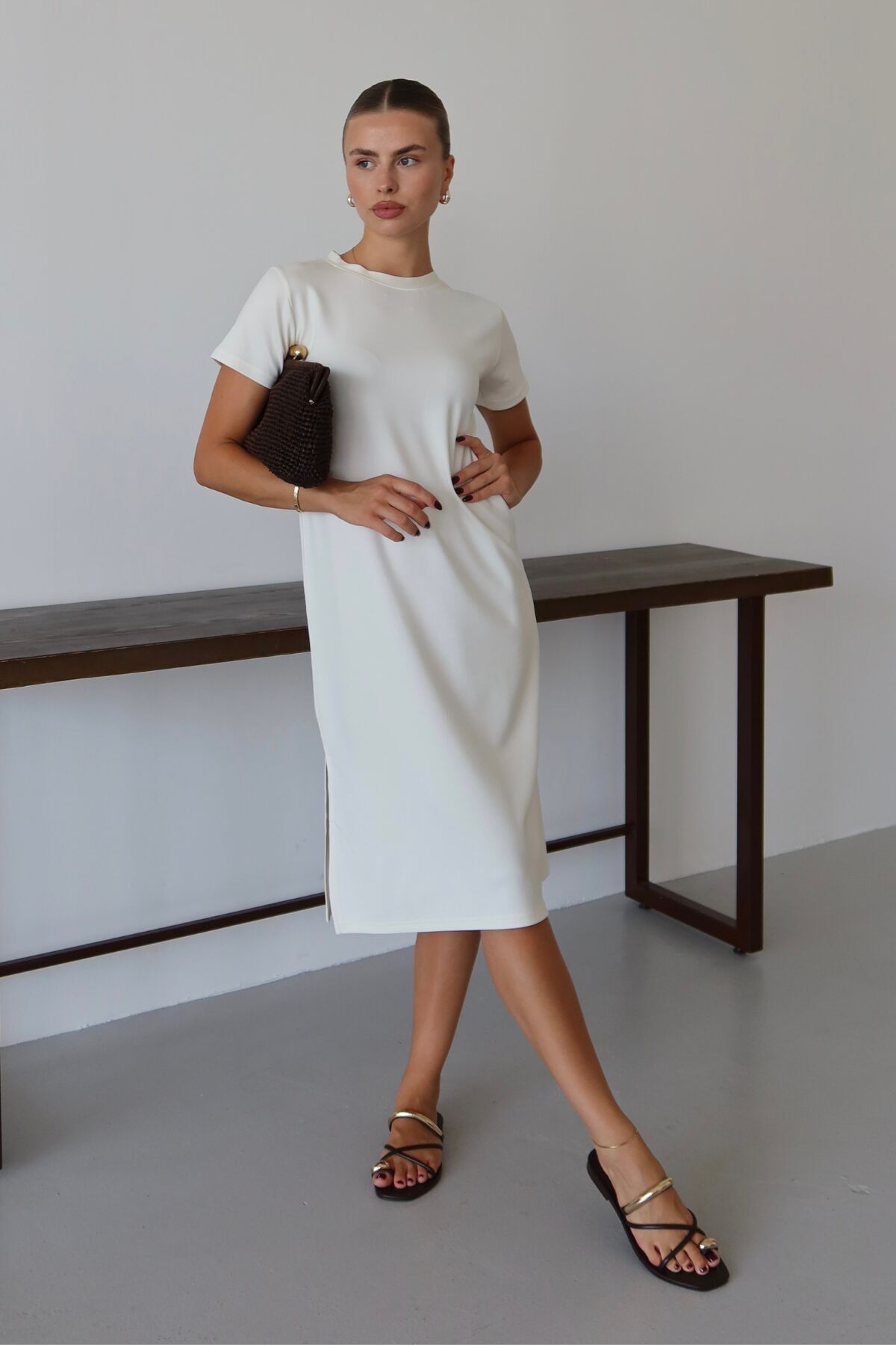 Balenbi Kadın Modal Kumaş Yarım Kol Yırtmaçlı Diz Altı Elbise 1100 S - Beyaz