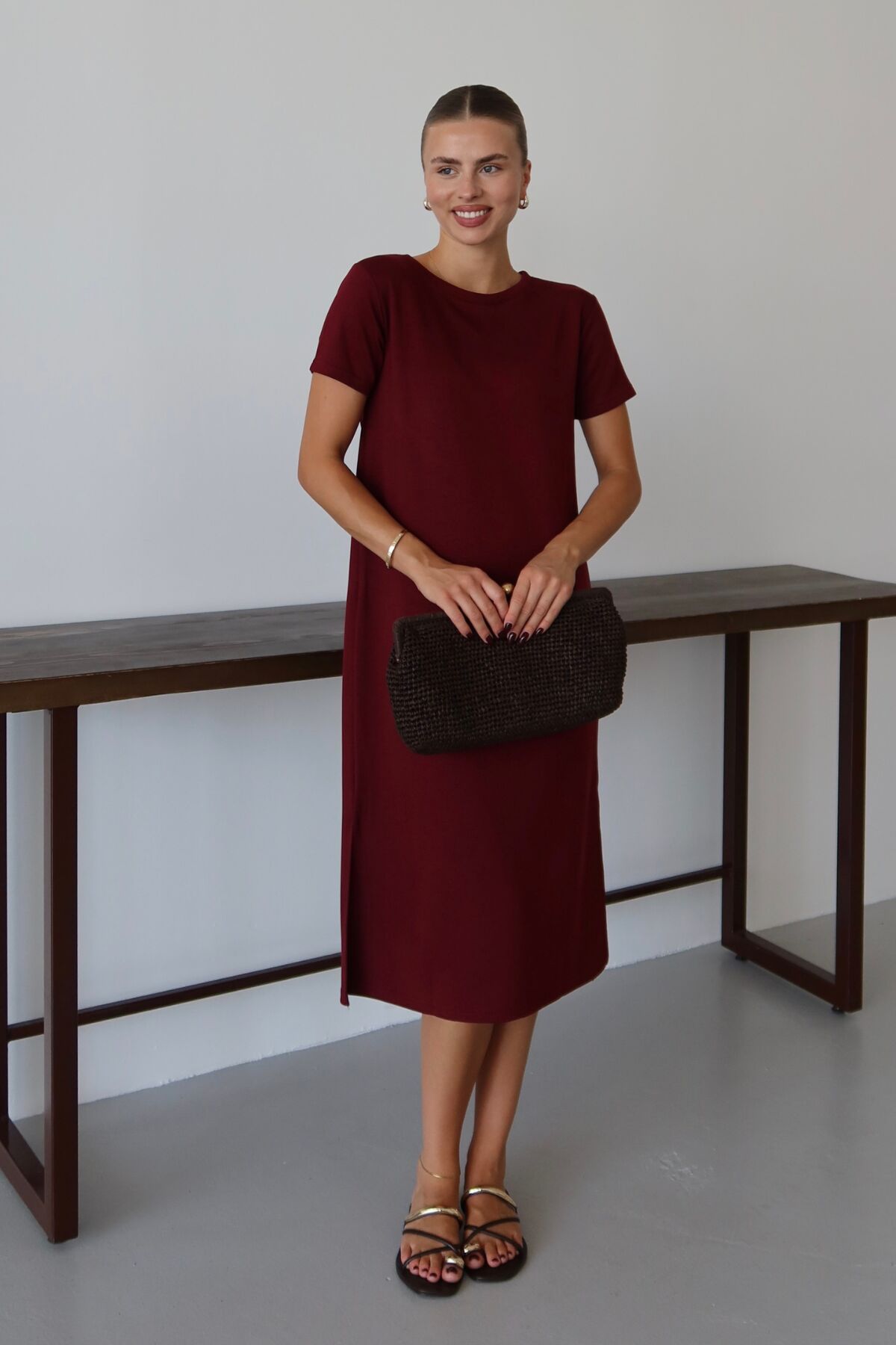 Balenbi Kadın Modal Kumaş Yarım Kol Yırtmaçlı Diz Altı Elbise 1100 S - Bordo