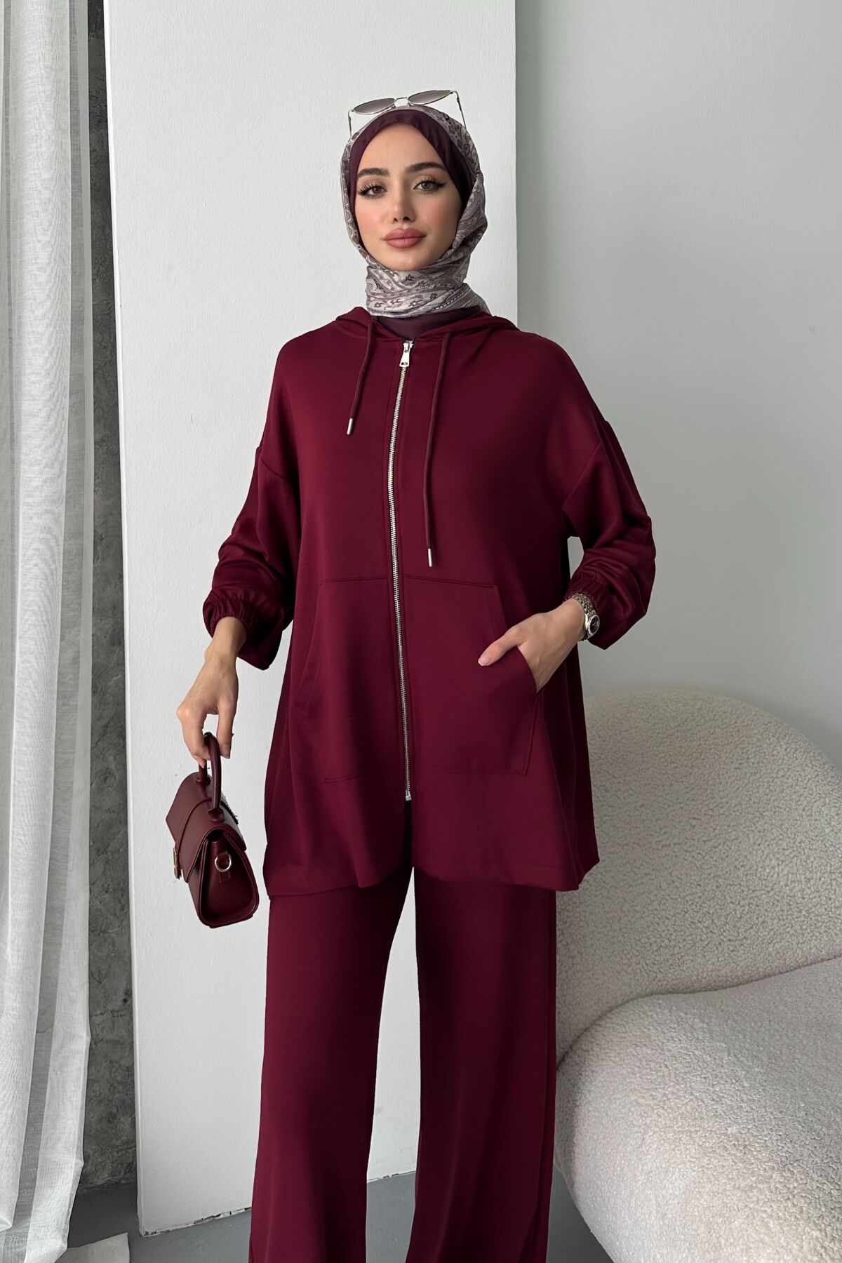 Balenbi Kadın Modal Penye Oversize Kapüşonlu Tesettür Tunik Takım 1108 L - Bordo