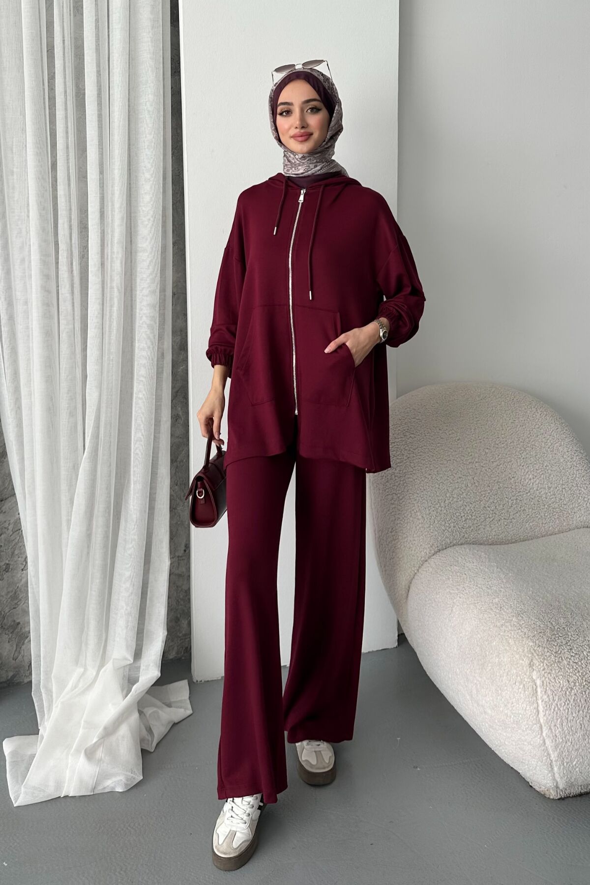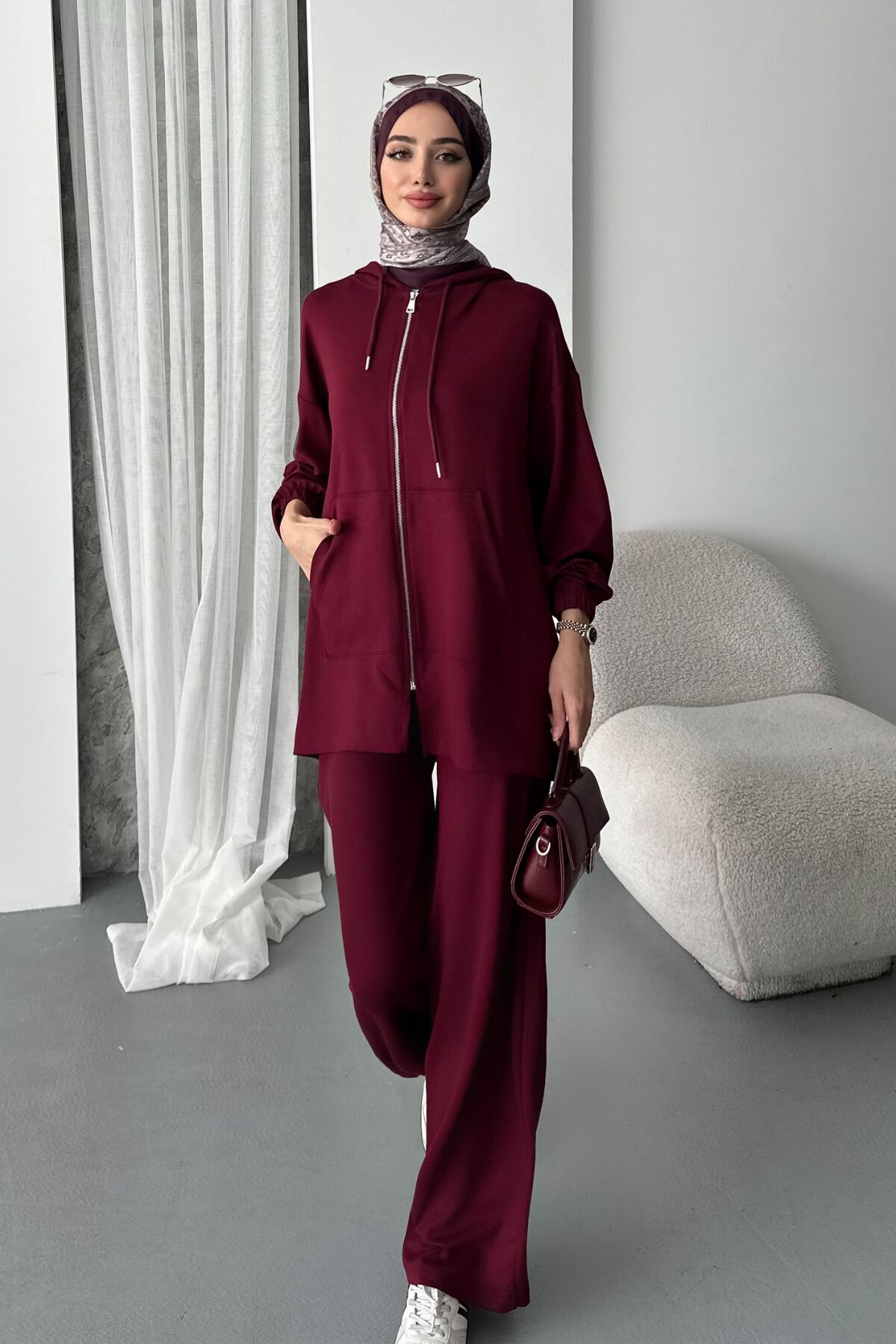 Balenbi Kadın Modal Penye Oversize Kapüşonlu Tesettür Tunik Takım 1108 - Rahatlık ve şıklığı bir arada sunan oversize kapüşonlu tunik takım, günlük kullanım için idealdir.; - Cep detayları ile fonksiyonel bir tasarım sunarken, çift cepli yapısı pratik eşyalarınız için kolay erişim sağlar.; - Orta kalınlıkta modal penye kumaşı sayesinde mevsim geçişlerinde konforlu bir deneyim yaşatır.; - Kapüşonlu yaka tipi ile hem stil sahibi görünmenizi hem de soğuktan korunmanızı sağlar.; - Full fermuar kapama özelliğiyle kolayca giyilip çıkartılabilir; pratik kullanım sunar.; - Bel kısmındaki lastik detayı sayesinde rahat bir oturuşa sahip olup vücut hatlarınıza uyum sağlar.; - İki parçadan oluşan set içeriğiyle bütünsel bir kombin imkanı tanır; tunik-pantolon ikilisiyle tamamlanan bu takım, casual ortamlarda şıklığınızı korumanızda yardımcı olur.; - Sürdürülebilirlik açısından dikkat çekmese de, dayanıklı malzemelerden üretilmiştir; uzun süreli kullanım vaad eder.; - Baskısız deseniyle sade ve zamansız bir tarz sergilerken, düz renk seçeneğiyle farklı aksesuarlarla kolayca kombinlenebilir.; - Her sezon tercih edebileceğiniz bu tunik takımı, geniş paça pantolonuyla modern bir siluet oluşturur.; - Yıkama talimatlarına uygun şekilde bakımı yapıldığında formunu koruyarak ilk günkü gibi kalacaktır.;