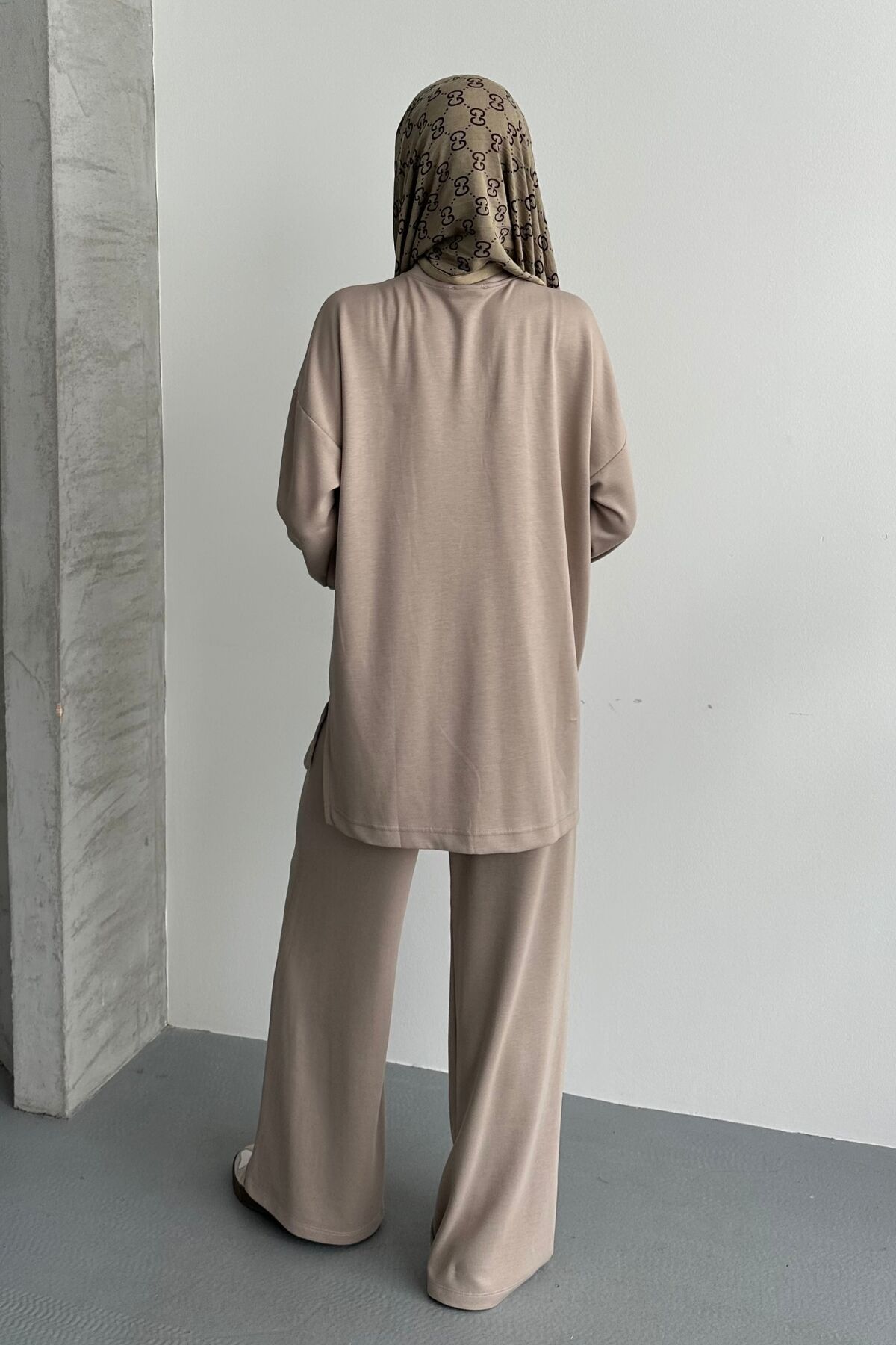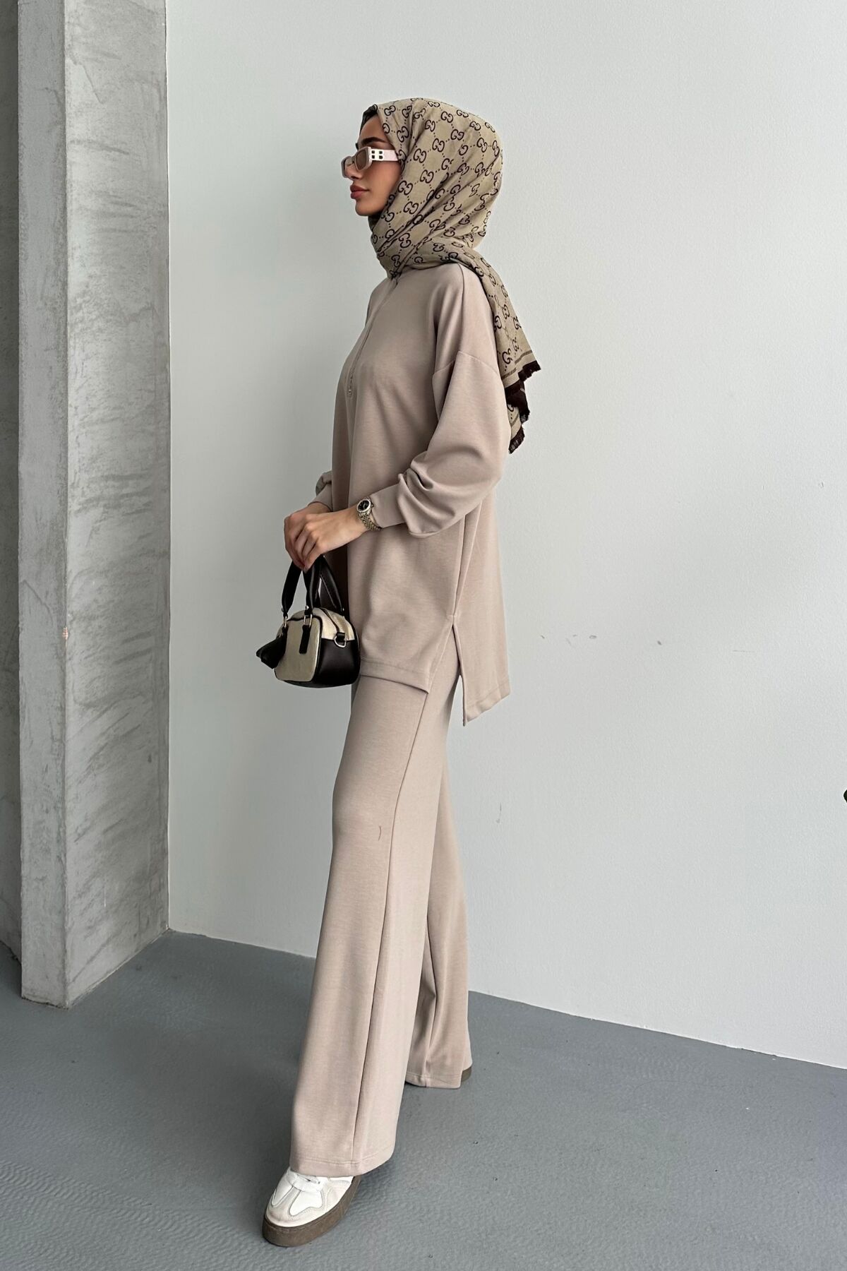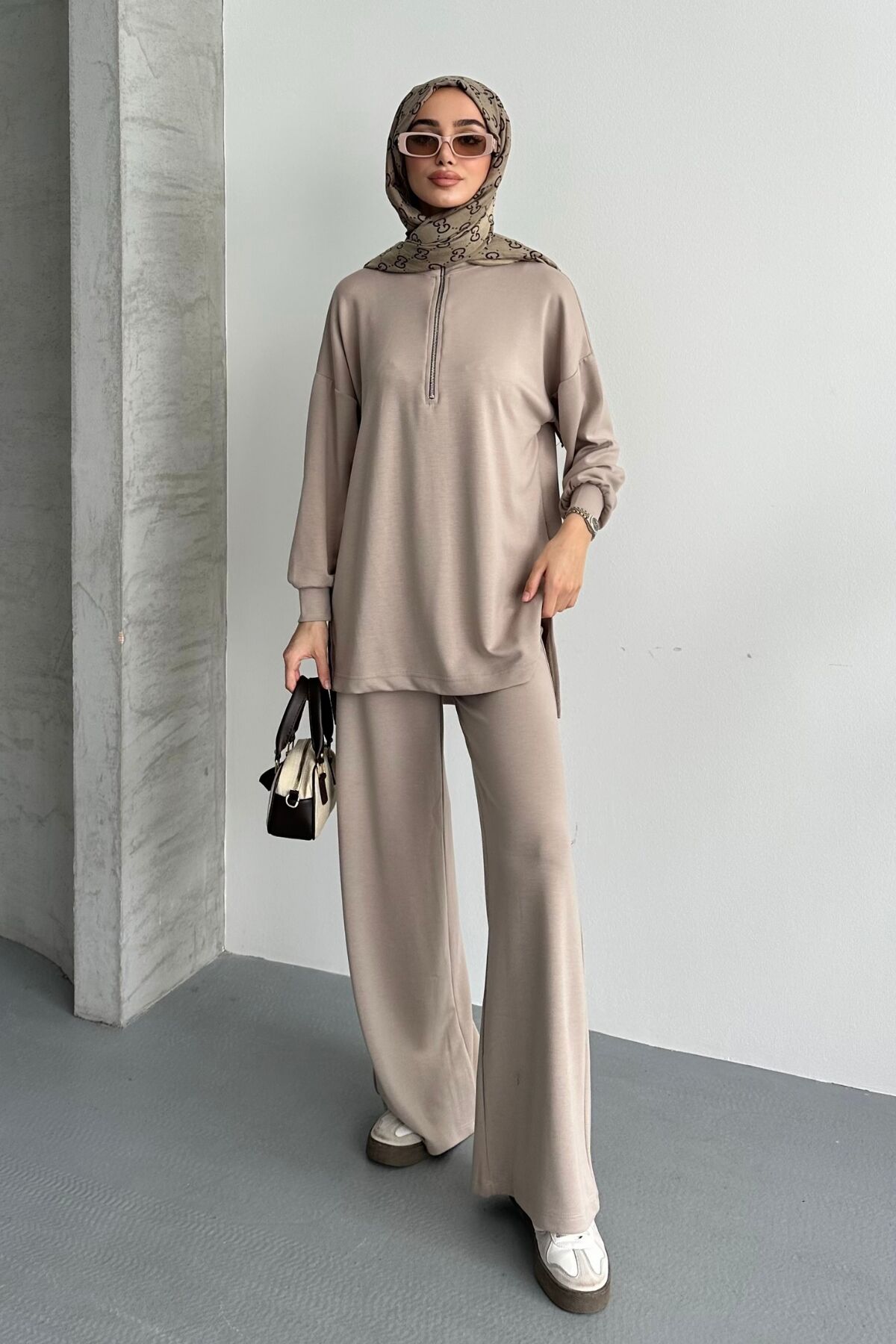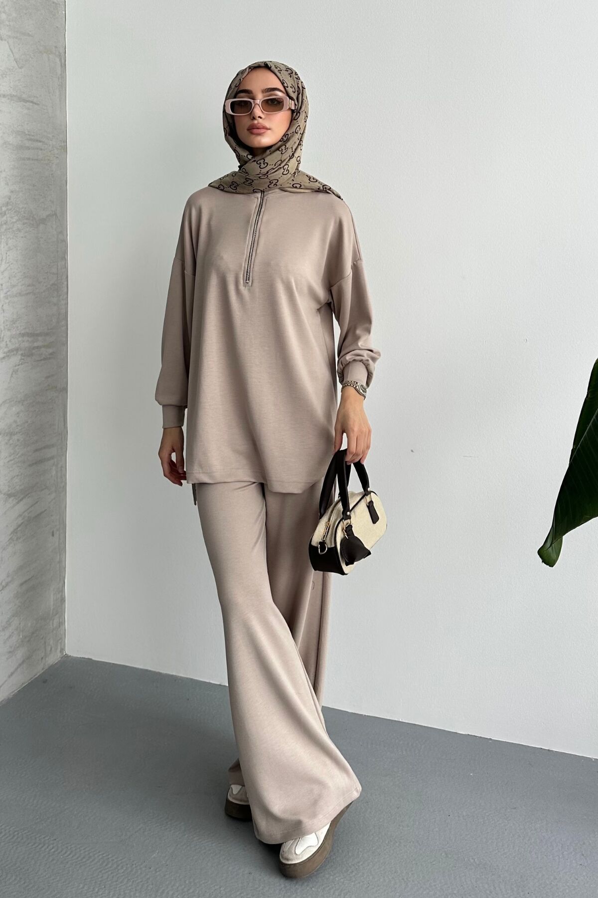 Balenbi Kadın Modal Penye Oversize Metal Fermuar Tesettür Tunik Takım 1117 S - Bej