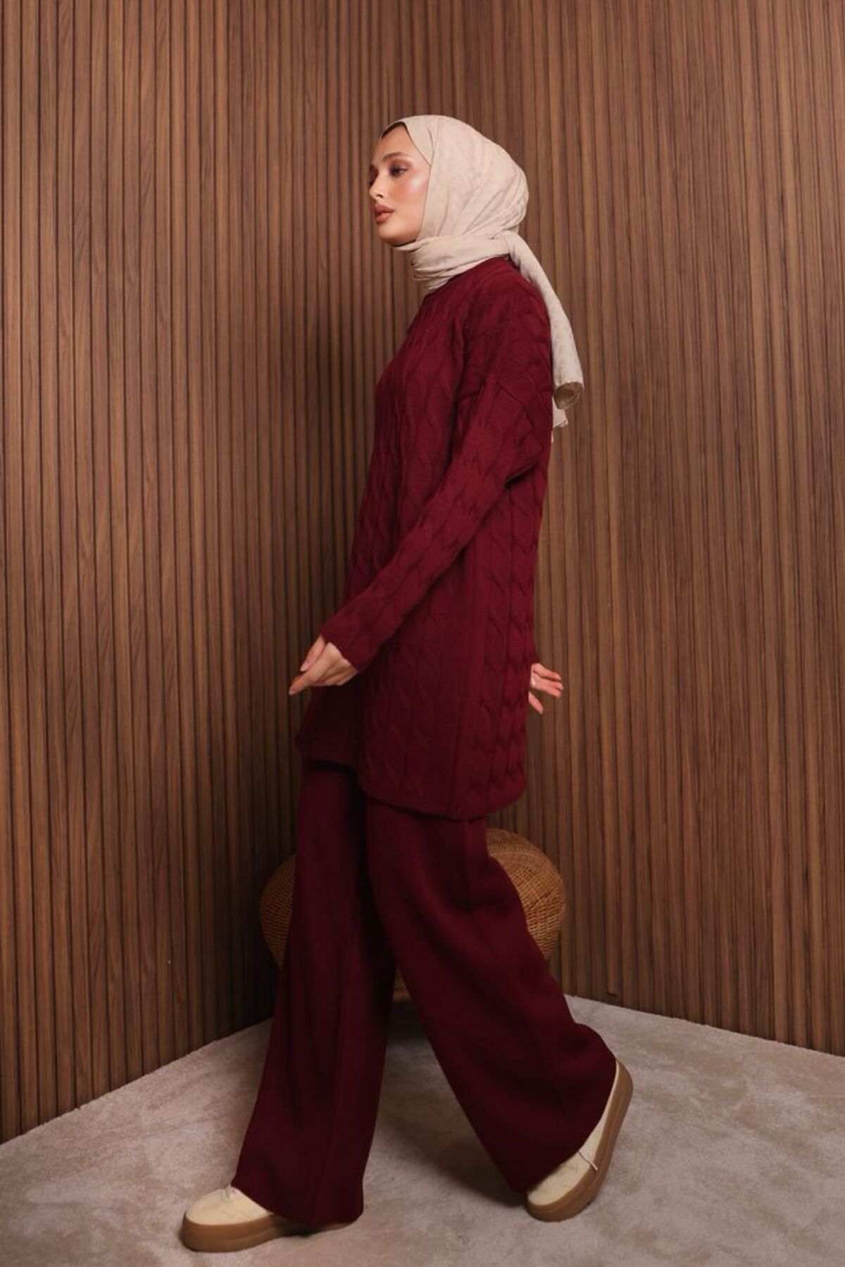 Balenbi Kadın Oversize Saç Örgü Desen Pantolonlu Tesettür Triko Takım 1135 Standart - Bordo