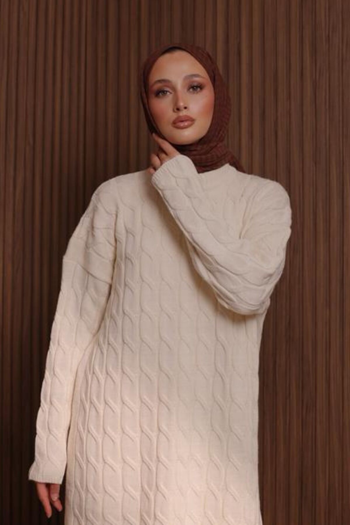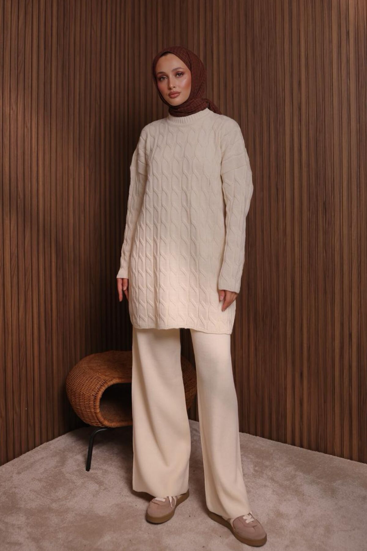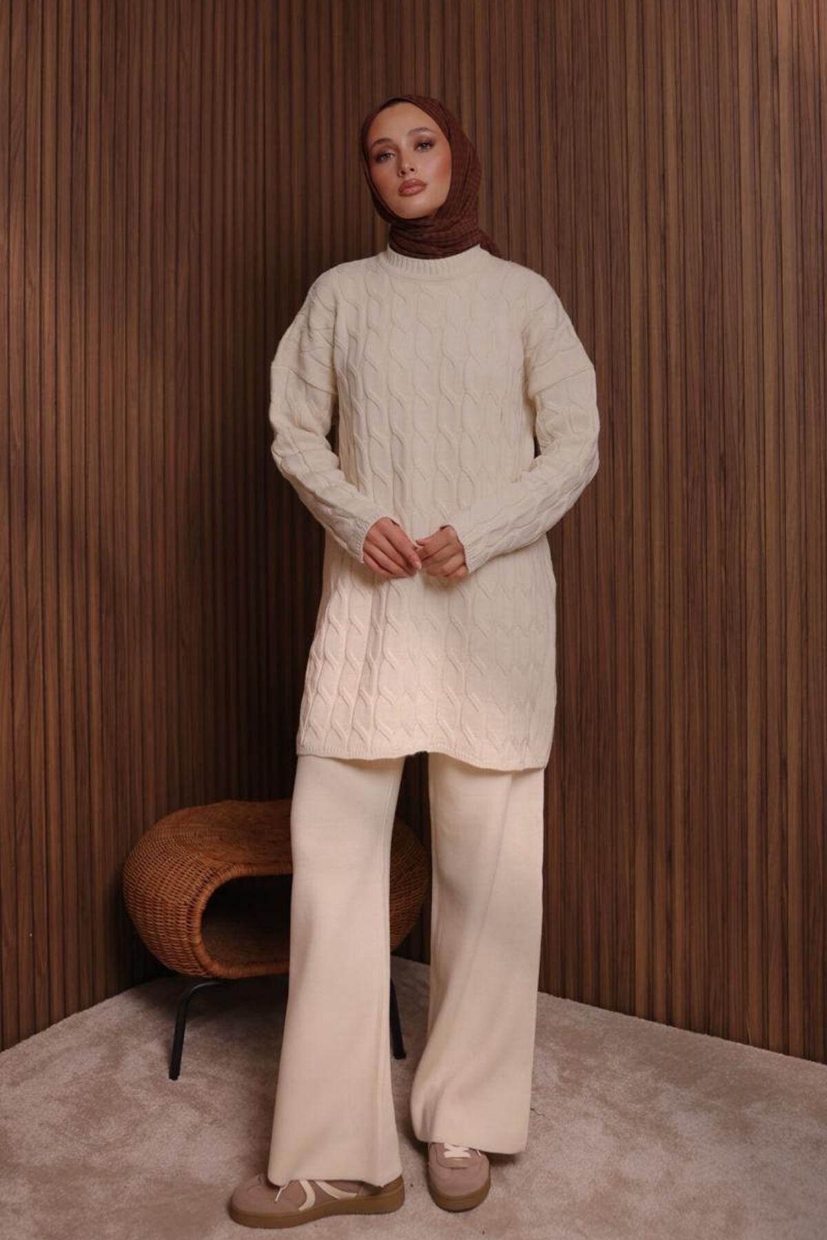 Balenbi Kadın Oversize Saç Örgü Desen Pantolonlu Tesettür Triko Takım 1135 Standart - Krem