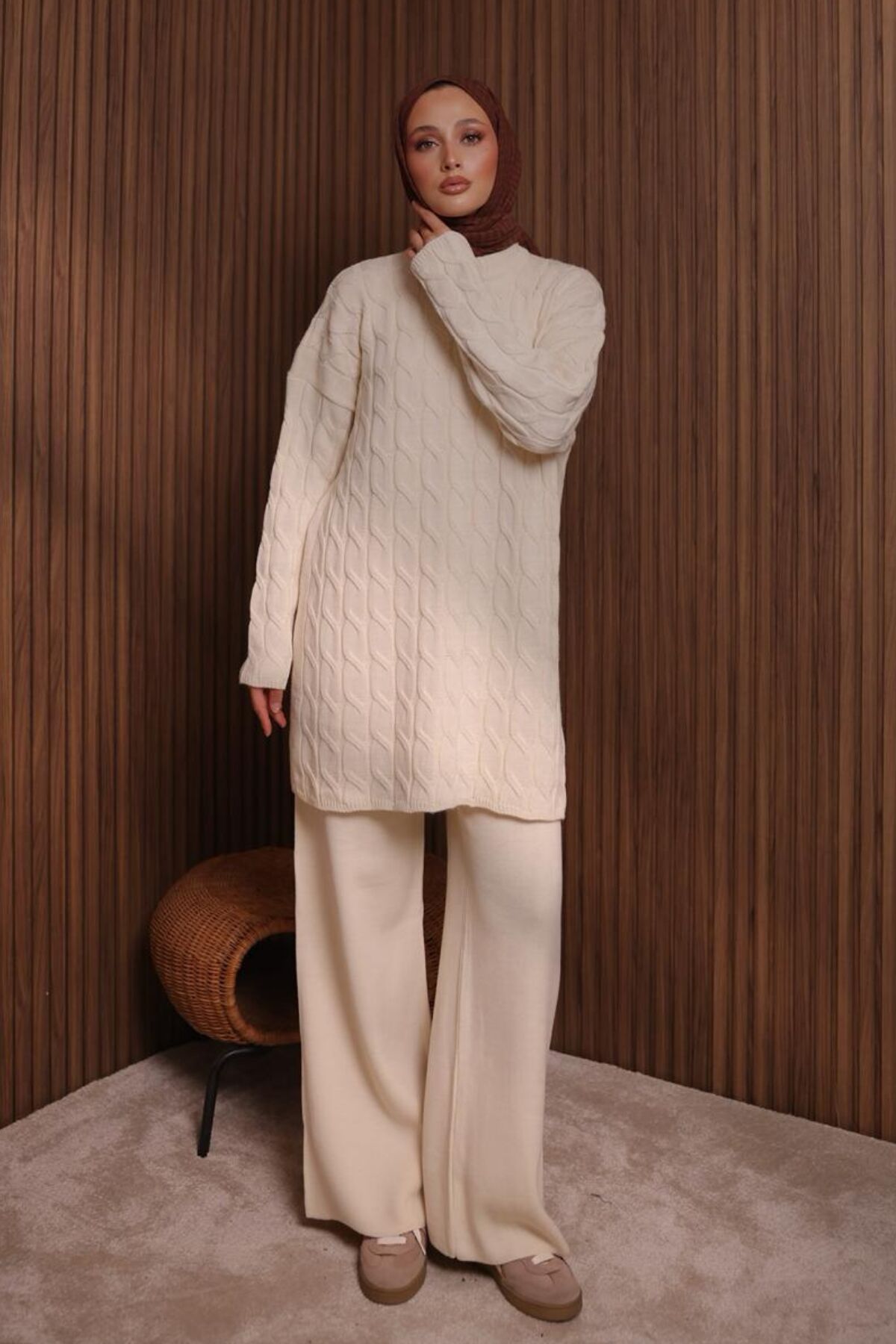 Balenbi Kadın Oversize Saç Örgü Desen Pantolonlu Tesettür Triko Takım 1135 - Saç örgüsü deseniyle modern ve şık bir görünüm sunar.; - Tesettür giyim tarzına uygun, rahat ve kullanışlı bir tasarıma sahiptir.; - Alt ve üst parçadan oluşan takım, kolay kombin yapma imkanı sağlar.; - Belirgin bir yaka tipi ile zarif bir boyun hattı oluşturur.; - Cep detayları pratik kullanım için tasarlanmıştır.; - Sürdürülebilirlik detayları ile çevre dostu bir seçenek sunar.;