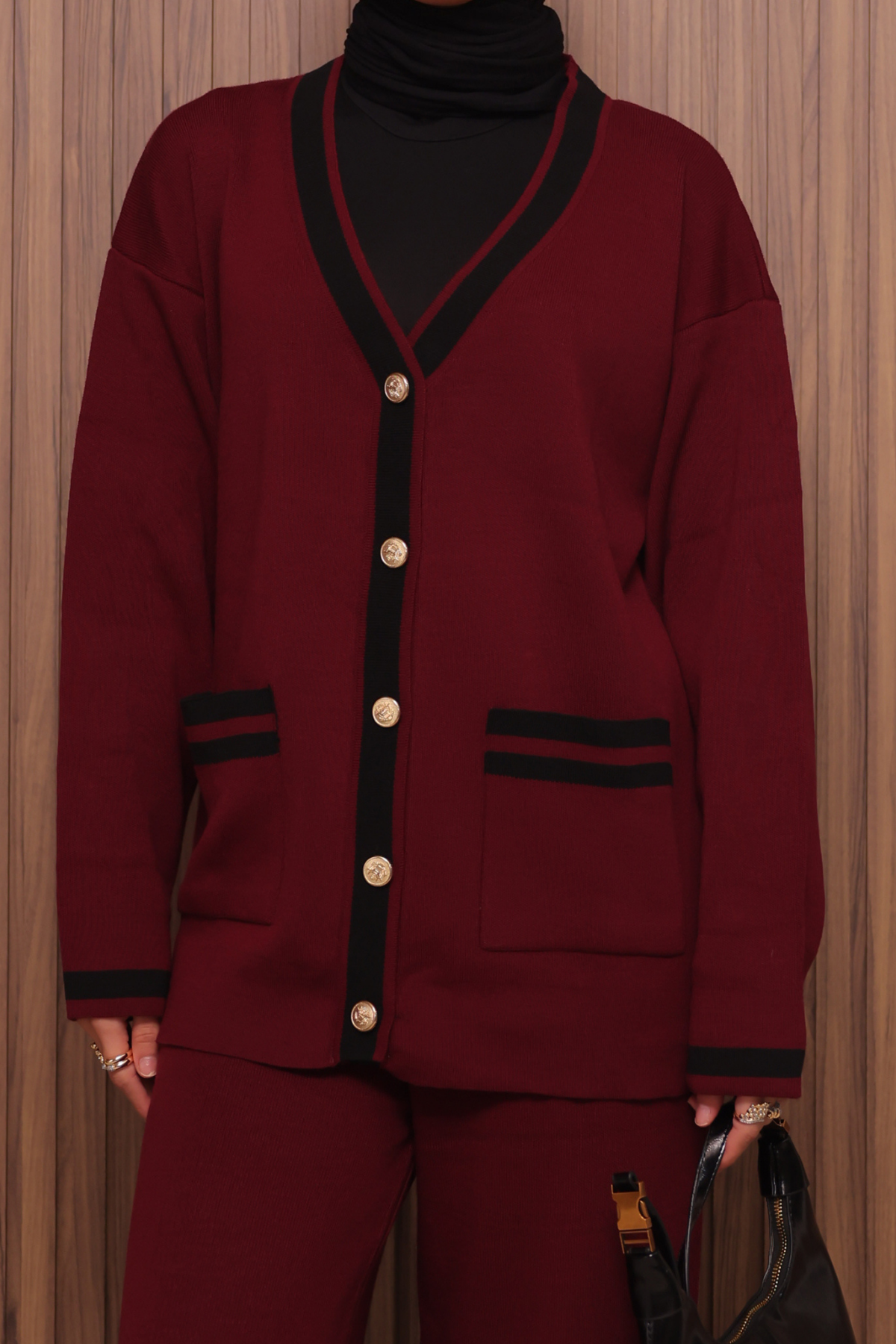 Balenbi Kadın Oversize Sık Örgü V Yaka Hırkalı Tesettür Triko Takım 1148 Standart - Bordo