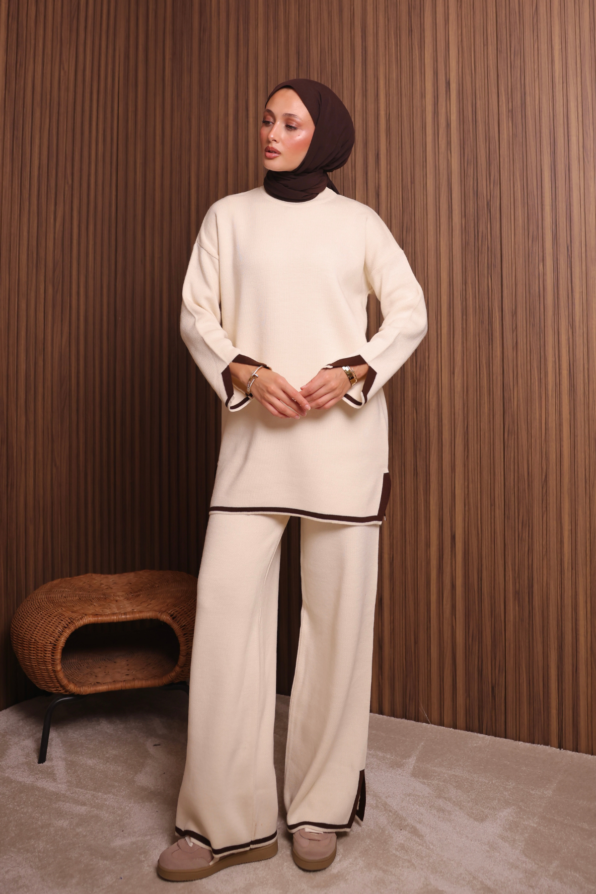 Balenbi Kadın Oversize Düz Dokuma Yırtmaçlı Tesettür Triko Takım 1146 - Düz örgüsü dokuma tipi ile şık ve modern bir görünüm sunar.; - Oversize kesimi sayesinde rahat hareket etme özgürlüğü sağlar.; - Düz deseniyle sade ve zamansız bir stil yaratır.; - Yırtmaç detayları ile feminen bir dokunuş ekler.; - Tesettür giyim tarzına uygun olarak tasarlanmıştır.; - Alt ve üst parçadan oluşan takım halinde sunulur, kombin yapmayı kolaylaştırır.;