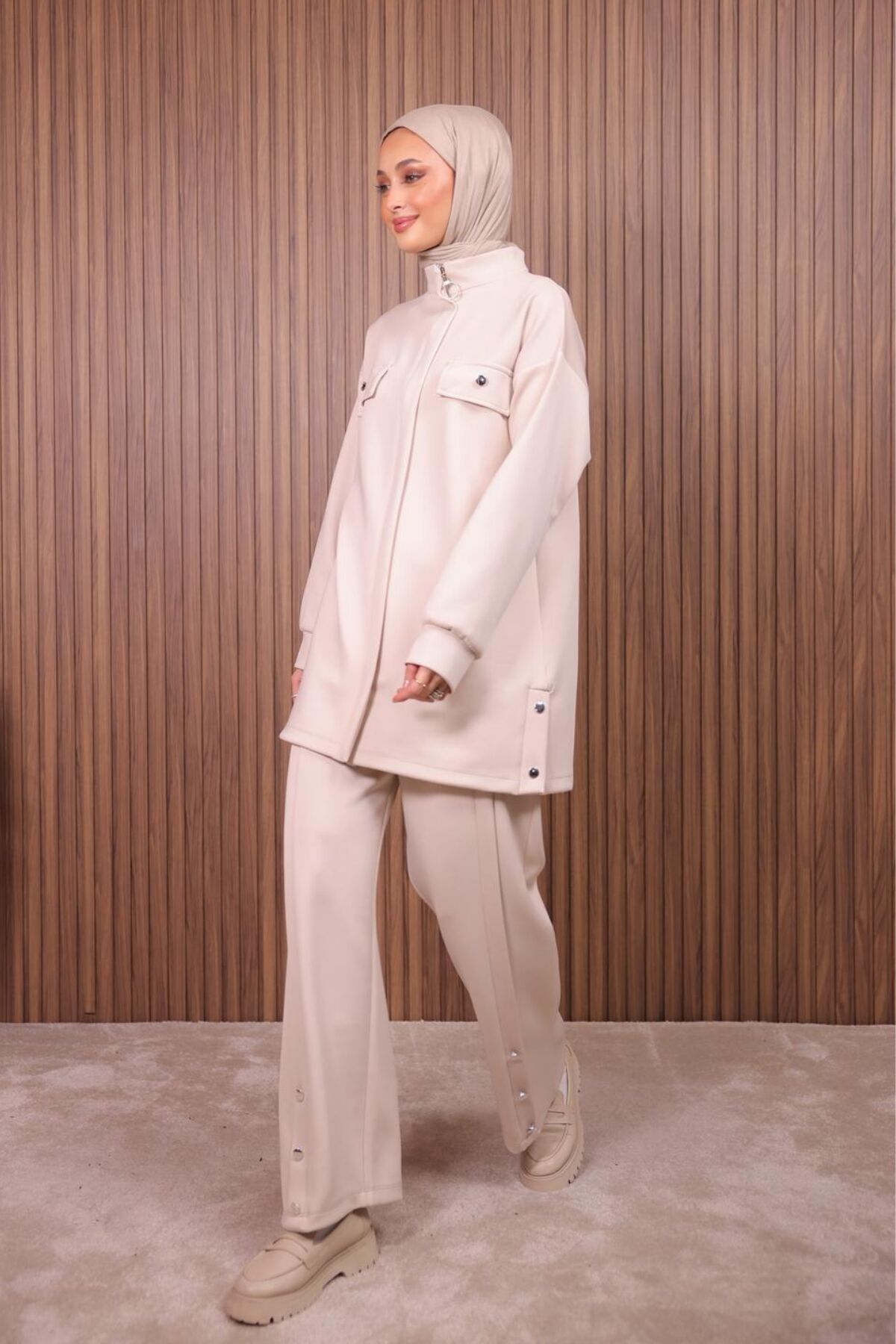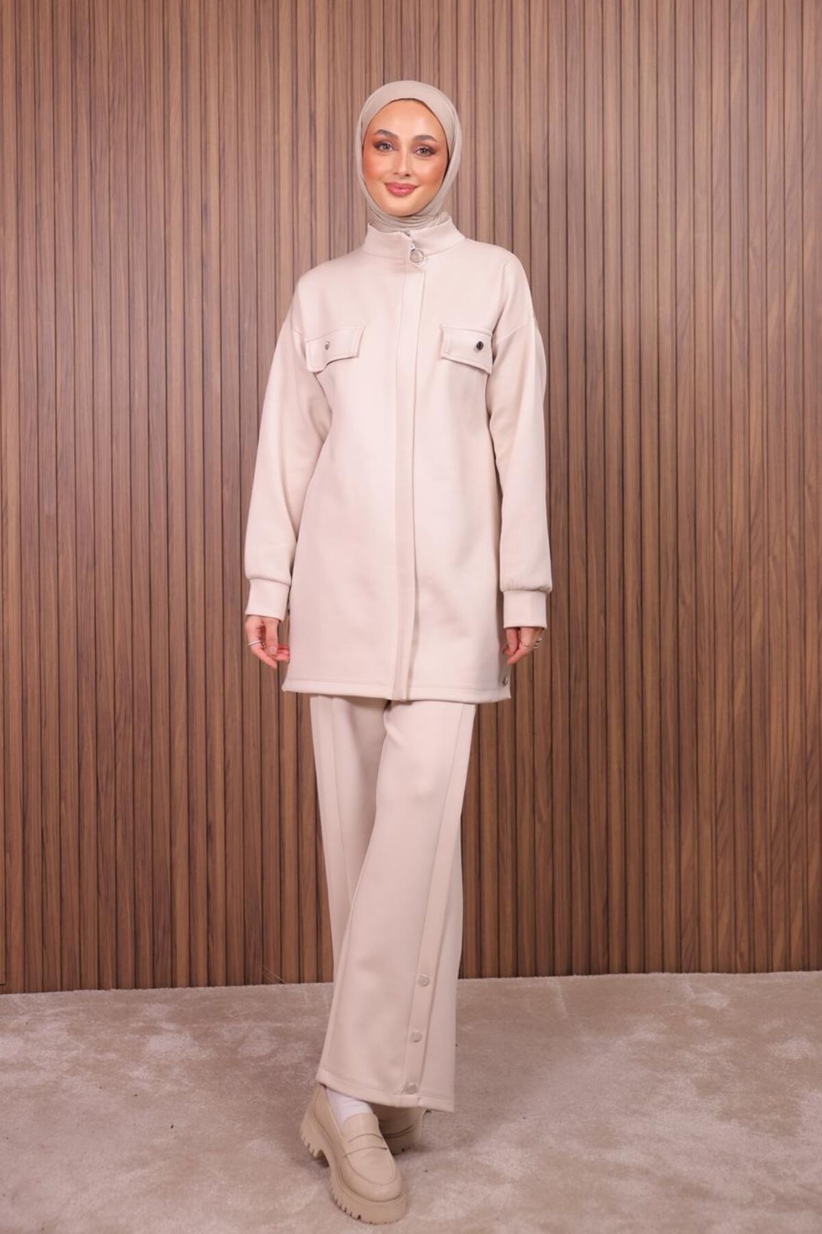 Balenbi Kadın Scuba Kumaş Pantolon Düğme Detaylı Tesettür Takım 1122 M - Bej