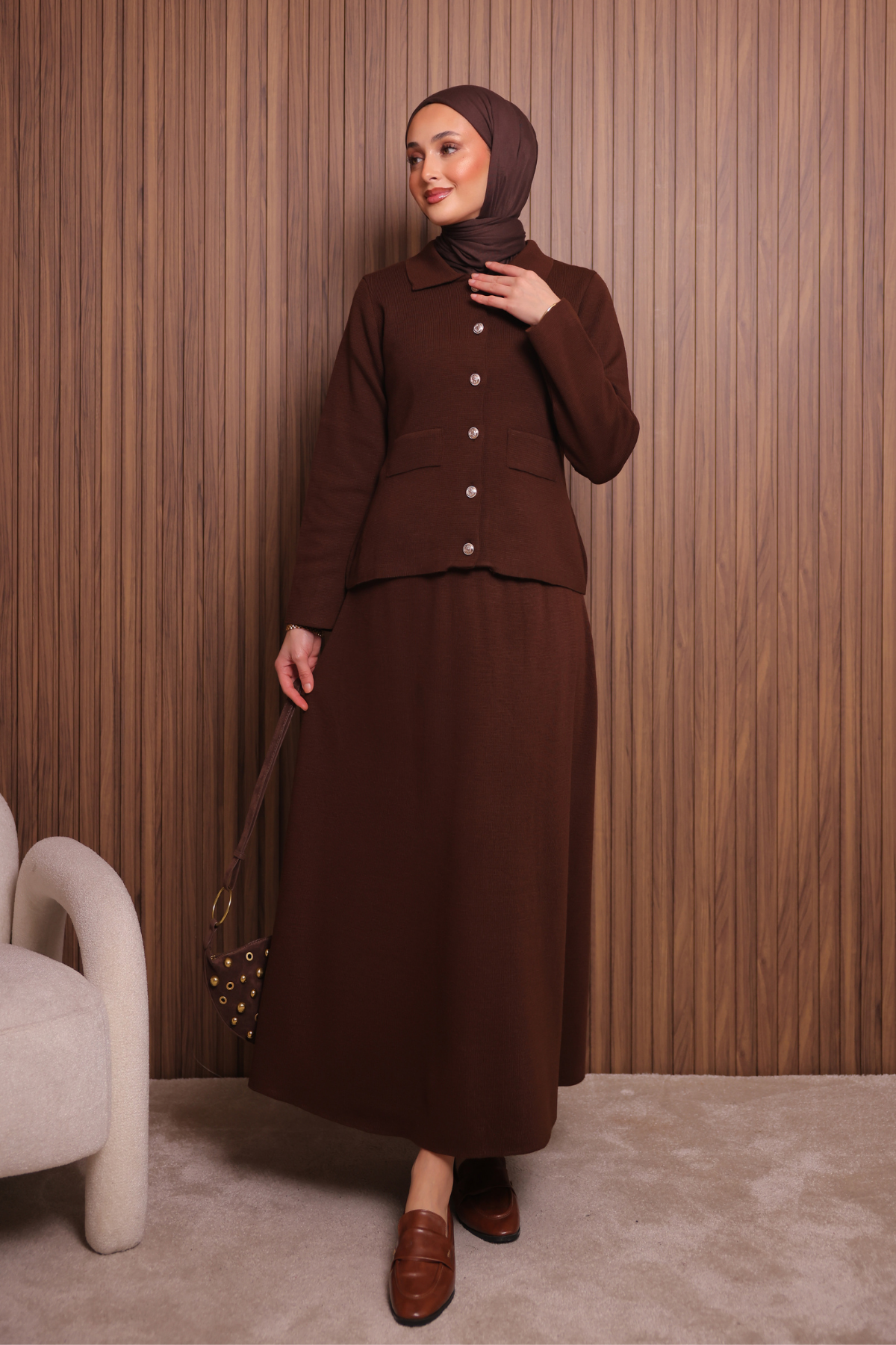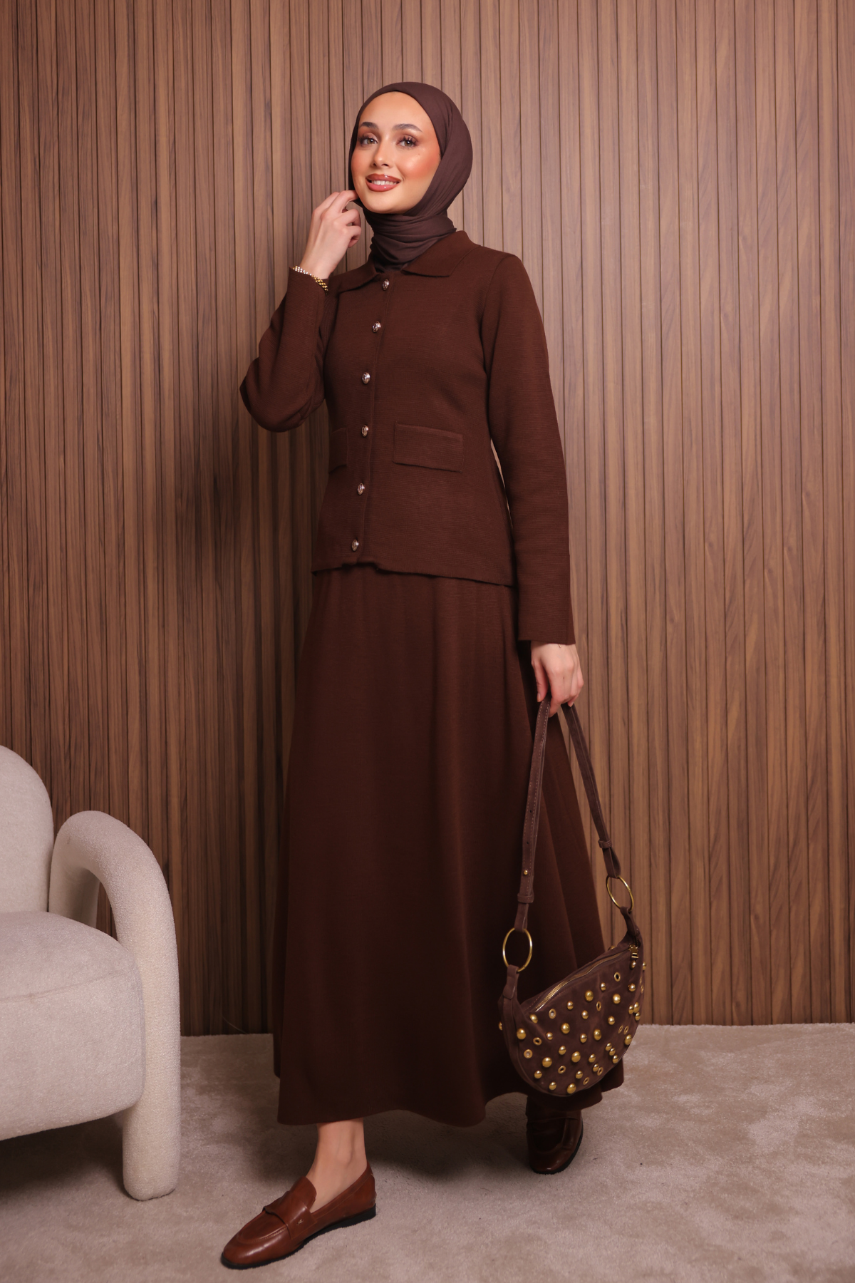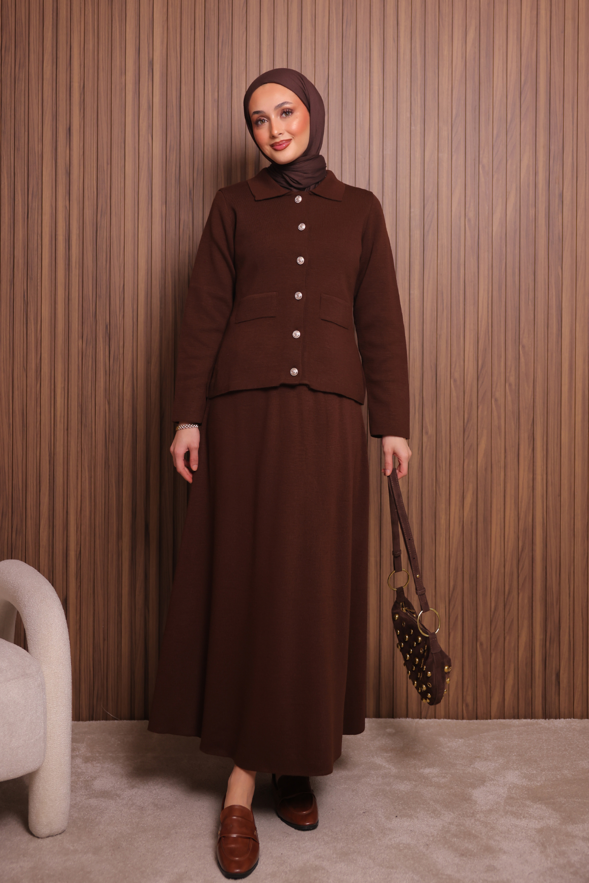 Balenbi Kadın Sık Örgü Polo Yaka Hırkalı Etekli Tesettür Triko Takım 1151 Standart - Kahverengi