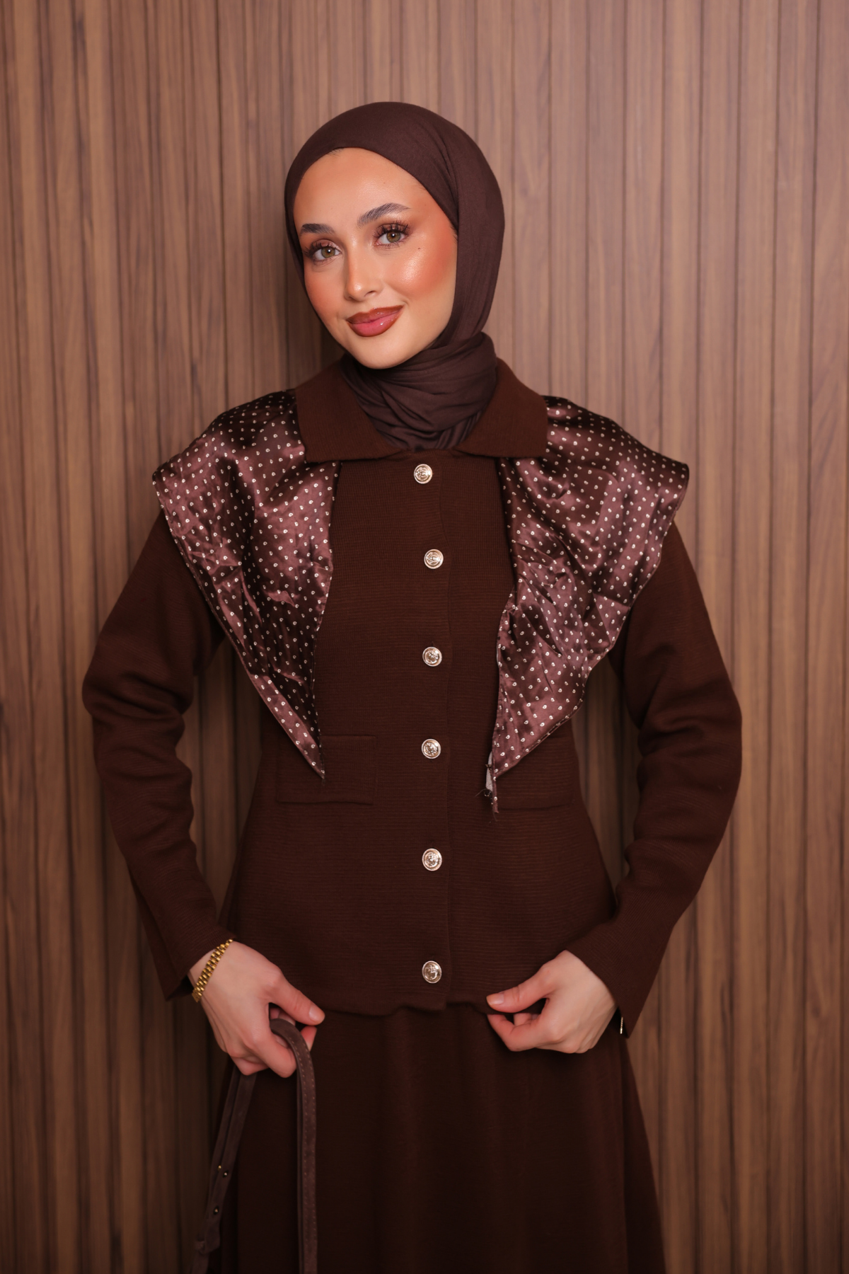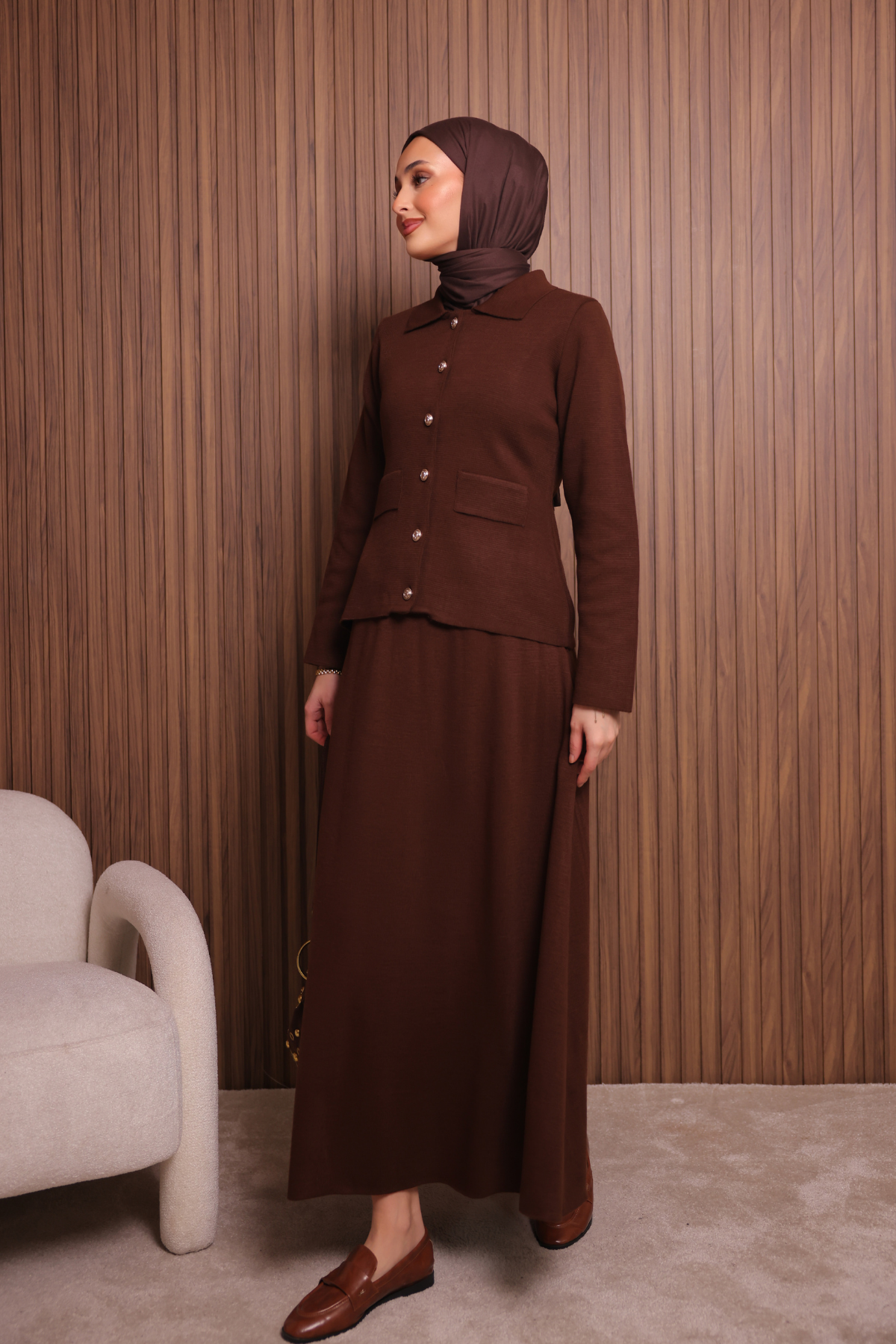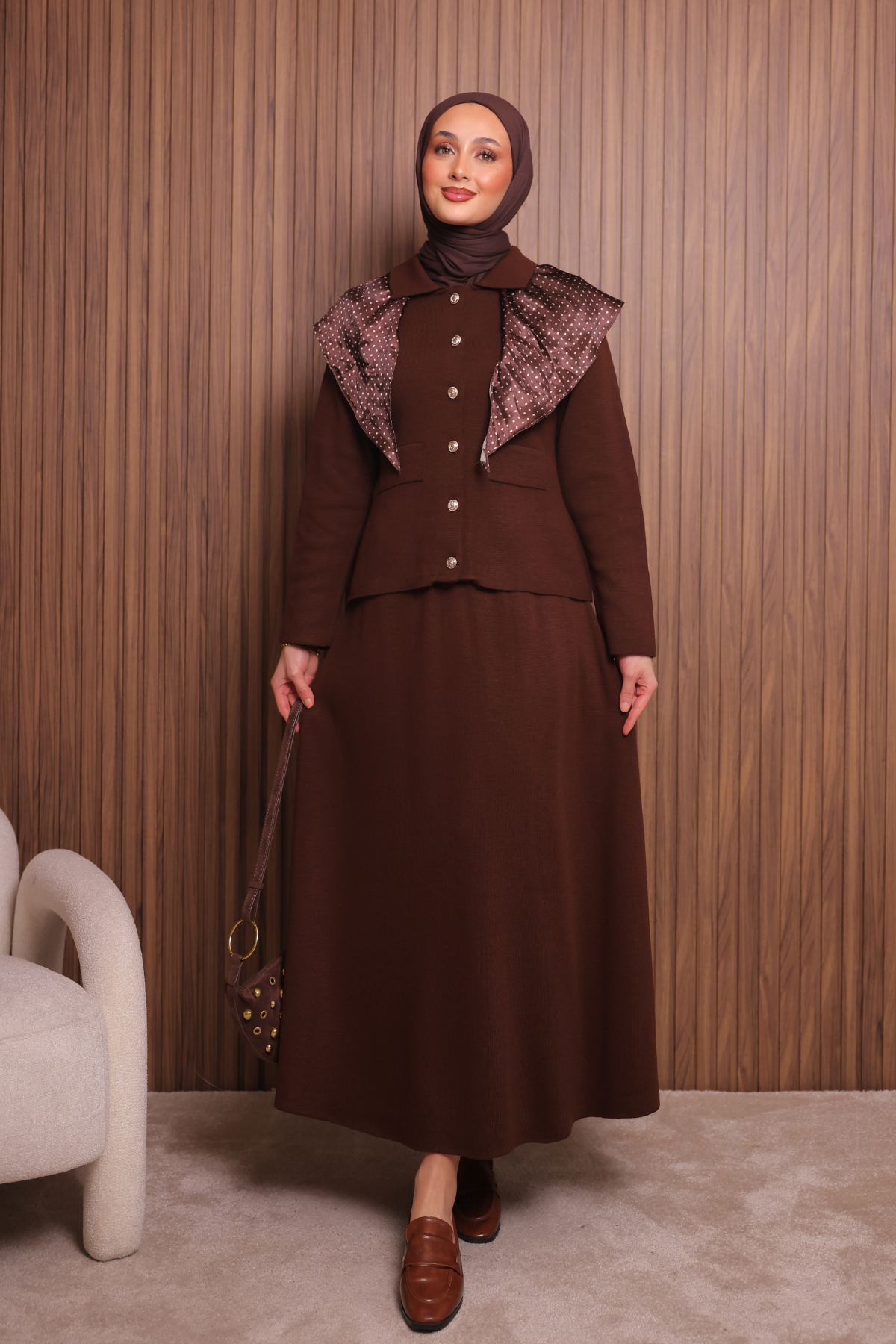 Balenbi Kadın Sık Örgü Polo Yaka Hırkalı Etekli Tesettür Triko Takım 1151 Standart - Kahverengi