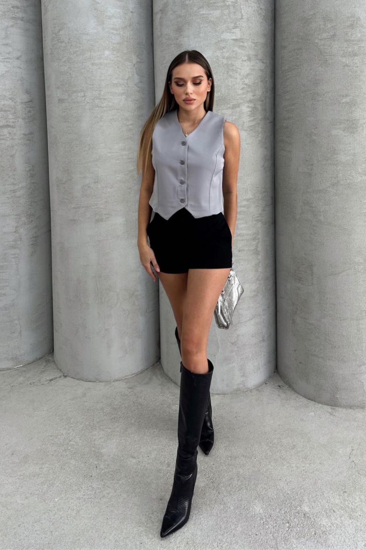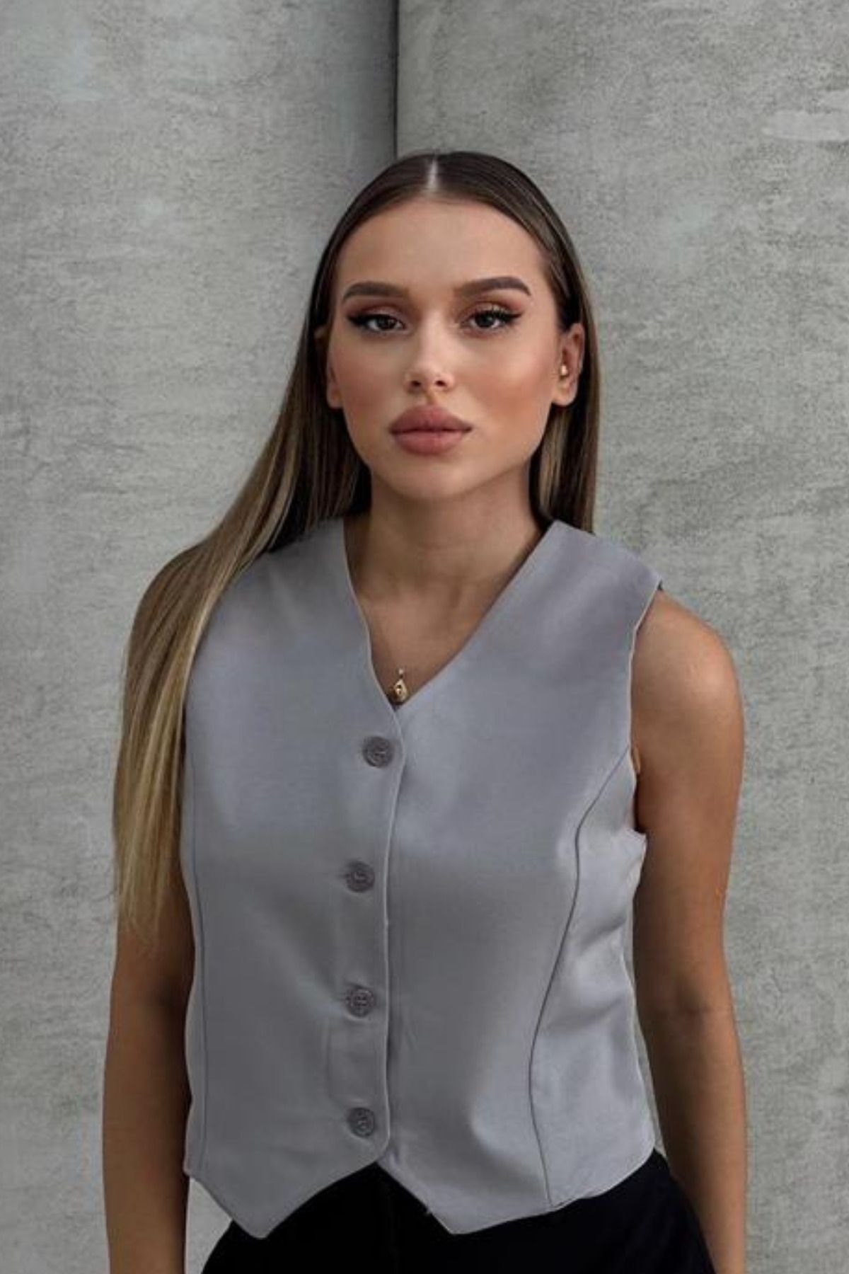 Balenbi Kadın V Yaka Kısa Double Krep Dokuma Yelek 1088 S - Gri