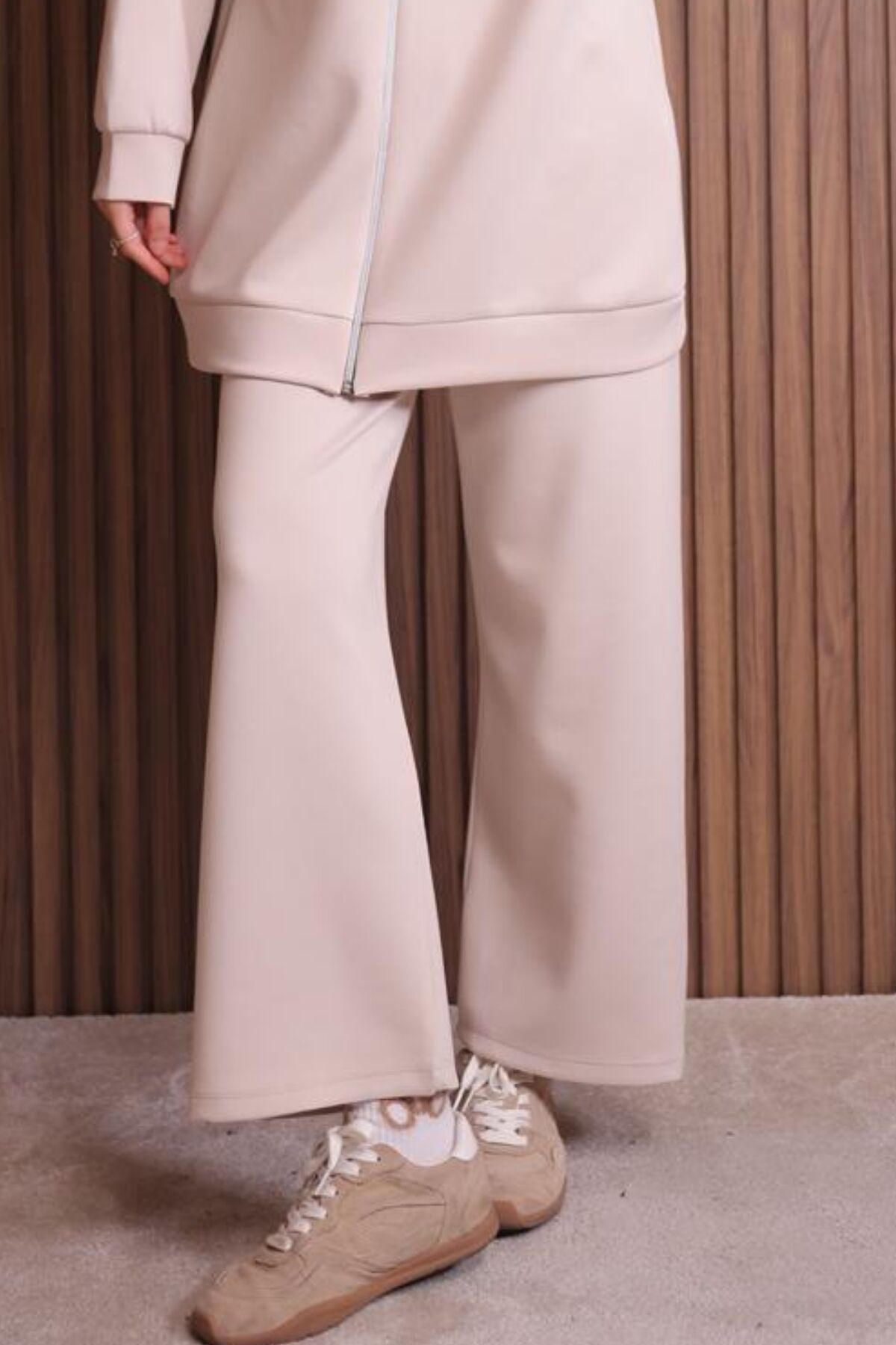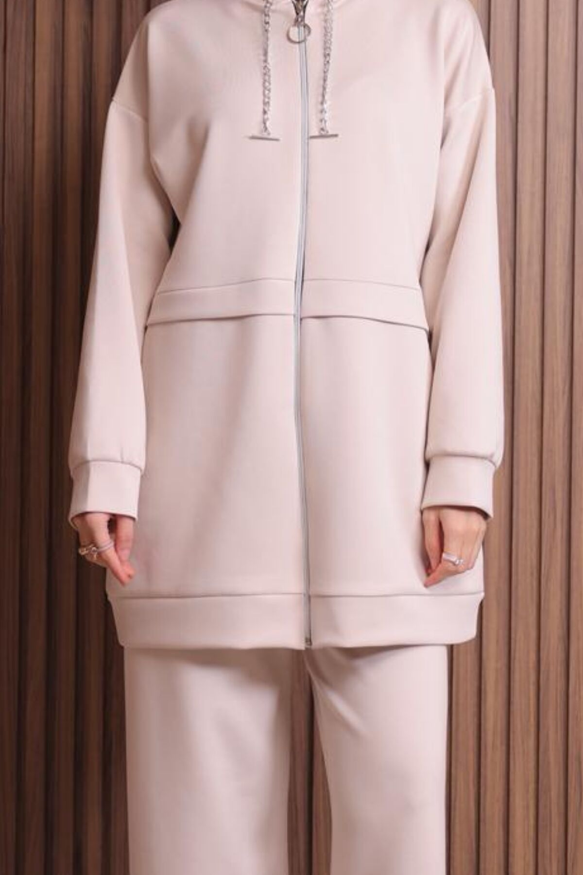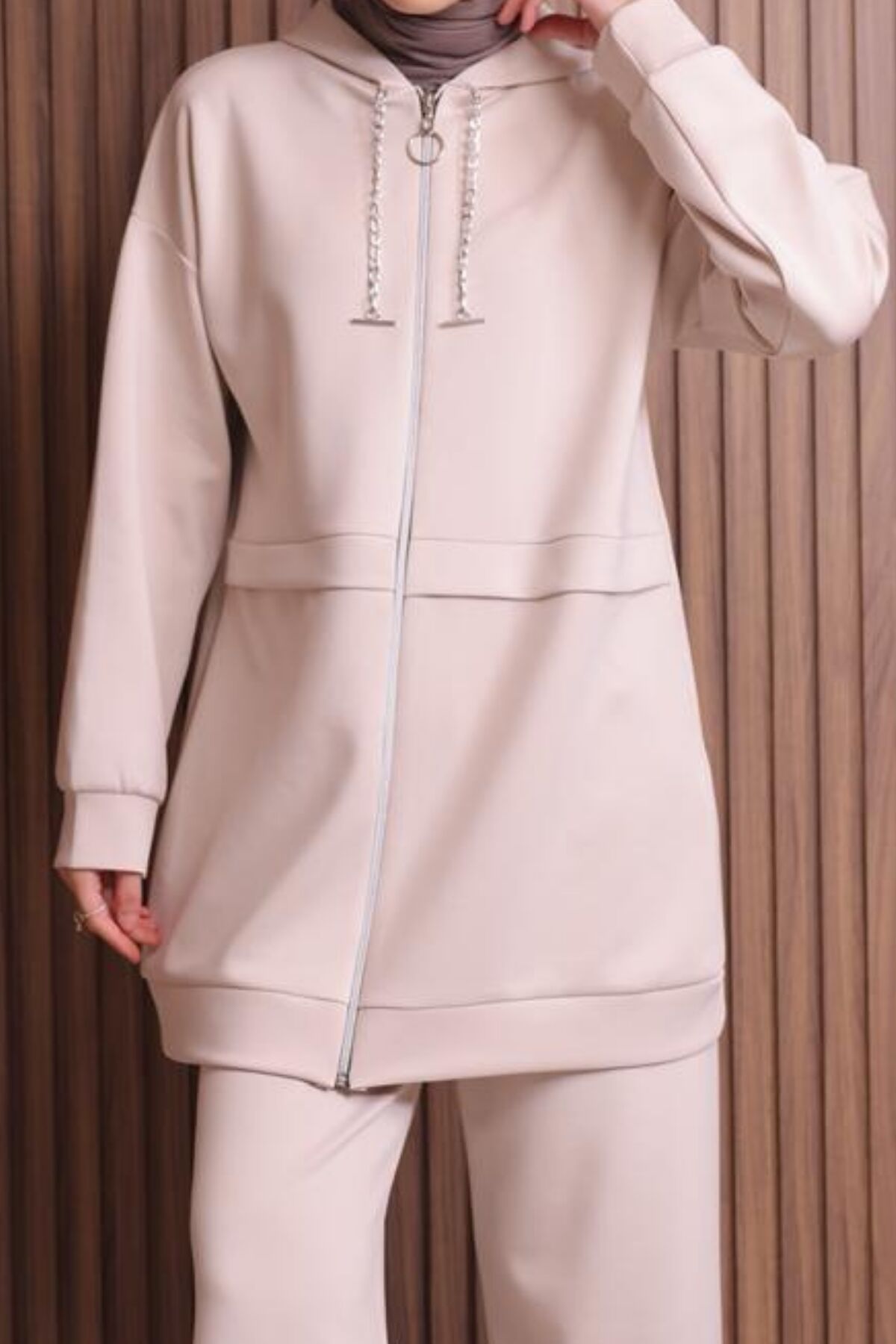 Balenbi Kadın Zincir Kordonlu Kapüşonlu İthal Scuba Tesettür Takım 1121 - Kadınlar için özel olarak tasarlanmış, tesettür giyim tarzına uygun kapüşonlu scuba kumaştan üretilmiş tunik ve pantolonlu takım.; - Menşei Türkiye olan bu takım, yerli üretim kalitesiyle öne çıkıyor.; - Örme kumaş tipi sayesinde esnek ve konforlu bir kullanım sunar.; - Uzun boy tasarımı ile hem şıklığı hem de rahatlığı bir arada sağlar.; - Regular kalıp ile vücut hatlarını saran ancak sıkmayan bir yapıya sahiptir.; - Yetişkin yaş grubuna hitap eden bu takım, her bedene uygun seçenekler sunar.; - Kapüşonlu yaka tipi ile soğuk havalarda ekstra koruma ve stil sahibi görünüm kazandırır.; - Kutu içerisinde gönderilmez; ambalajsız olarak teslim edilir.; - Bej rengiyle zamansız bir şıklık ve kolay kombinlenebilirlik sunar.; - Beli lastikli silueti sayesinde gün boyu rahat hareket etme imkanı tanır.; - Basic koleksiyonun parçası olarak günlük kullanım için idealdir.; - Geniş paça tasarımı modern ve rahat bir görünüm sağlar.