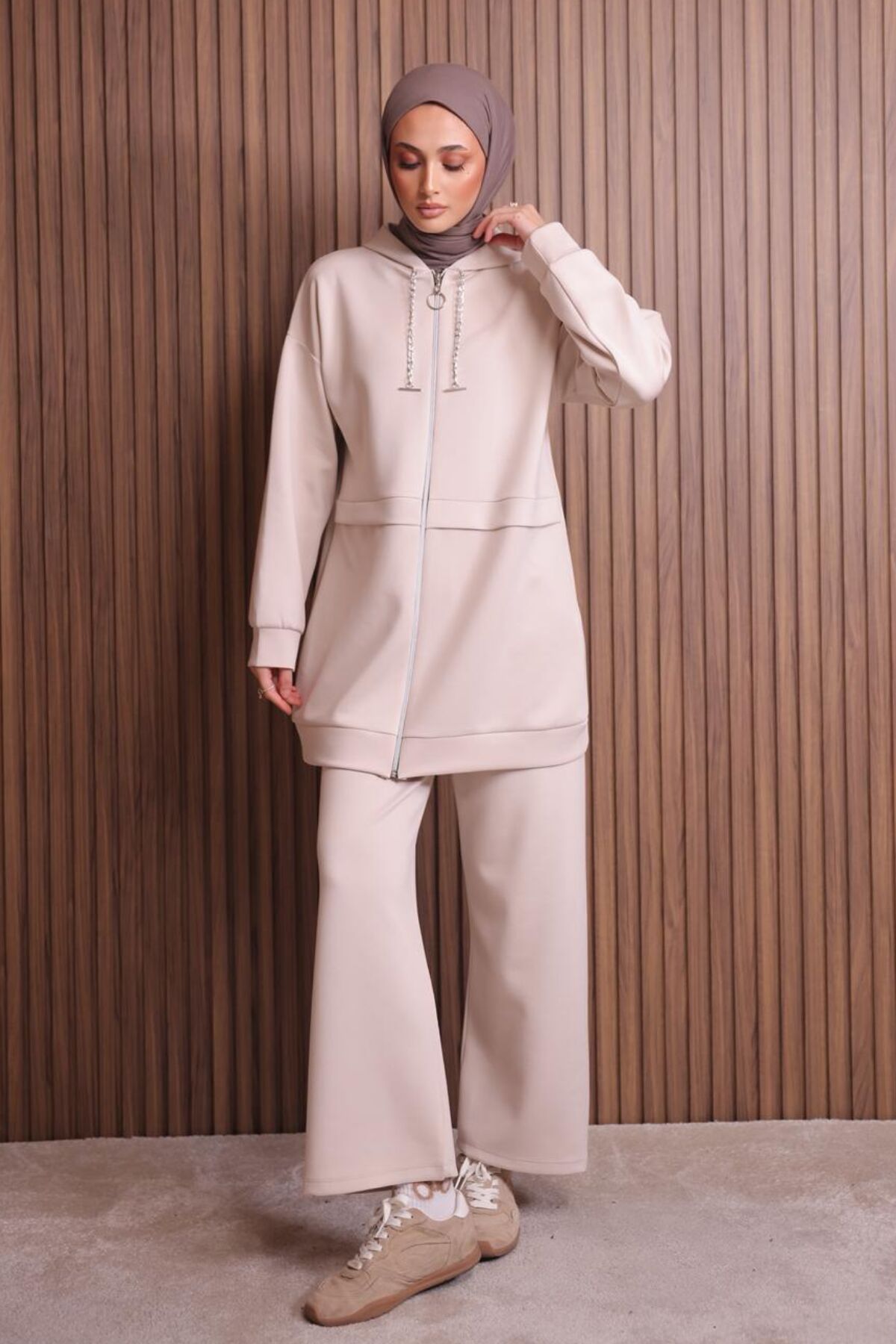 Balenbi Kadın Zincir Kordonlu Kapüşonlu İthal Scuba Tesettür Takım 1121 XL - Bej