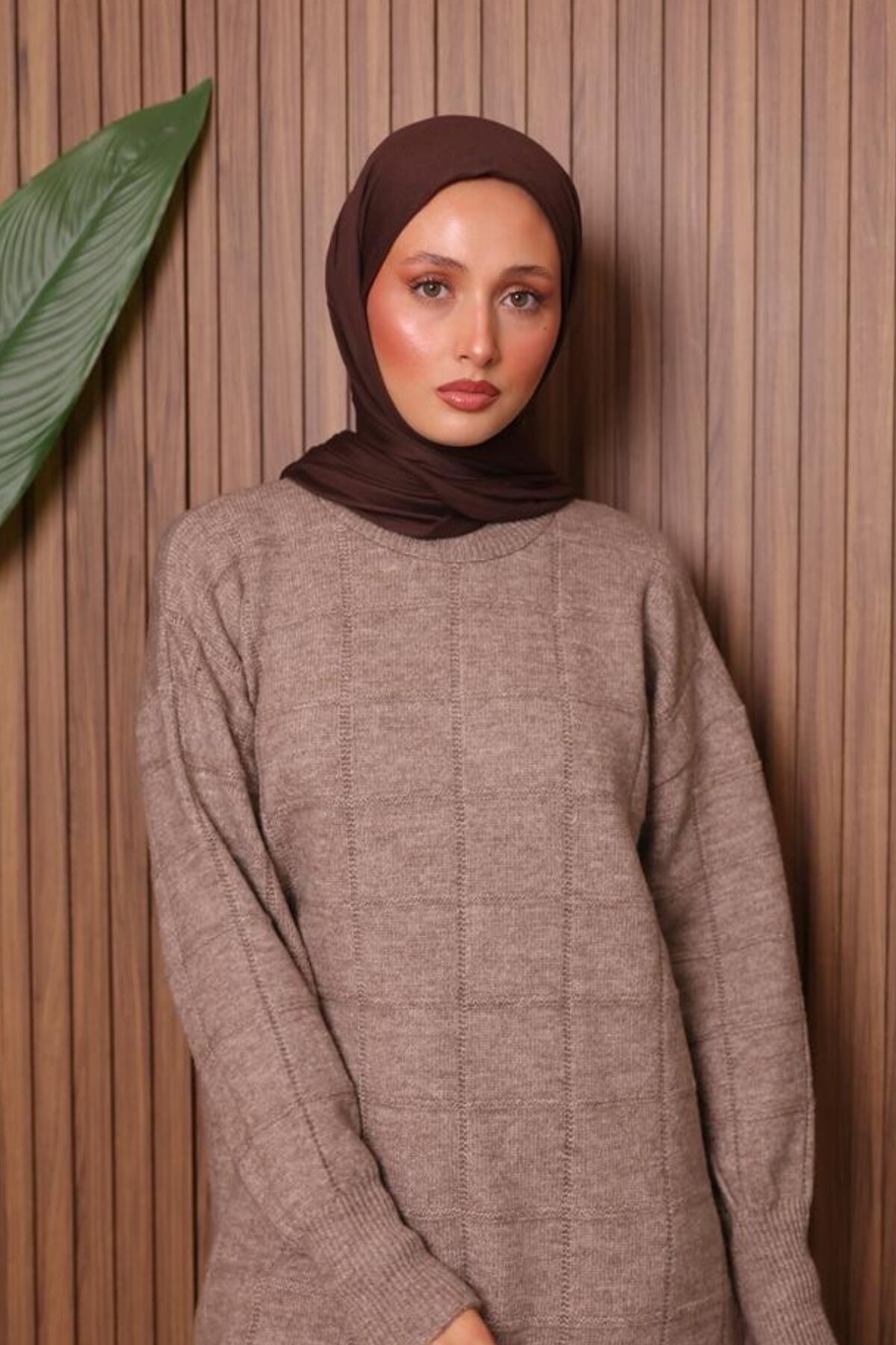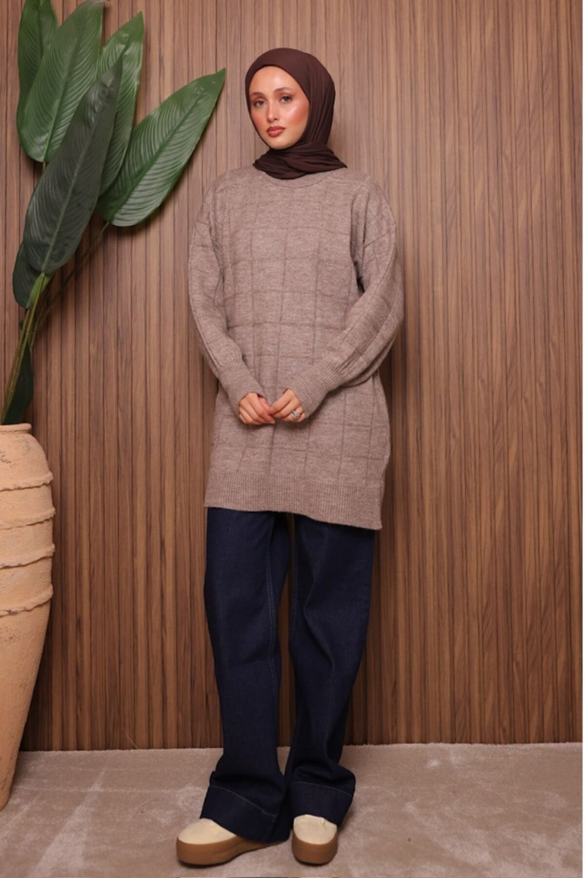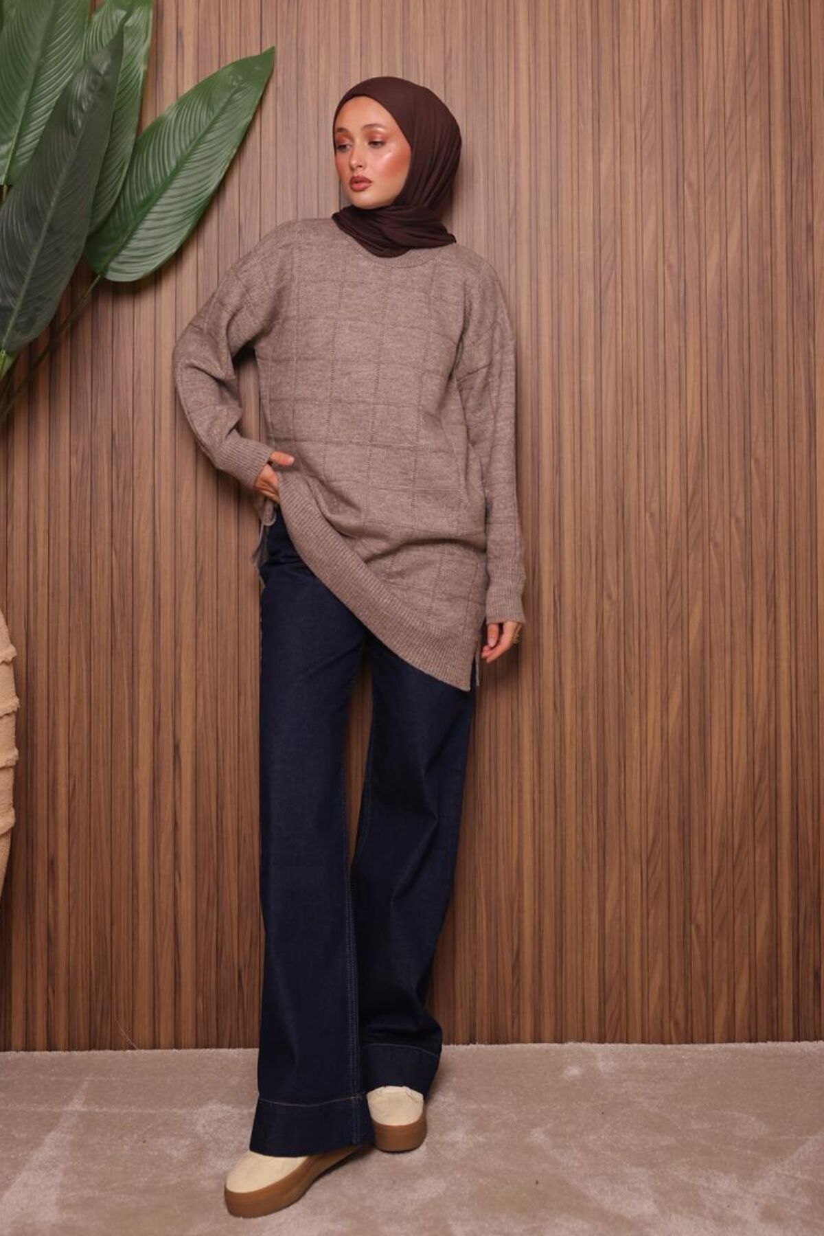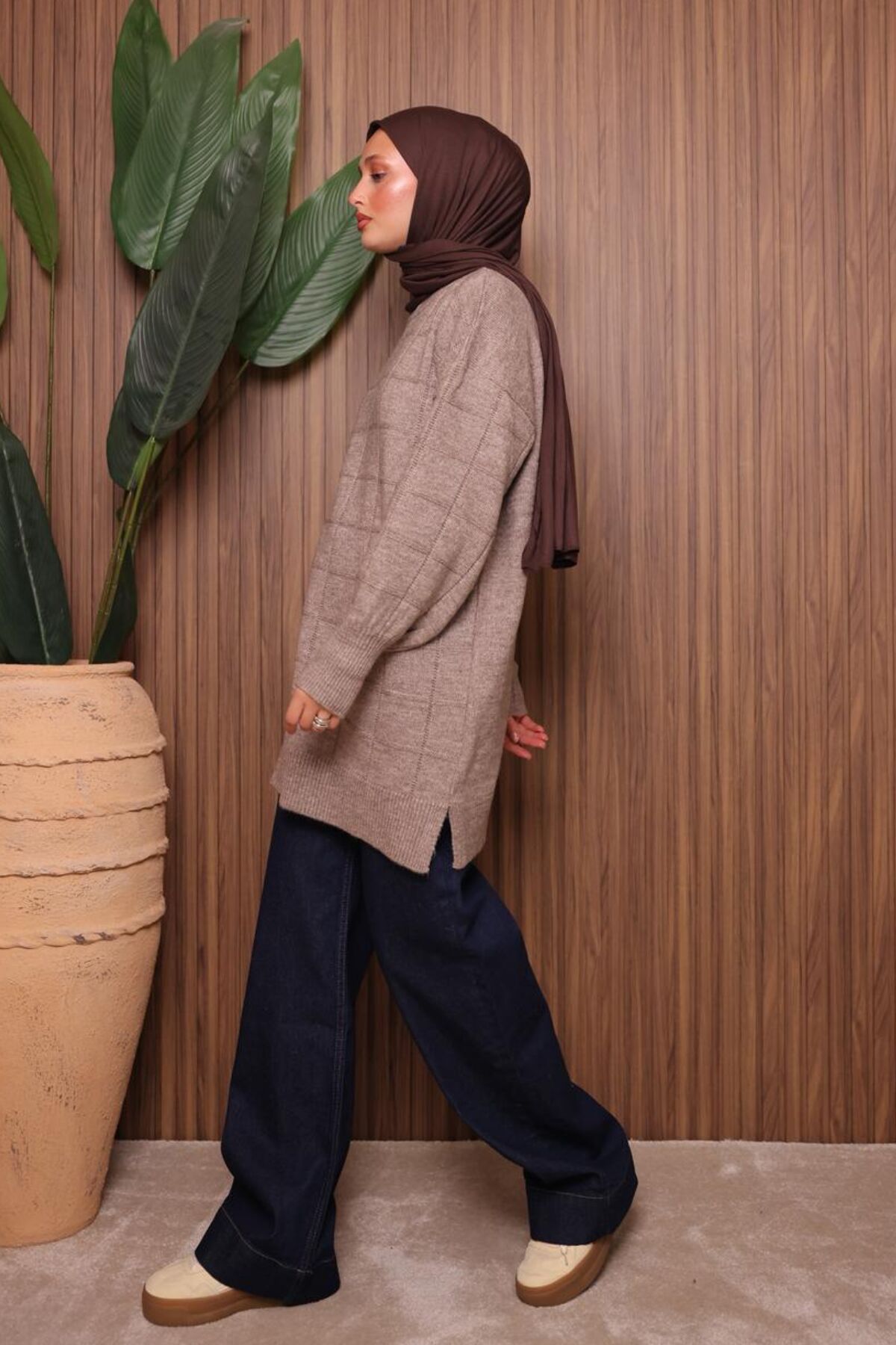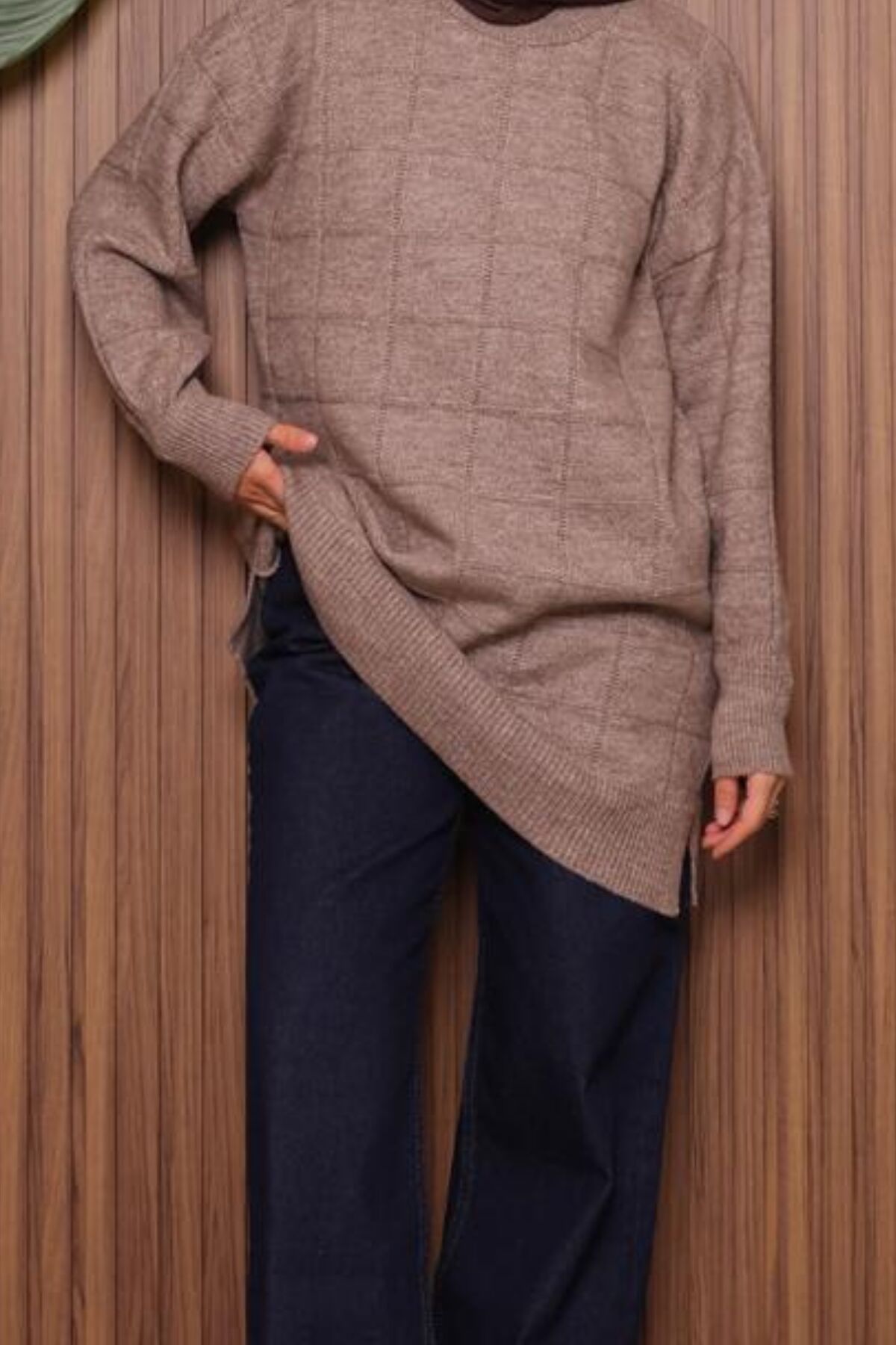Balenbi Kare Dokulu Oversize Yumoş Tesettür Triko Tunik 7012 Standart - Toprak